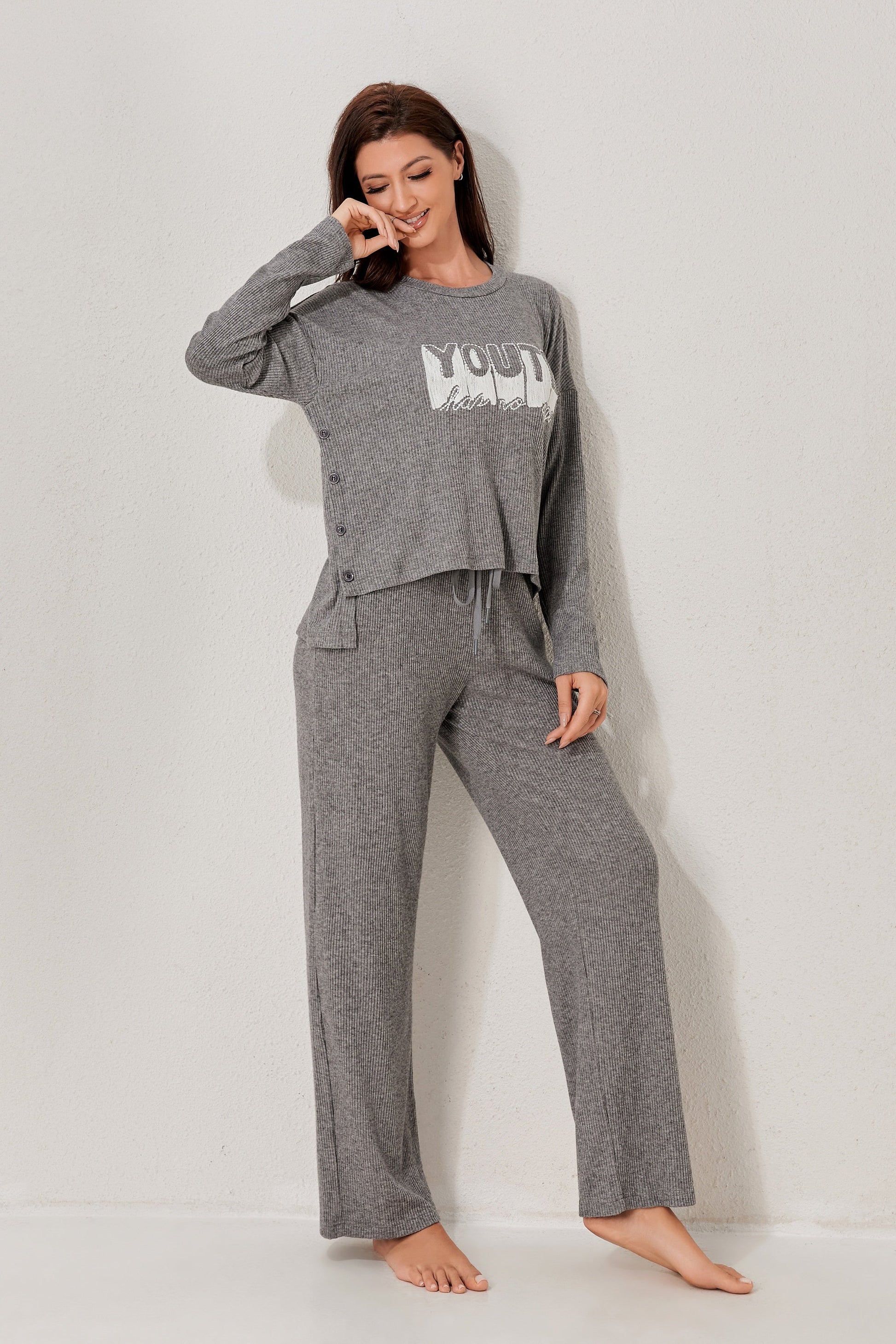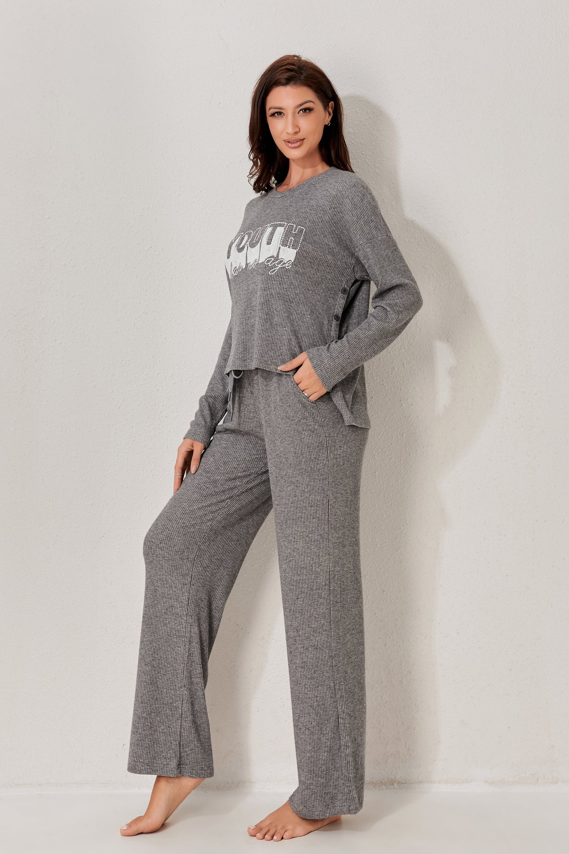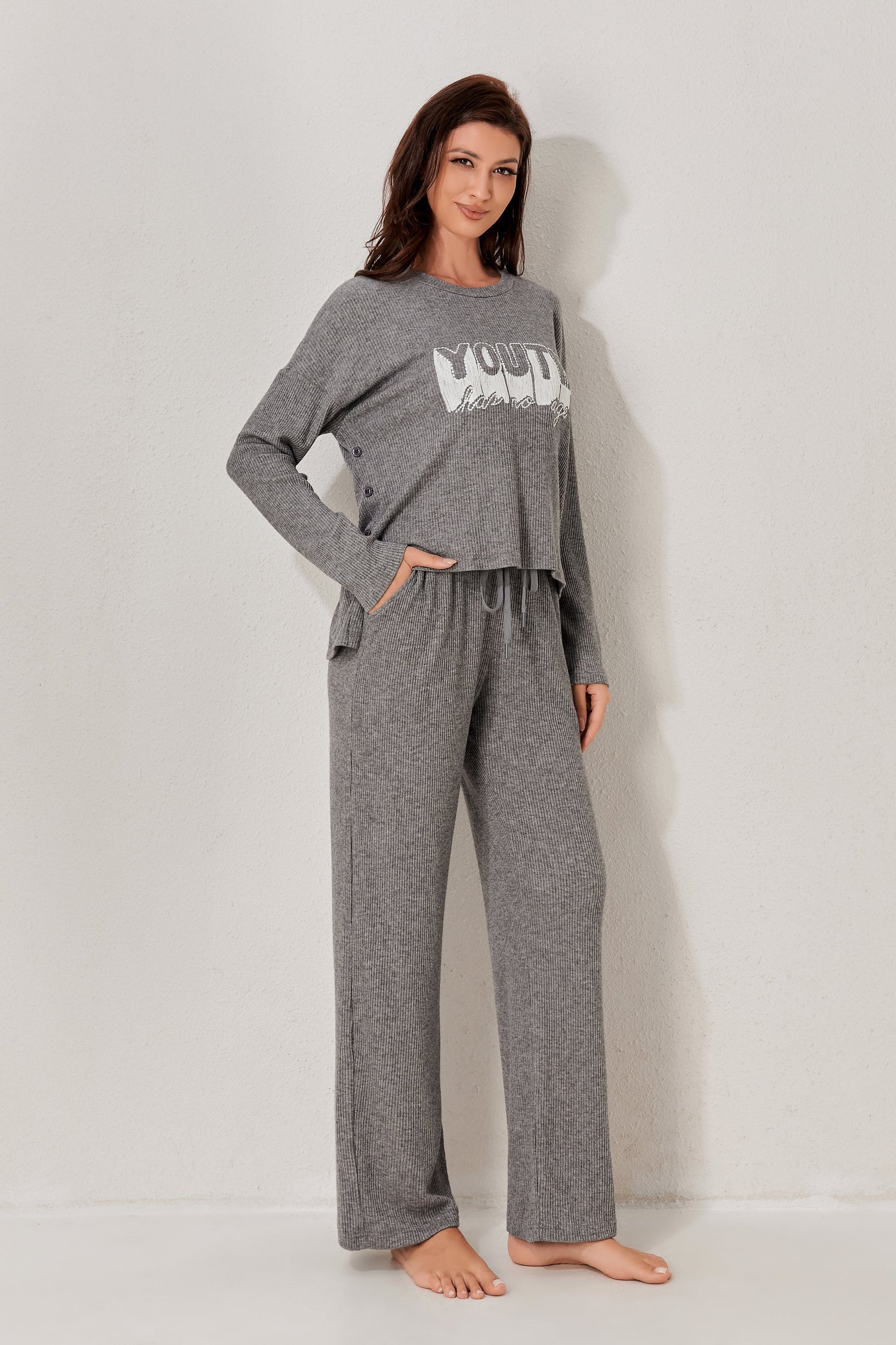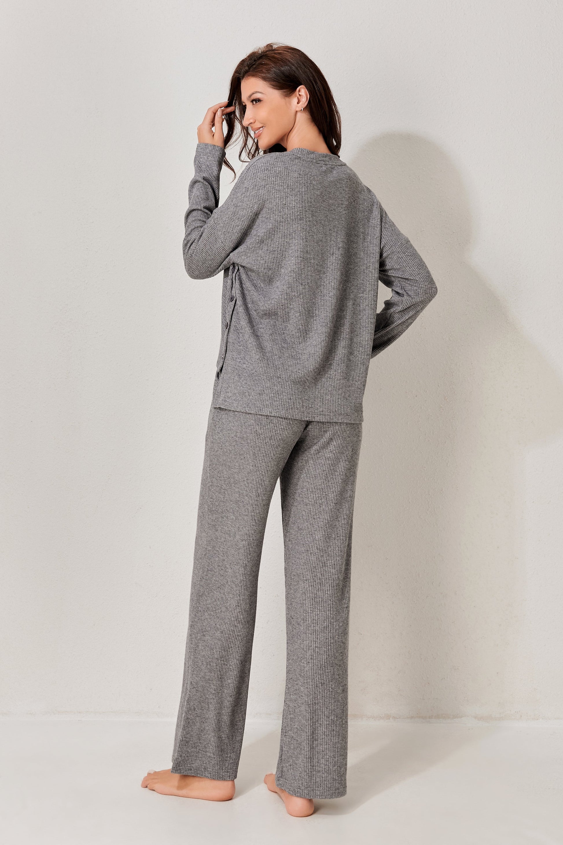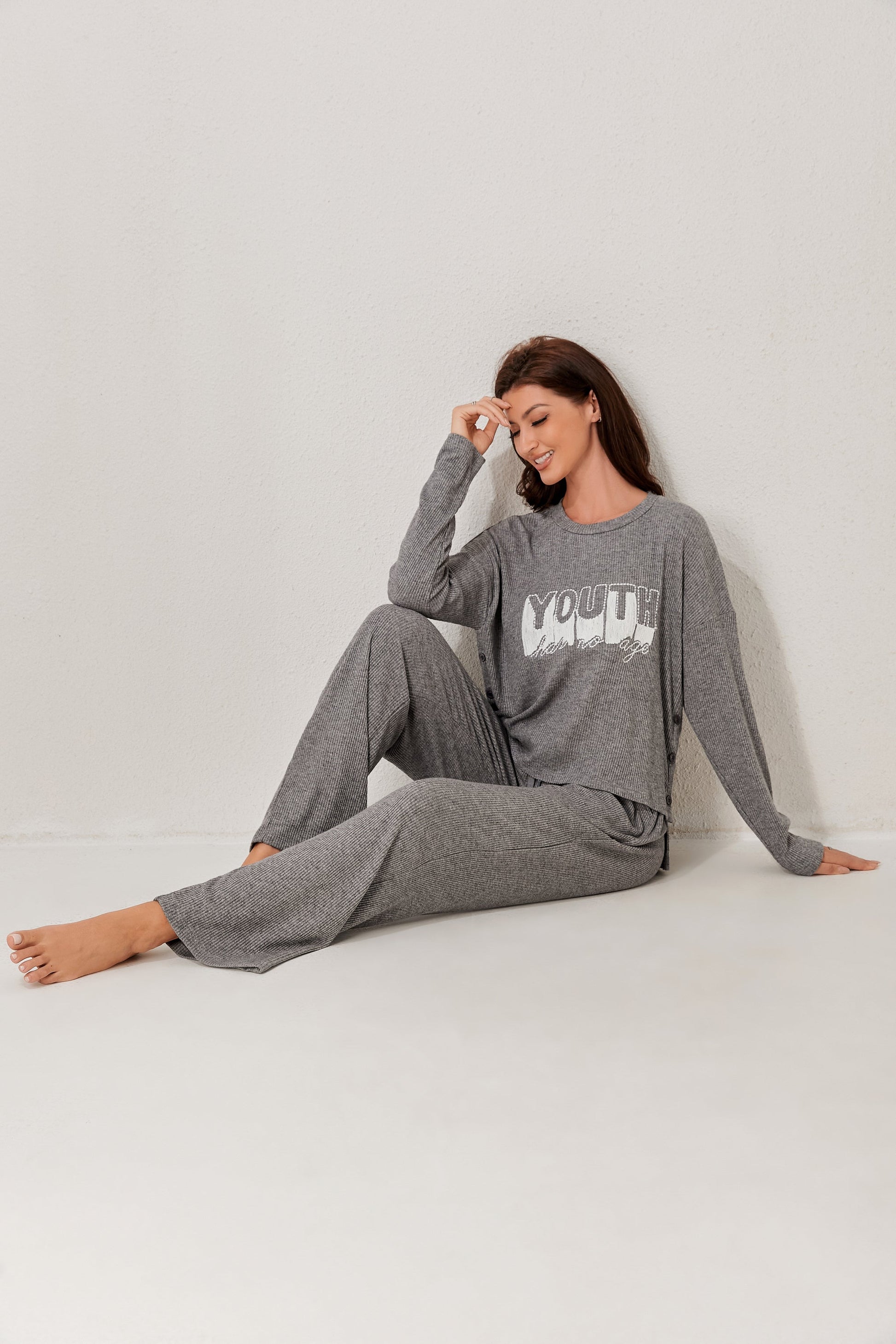 مجموعة بيجامة طويلة الأكمام مع صورة ظلية مريحة ولون فحم حديث. يتضمن سروالا مريحا. مصنوع من قماش المخزون.