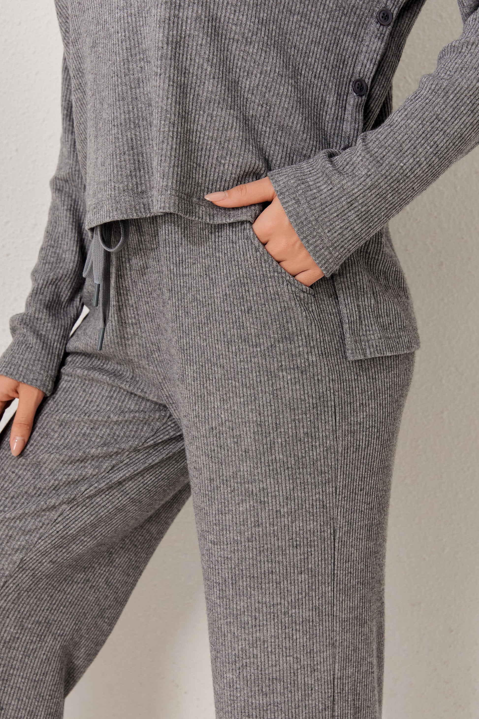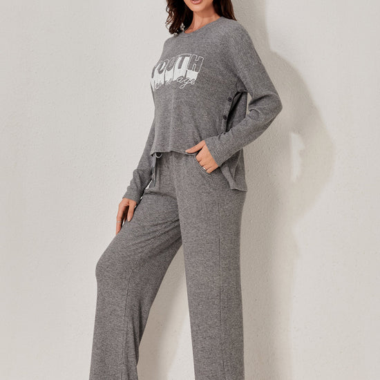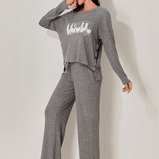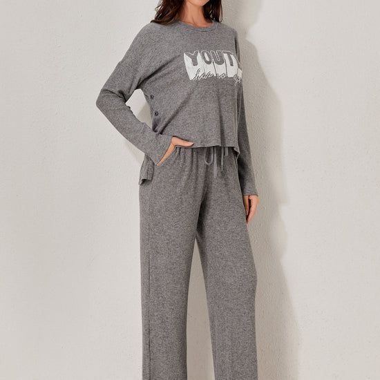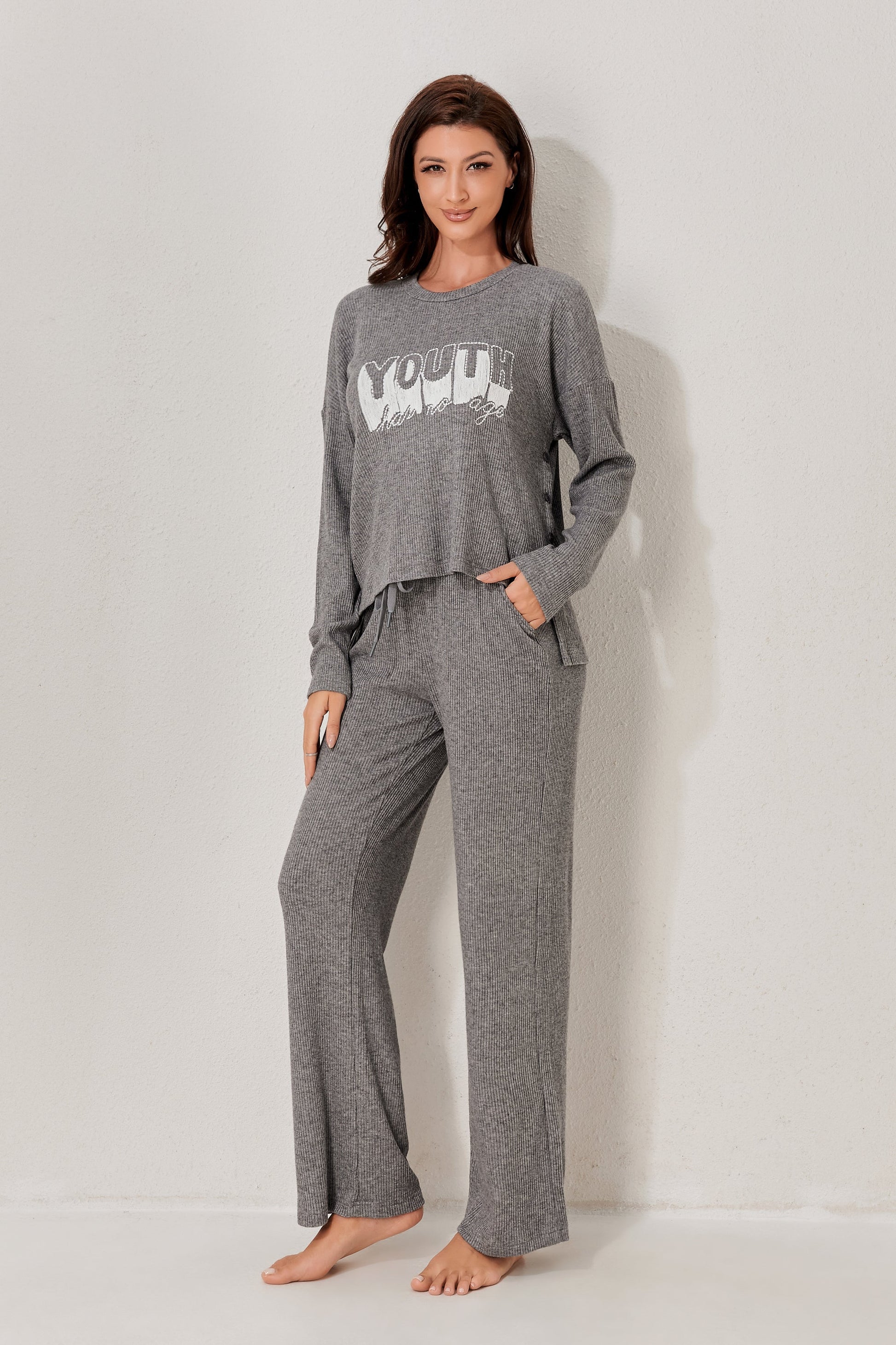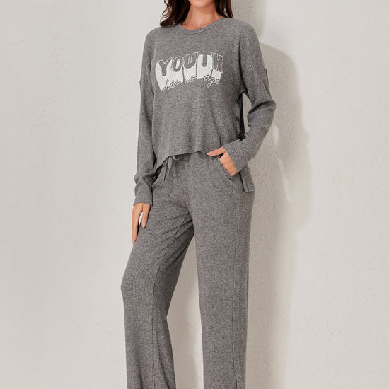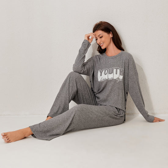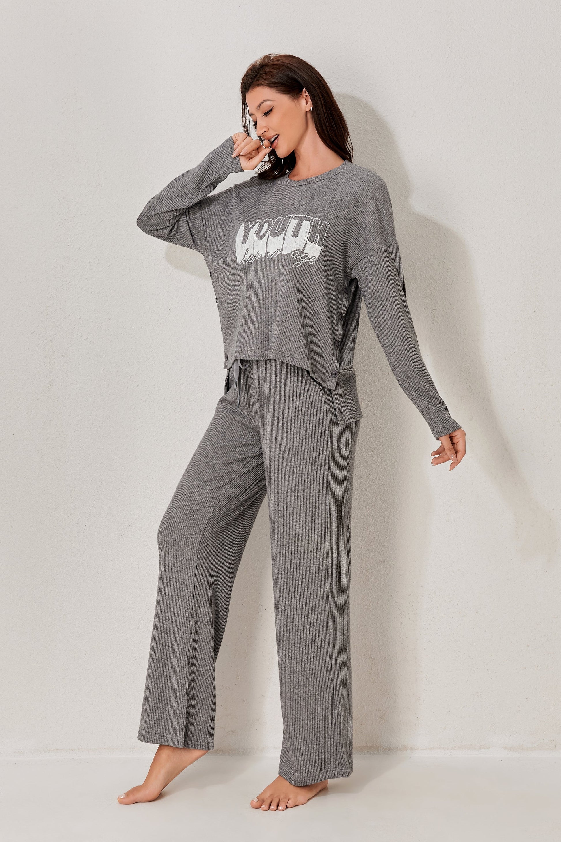 مجموعة بيجامة طويلة الأكمام مع صورة ظلية مريحة ولون فحم حديث. يتضمن سروالا مريحا. مصنوع من قماش المخزون.