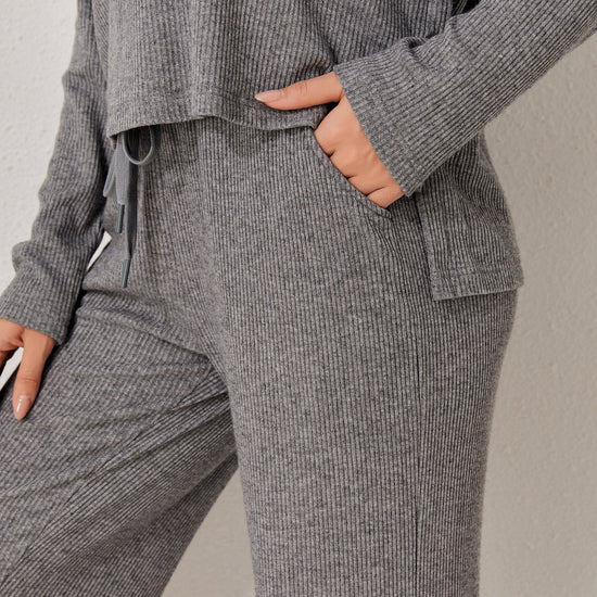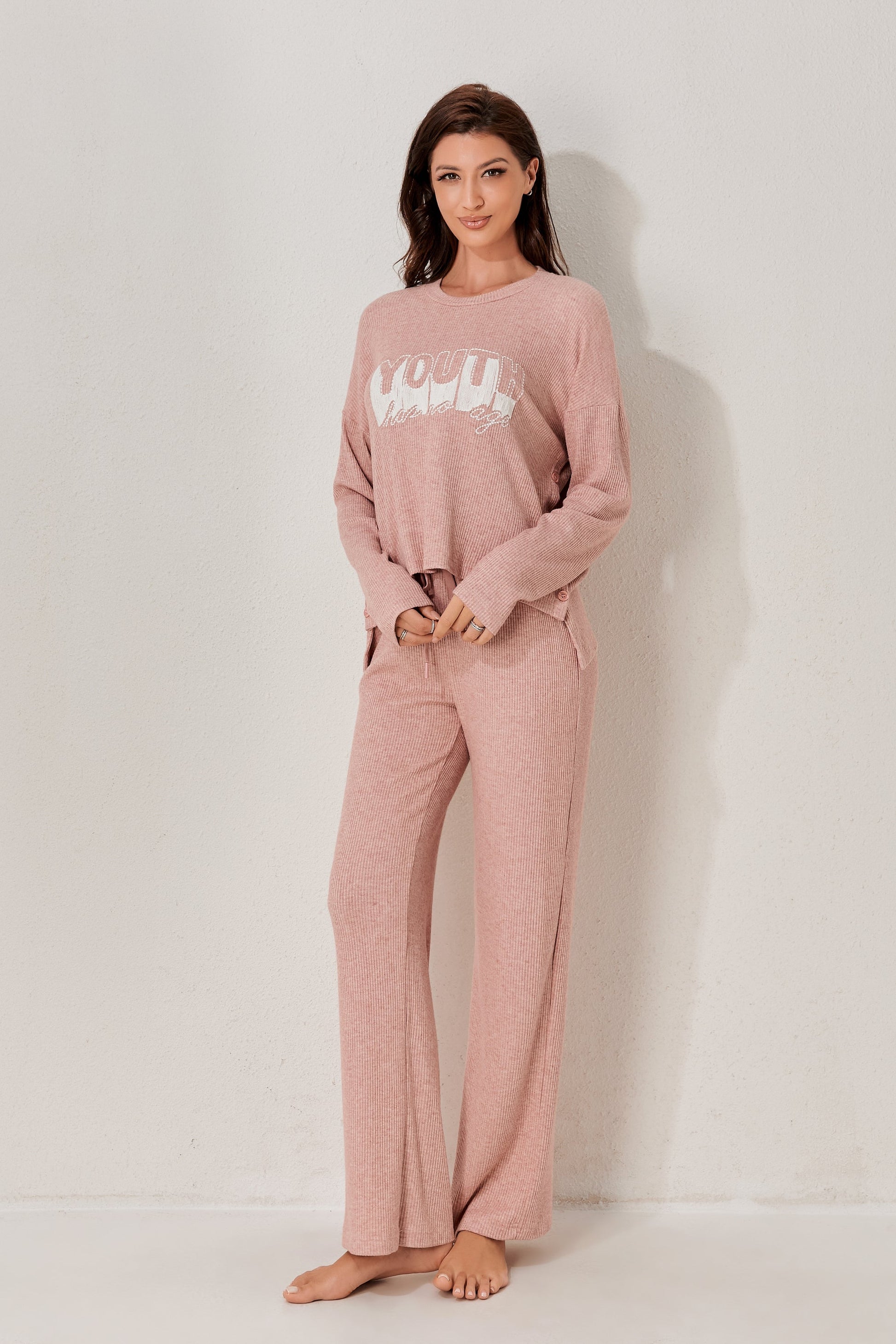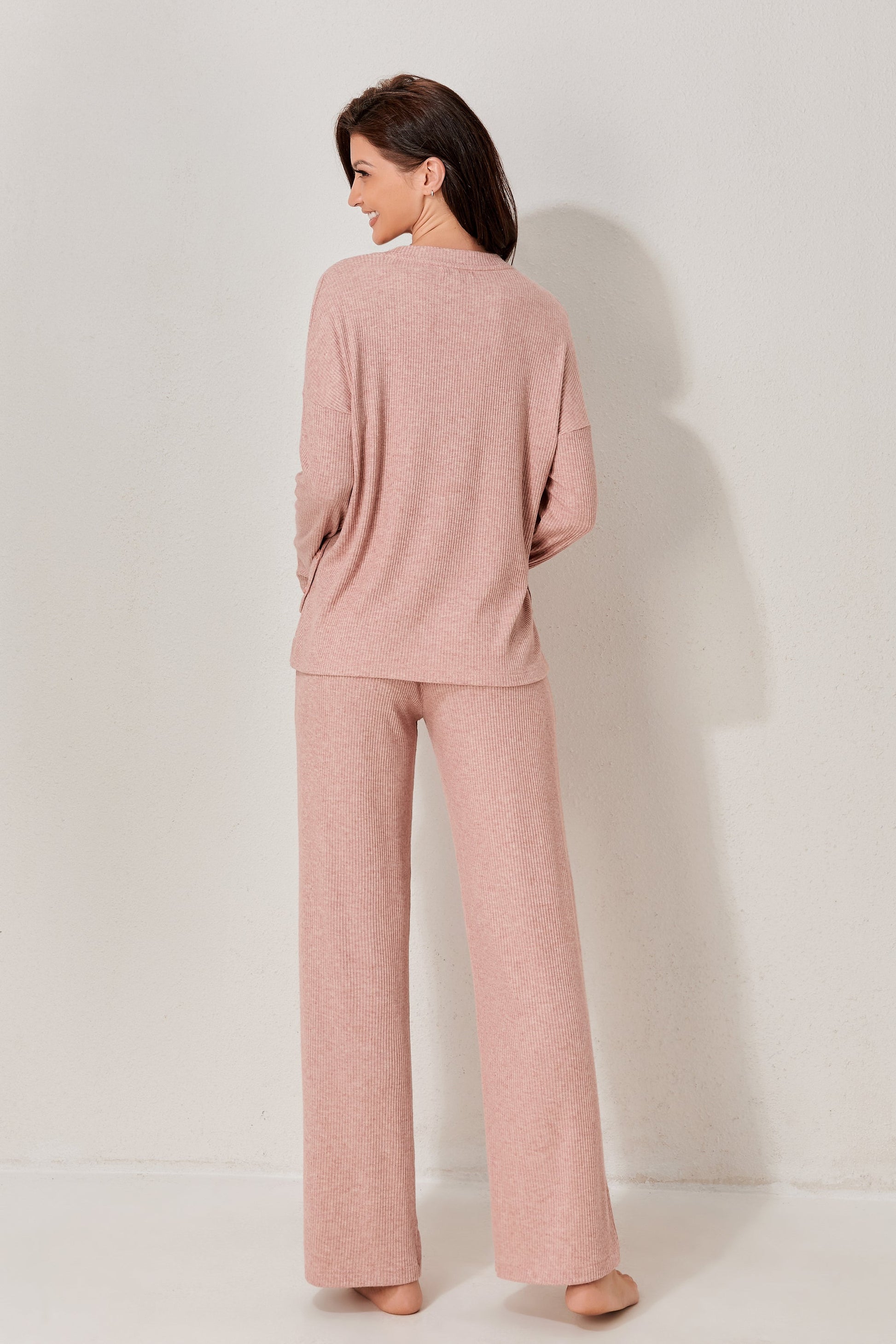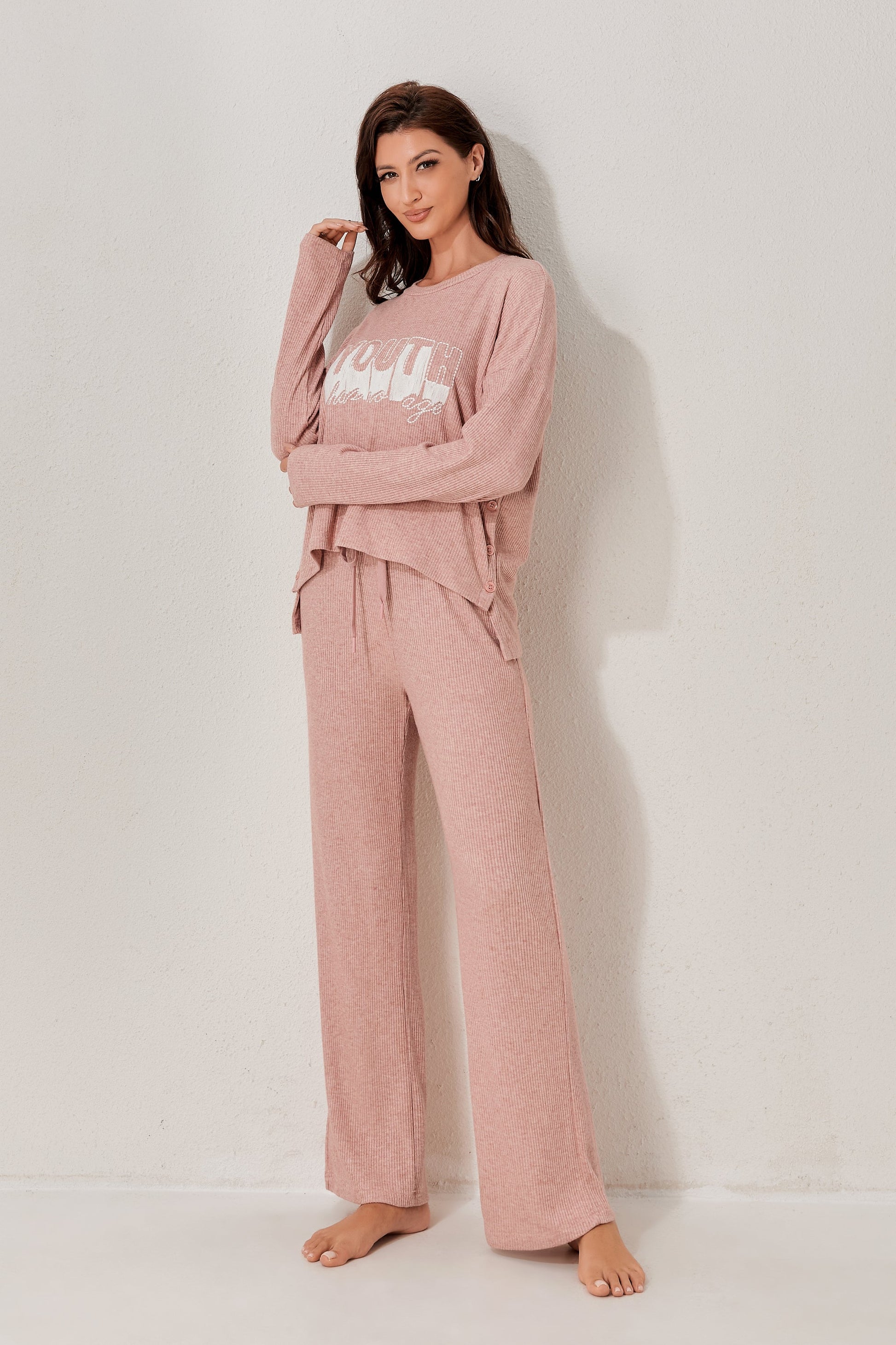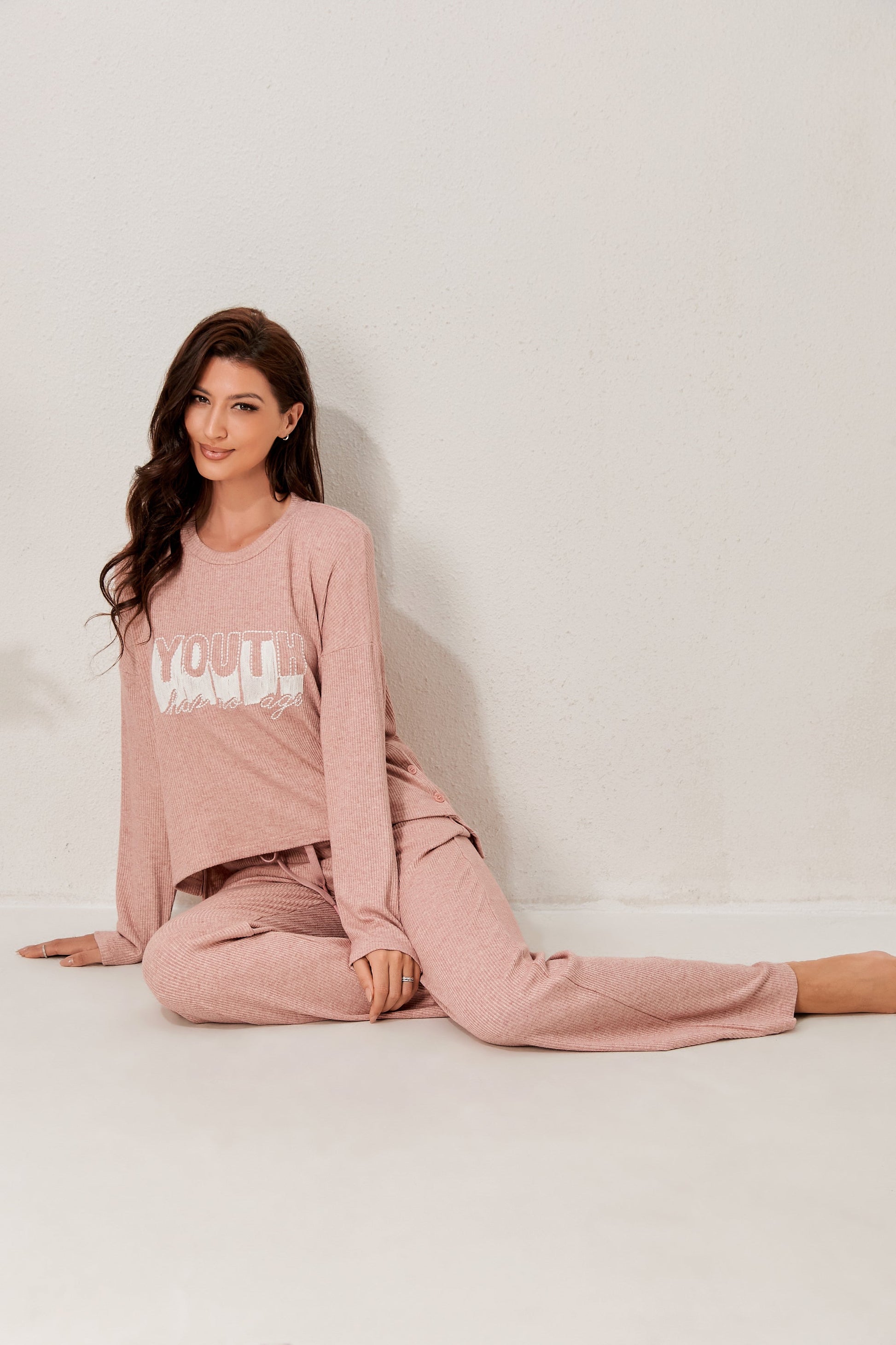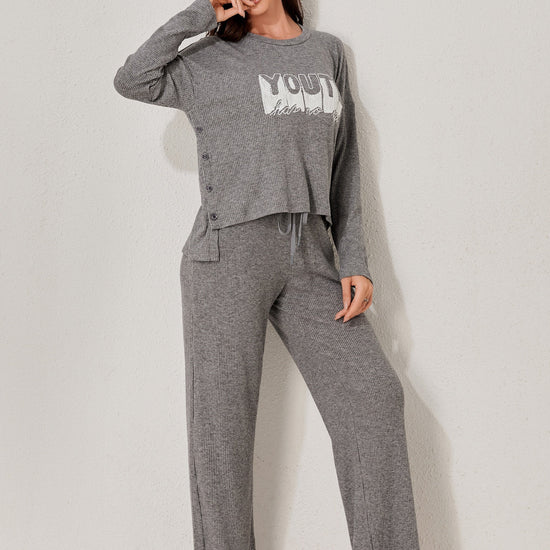 مجموعة بيجامة طويلة الأكمام مع صورة ظلية مريحة ولون فحم حديث. يتضمن سروالا مريحا. مصنوع من قماش المخزون.