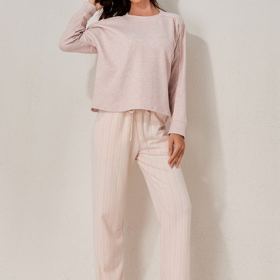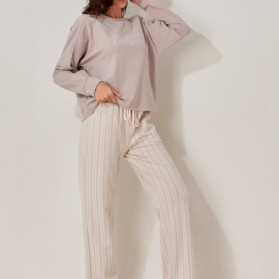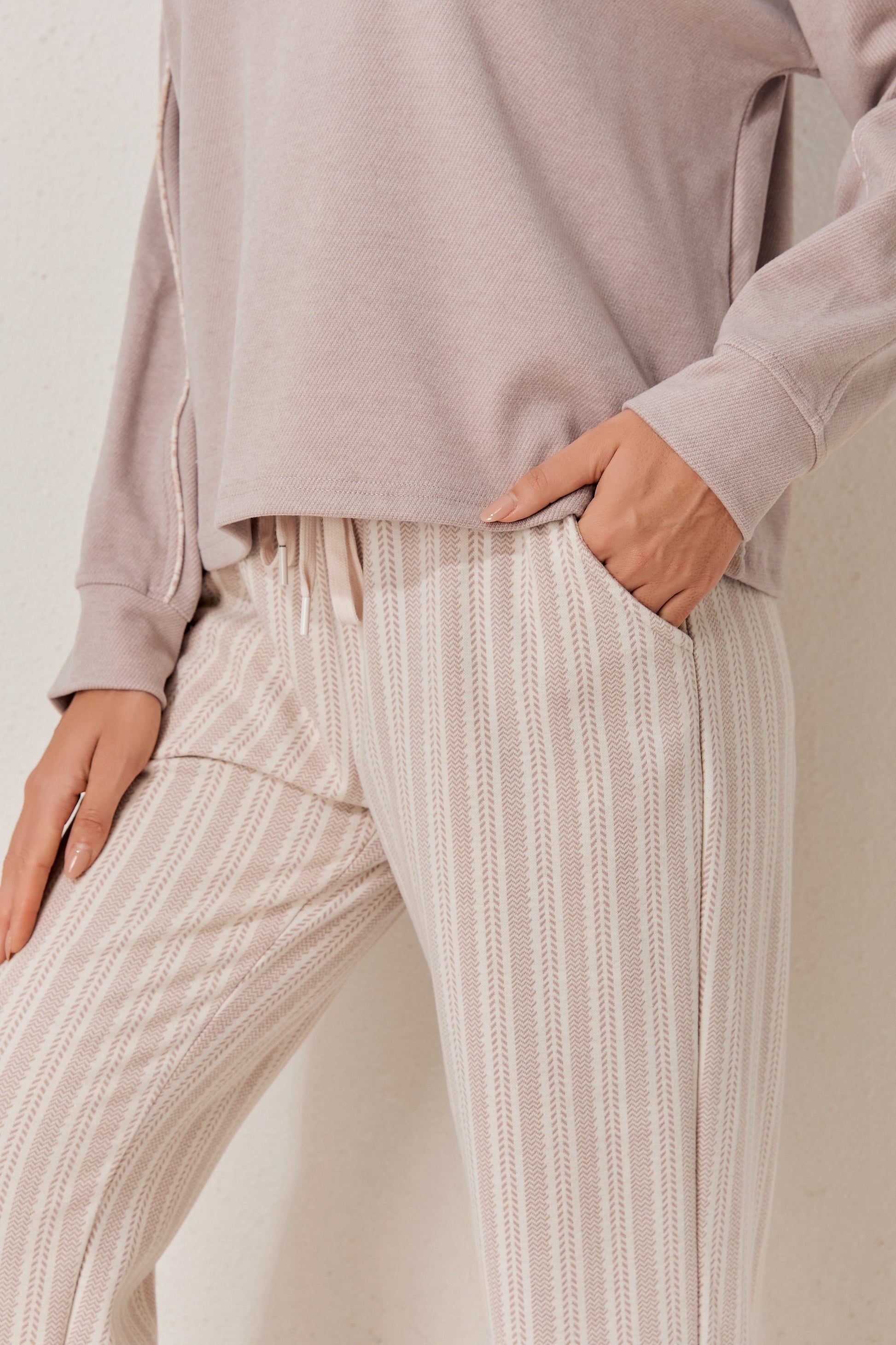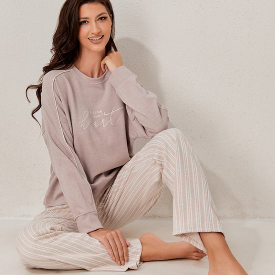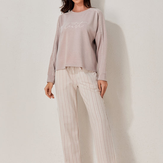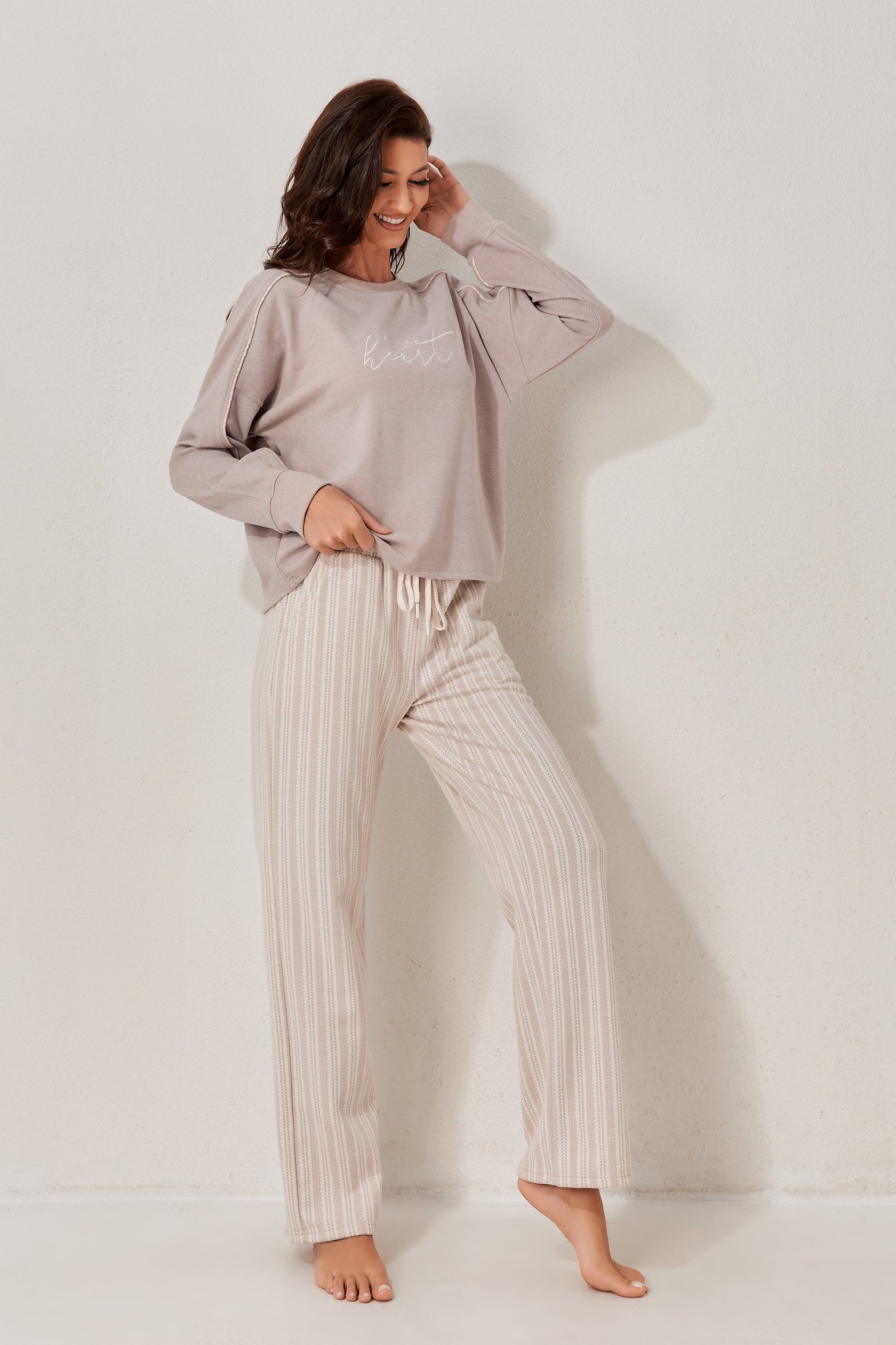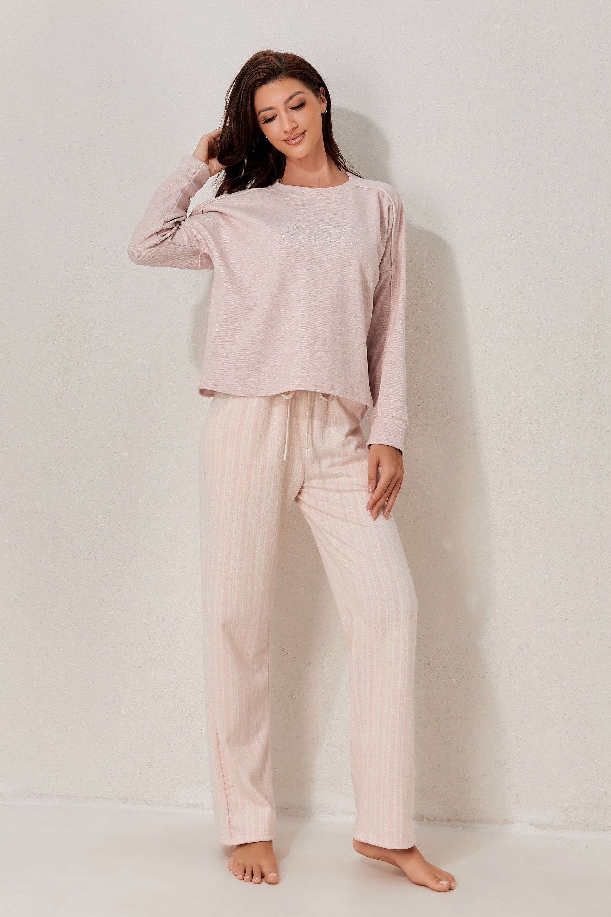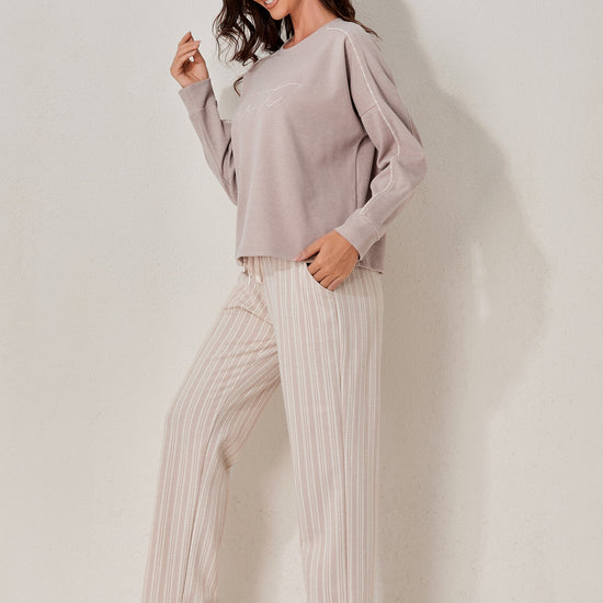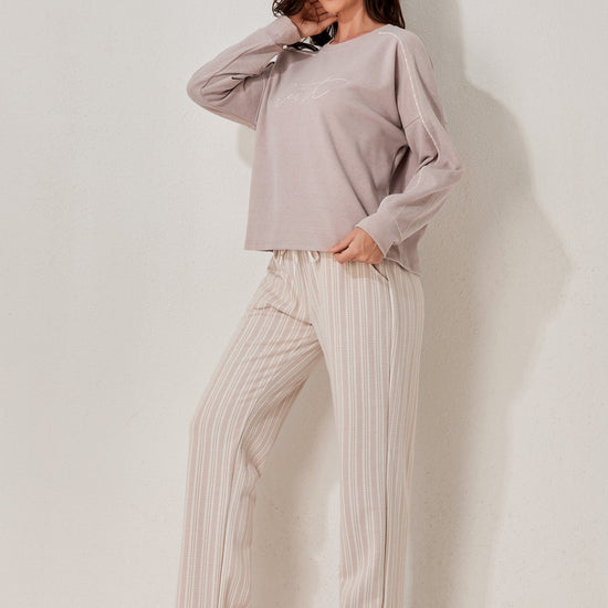 طقم بيجاما حديث مكون من قطعتين يقترن بقميص ناعم بأكمام طويلة مع بنطلون مخطط. مصنوع من قماش ناعم وجاكار، إنه قابل للتنفس وسلس،ومثالي للراحة اليومية الأنيقة.