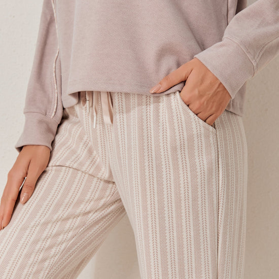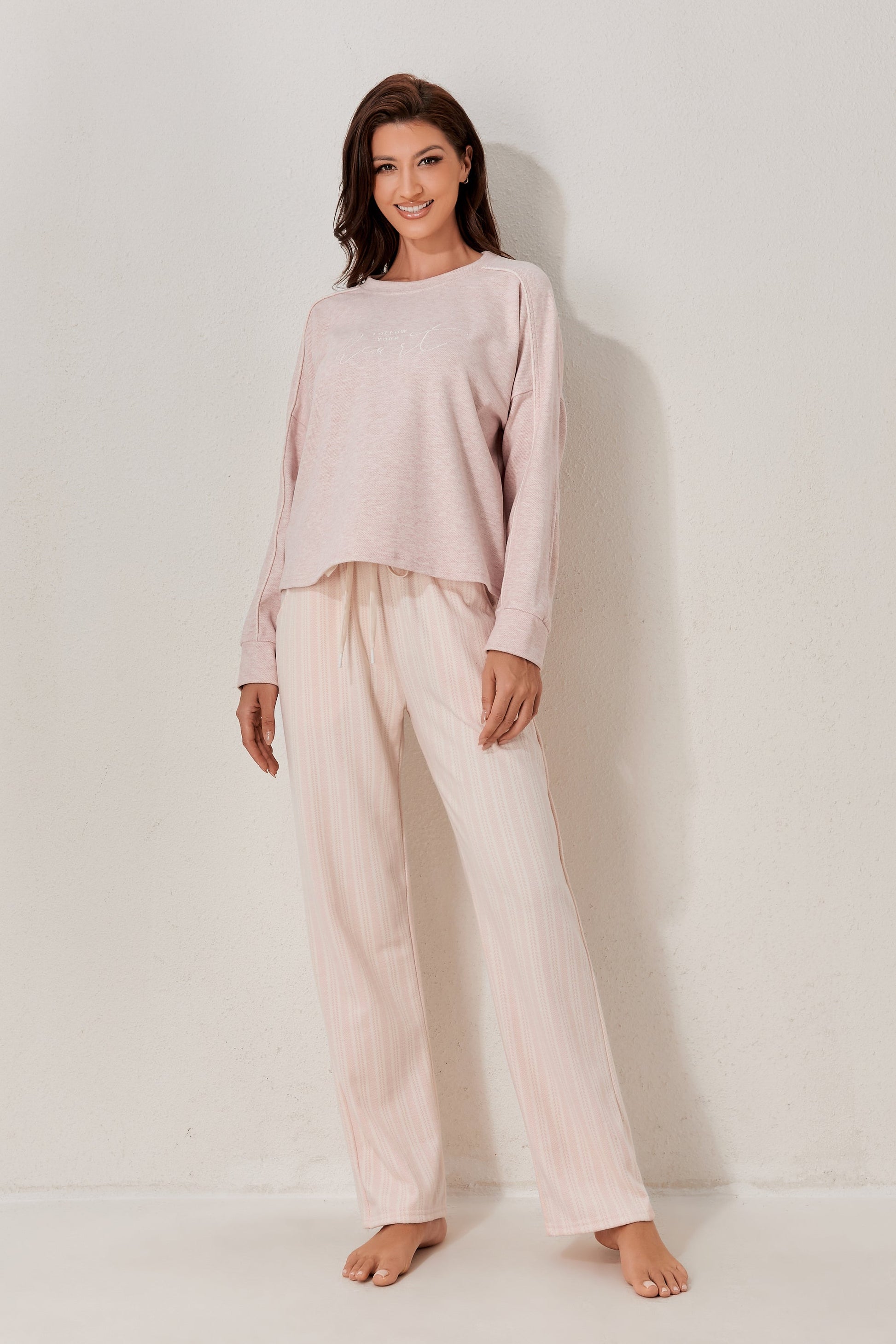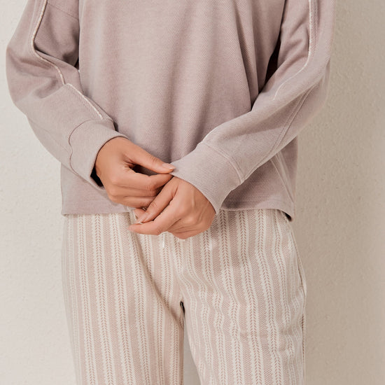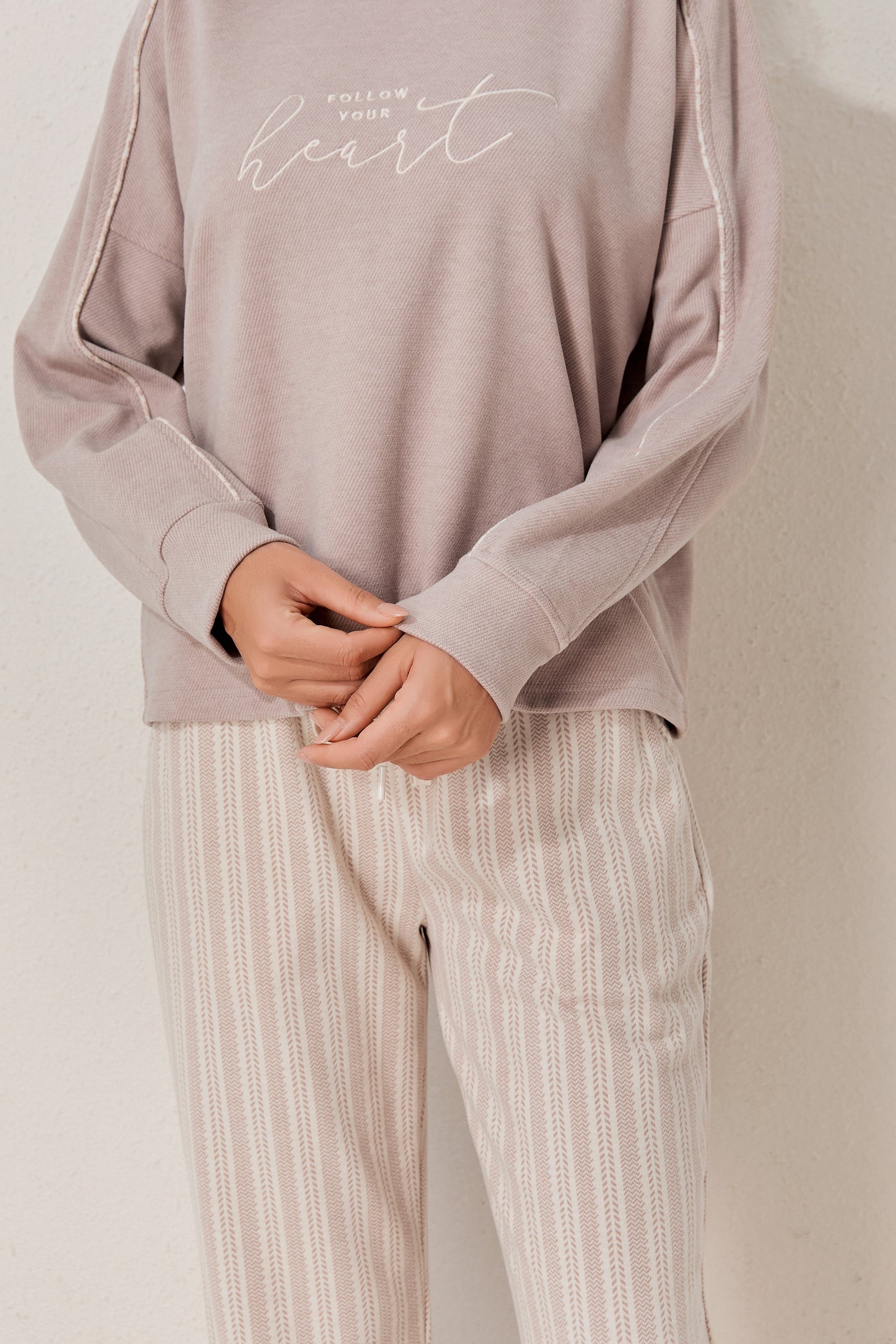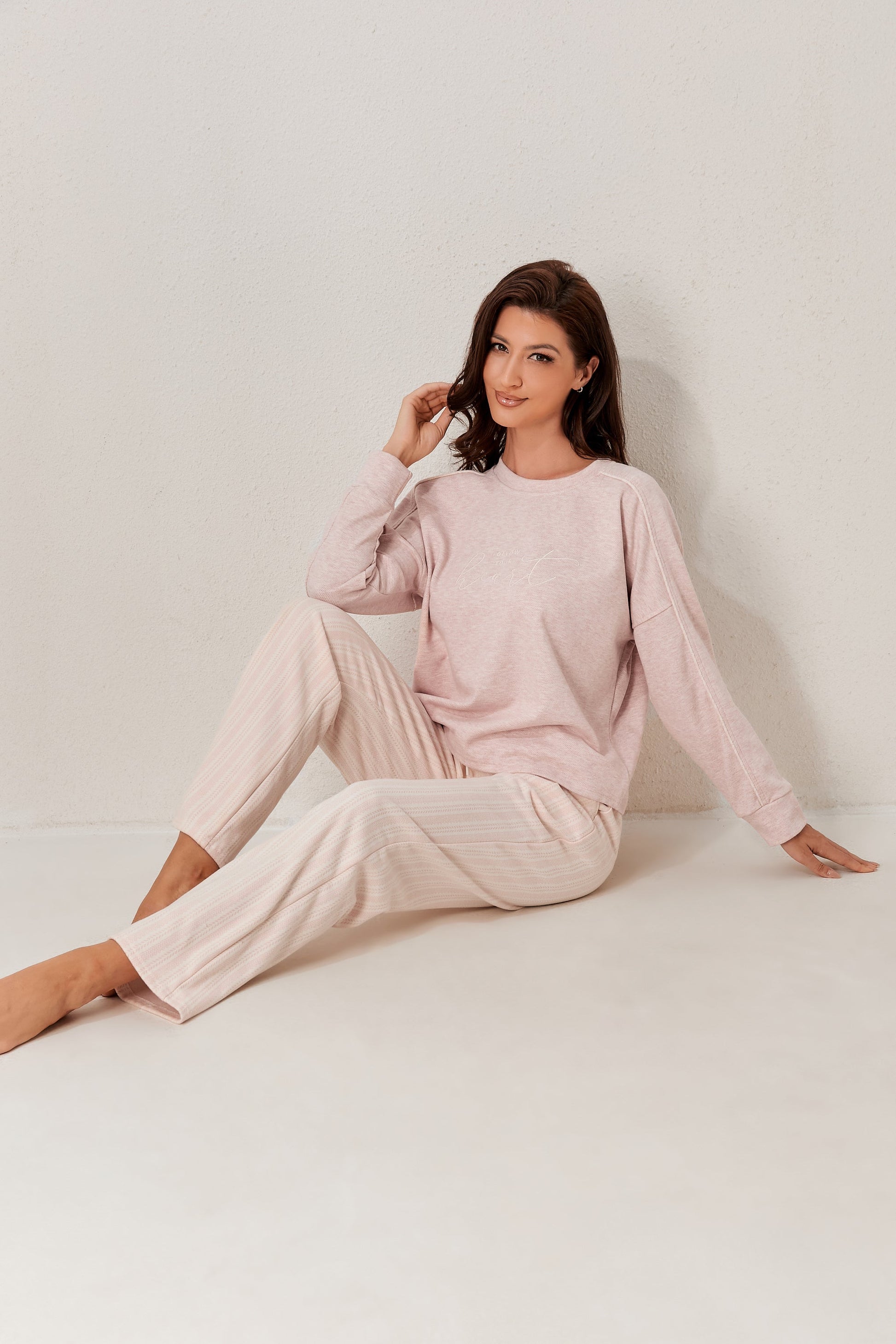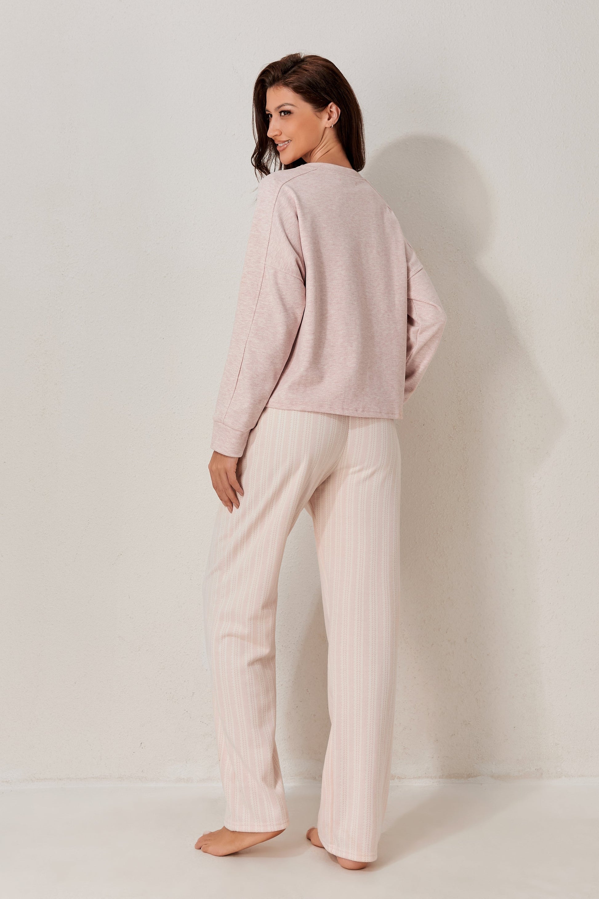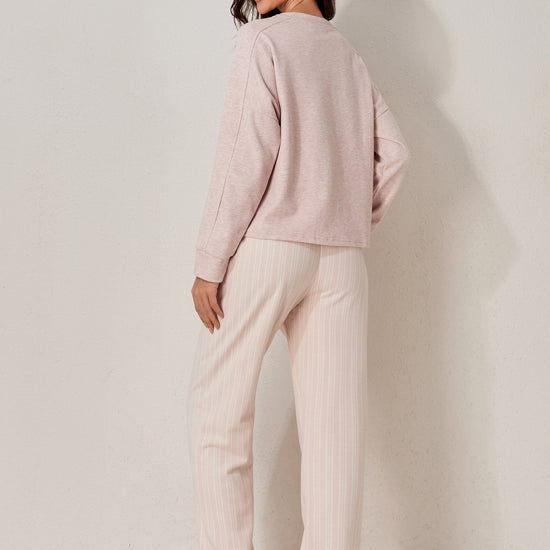 طقم بيجاما حديث مكون من قطعتين يقترن بقميص ناعم بأكمام طويلة مع بنطلون مخطط. مصنوع من قماش ناعم وجاكار، إنه قابل للتنفس وسلس،ومثالي للراحة اليومية الأنيقة.