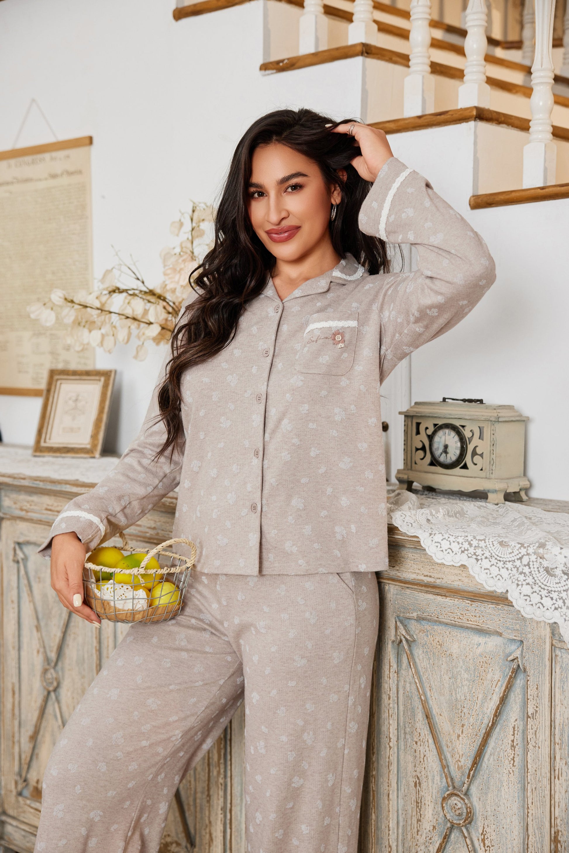 طقم بيجاما كلاسيكي من قطعتين مع قميص ذو ياقة مفتوحة وقيعان مريحة. مصنوع من قماش ناعم.
