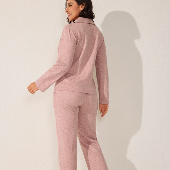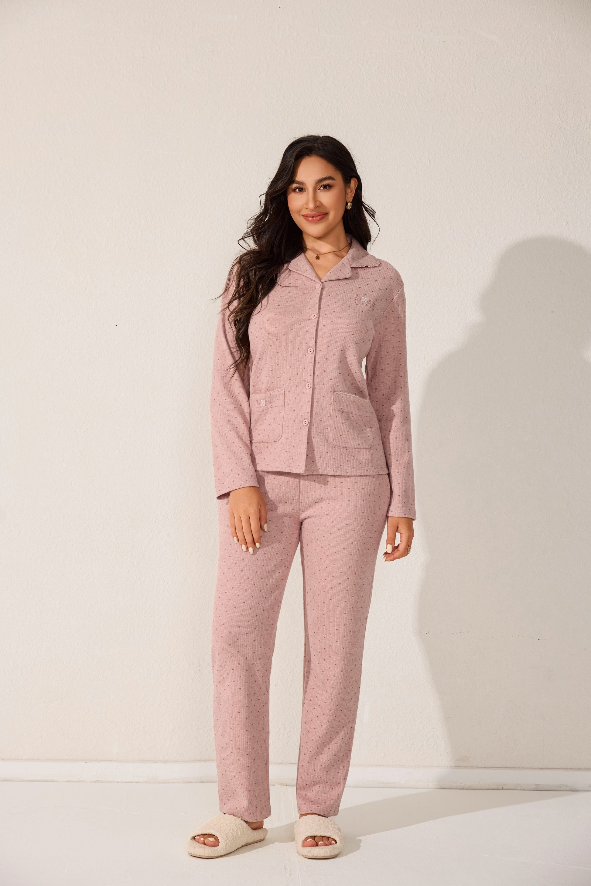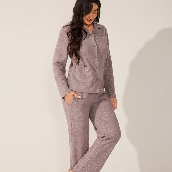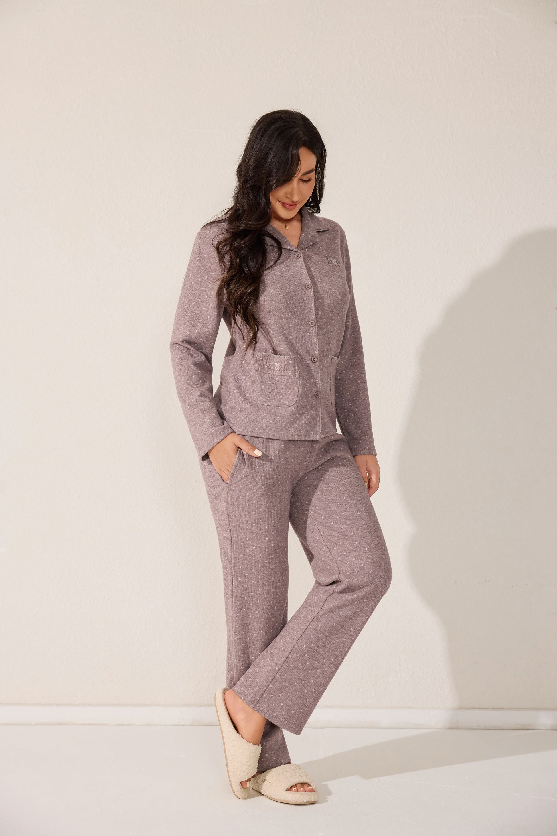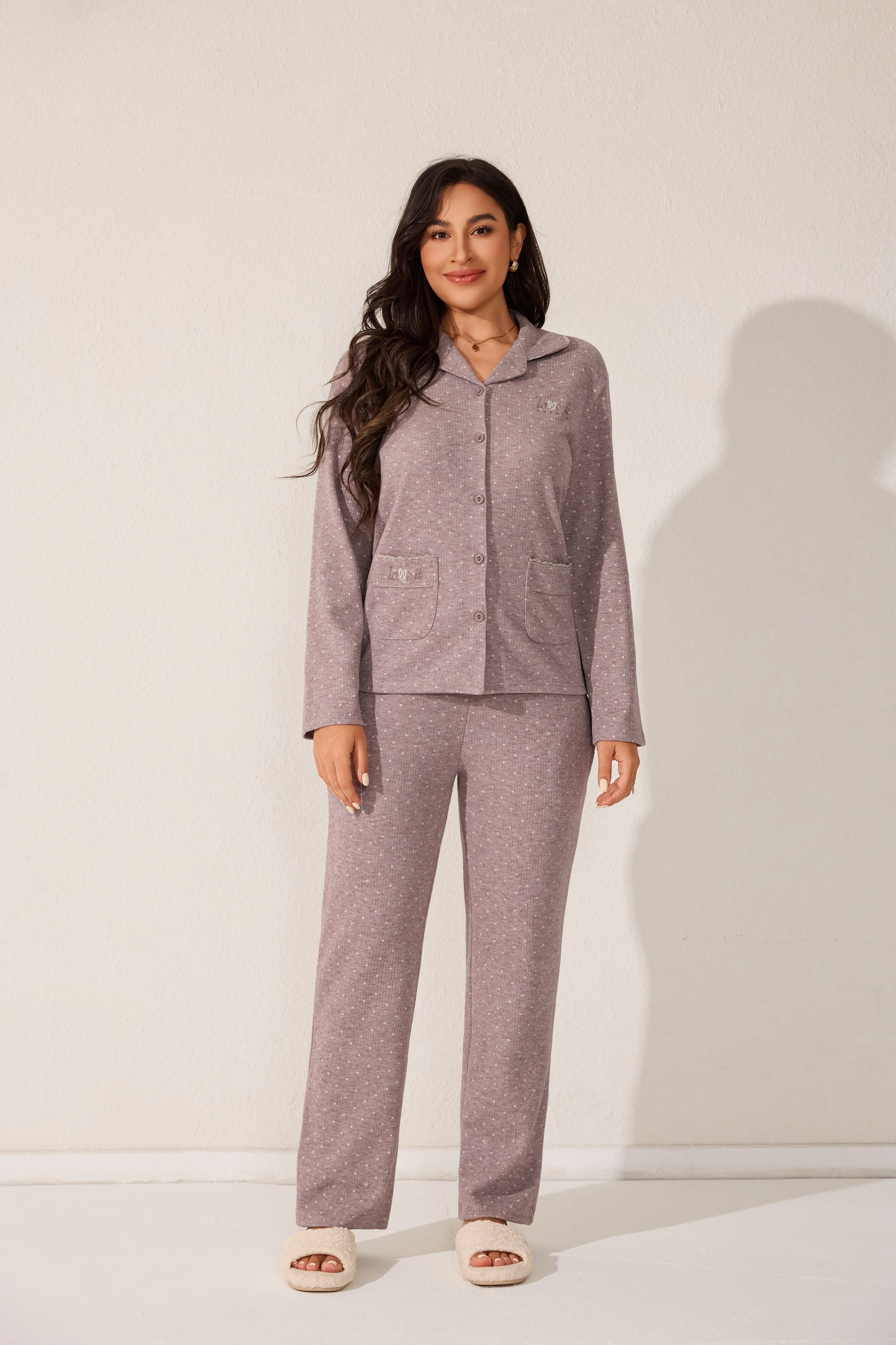 طقم بيجاما من قطعتين مع زر علوي بأكمام طويلة وقيعان كاملة الطول. يتميز بياقة قميص مفتوحة كلاسيكية للحصول على صورة ظلية خالدة. مصنوع من قماش ناعم لتوفير الراحة القصوى. مثالي للنوم أو الاسترخاء في المنزل.مصنوع من قماش المخزون.