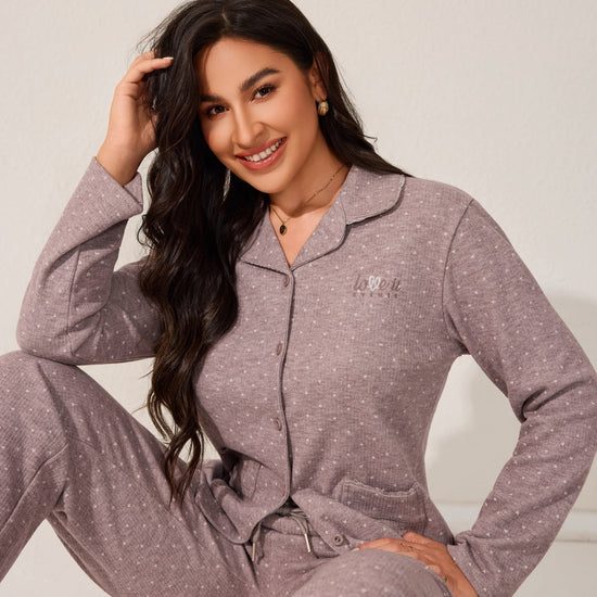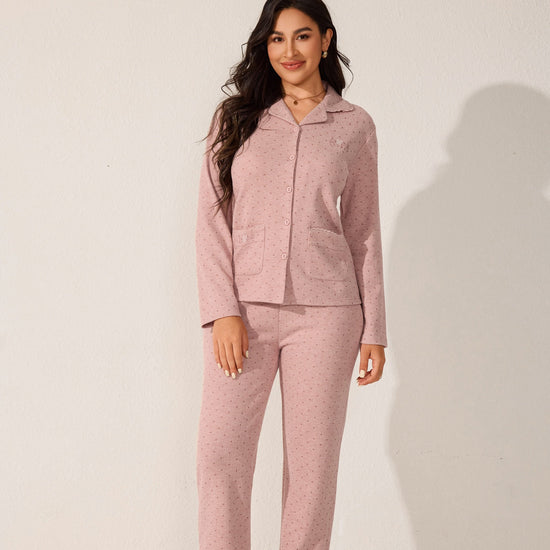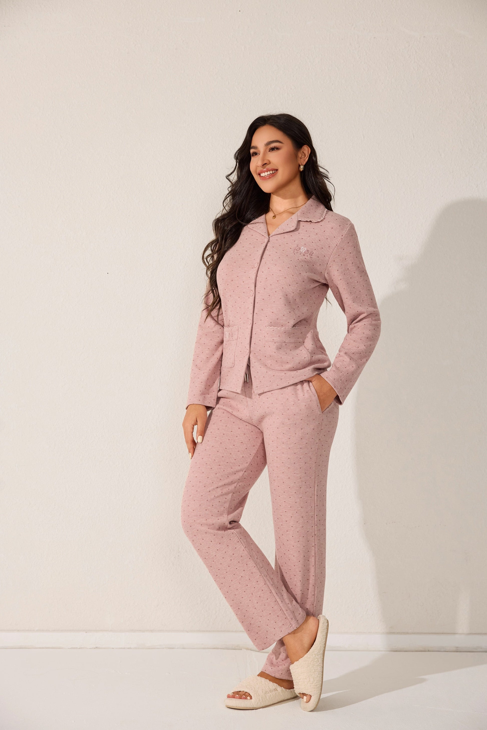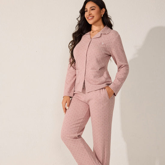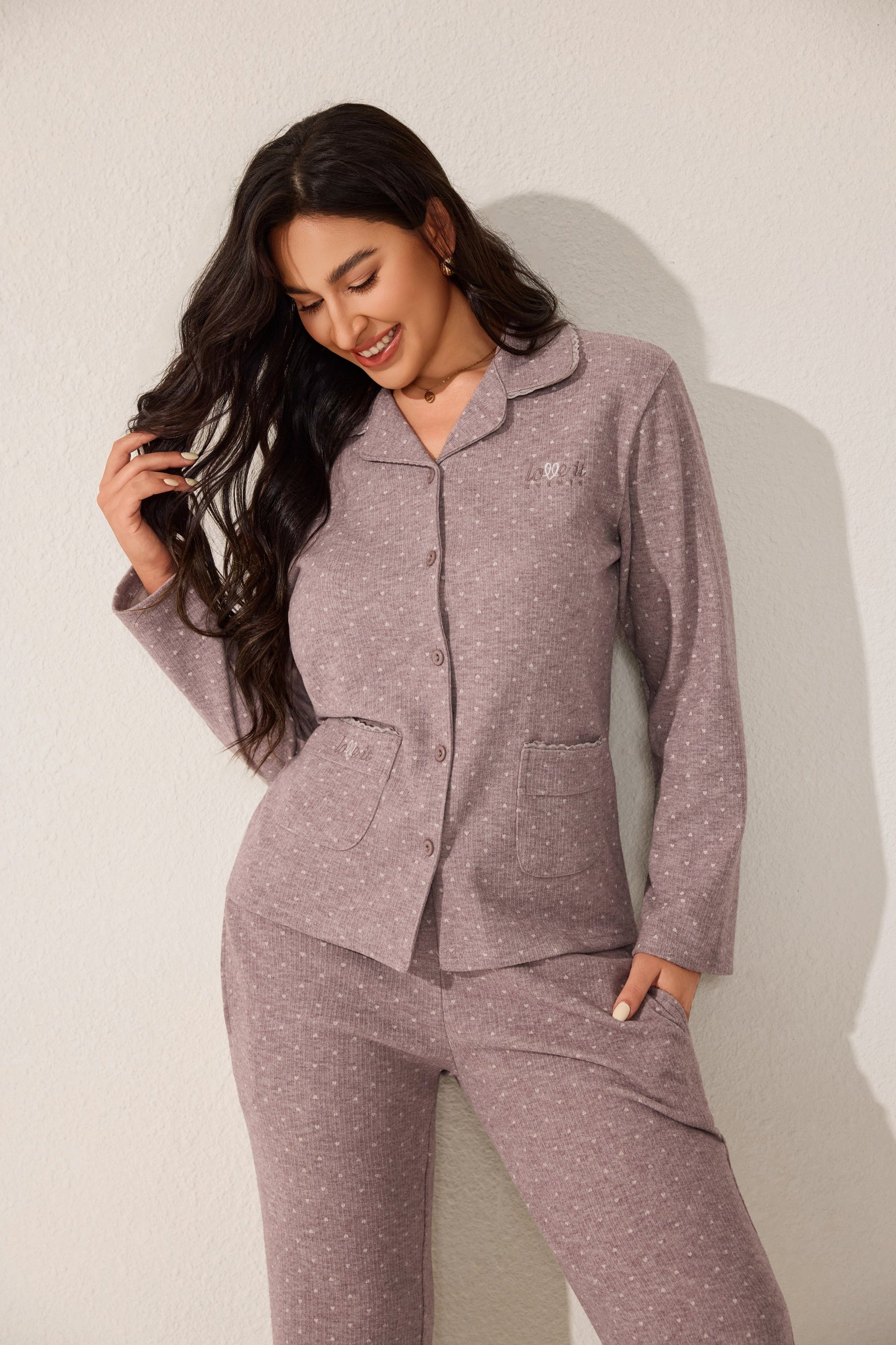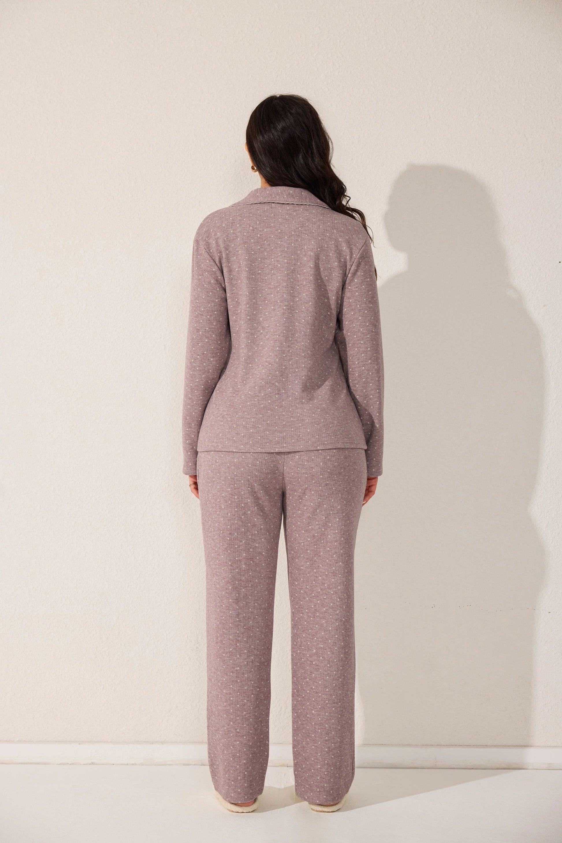 طقم بيجاما من قطعتين مع زر علوي بأكمام طويلة وقيعان كاملة الطول. يتميز بياقة قميص مفتوحة كلاسيكية للحصول على صورة ظلية خالدة. مصنوع من قماش ناعم لتوفير الراحة القصوى. مثالي للنوم أو الاسترخاء في المنزل.مصنوع من قماش المخزون.