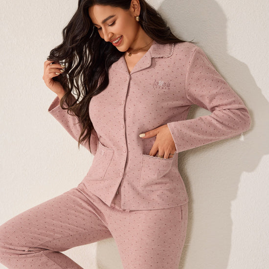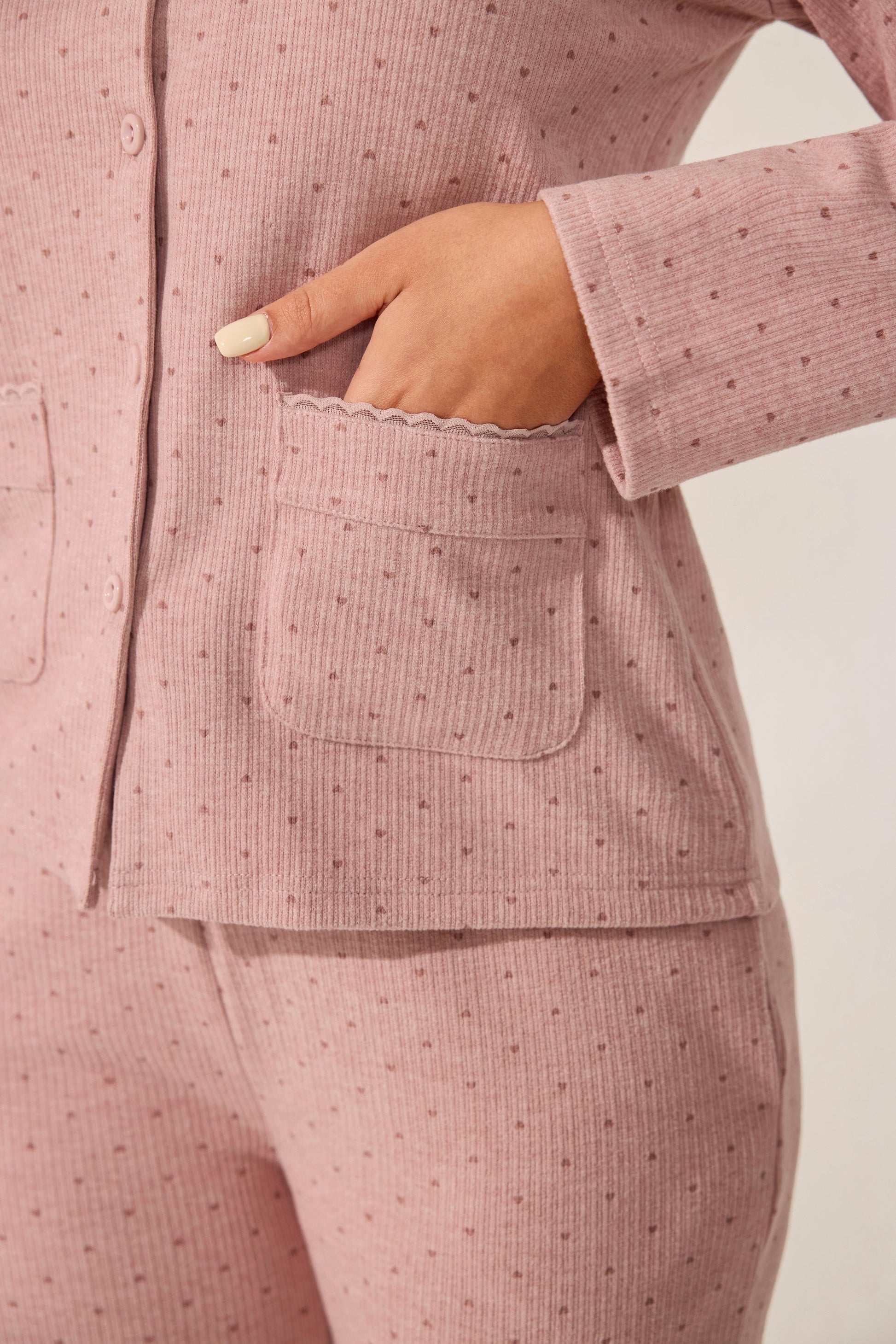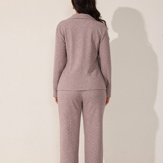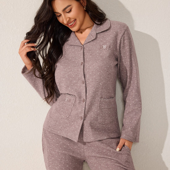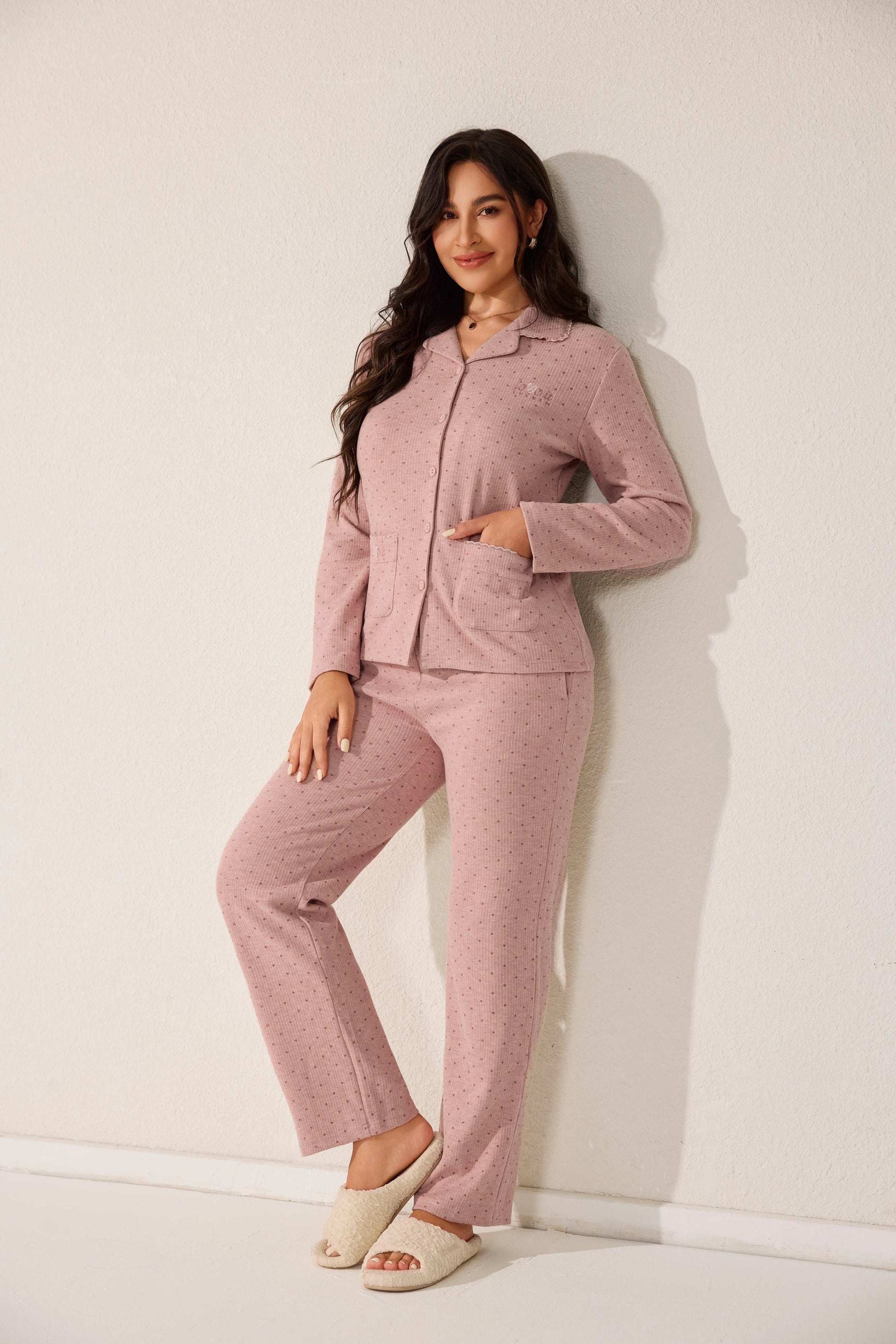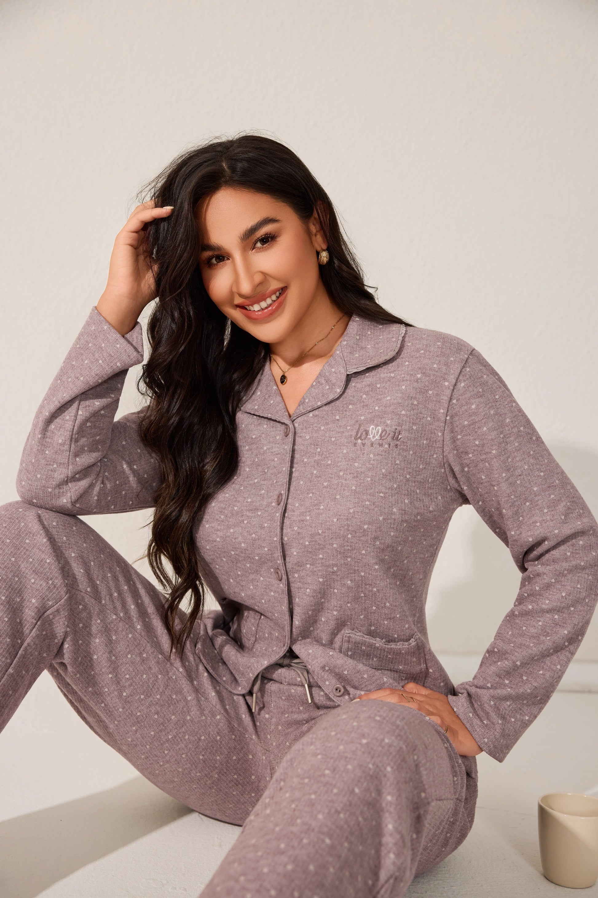 طقم بيجاما من قطعتين مع زر علوي بأكمام طويلة وقيعان كاملة الطول. يتميز بياقة قميص مفتوحة كلاسيكية للحصول على صورة ظلية خالدة. مصنوع من قماش ناعم لتوفير الراحة القصوى. مثالي للنوم أو الاسترخاء في المنزل.مصنوع من قماش المخزون.