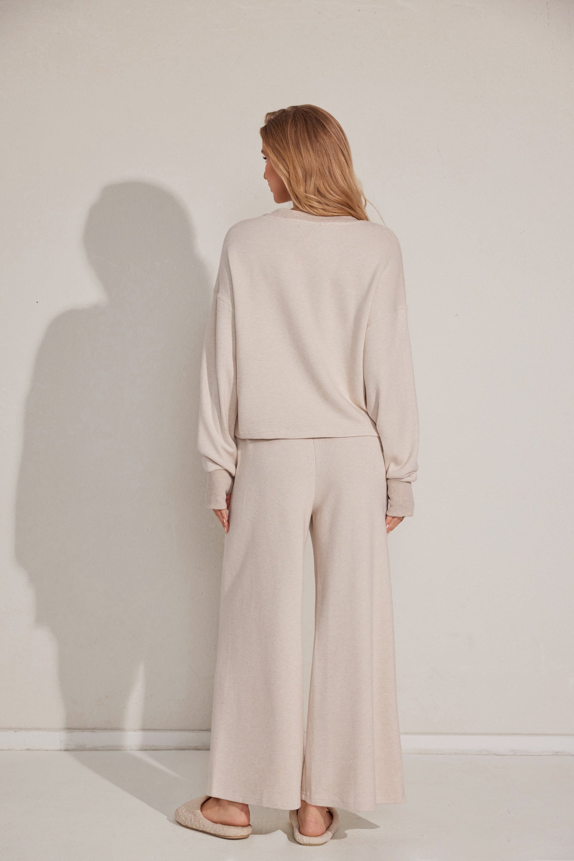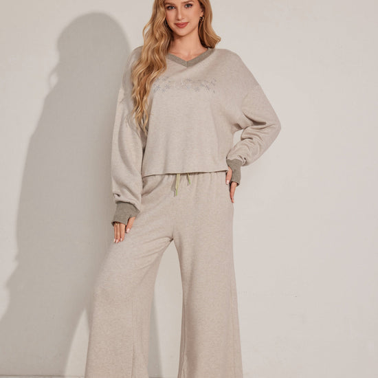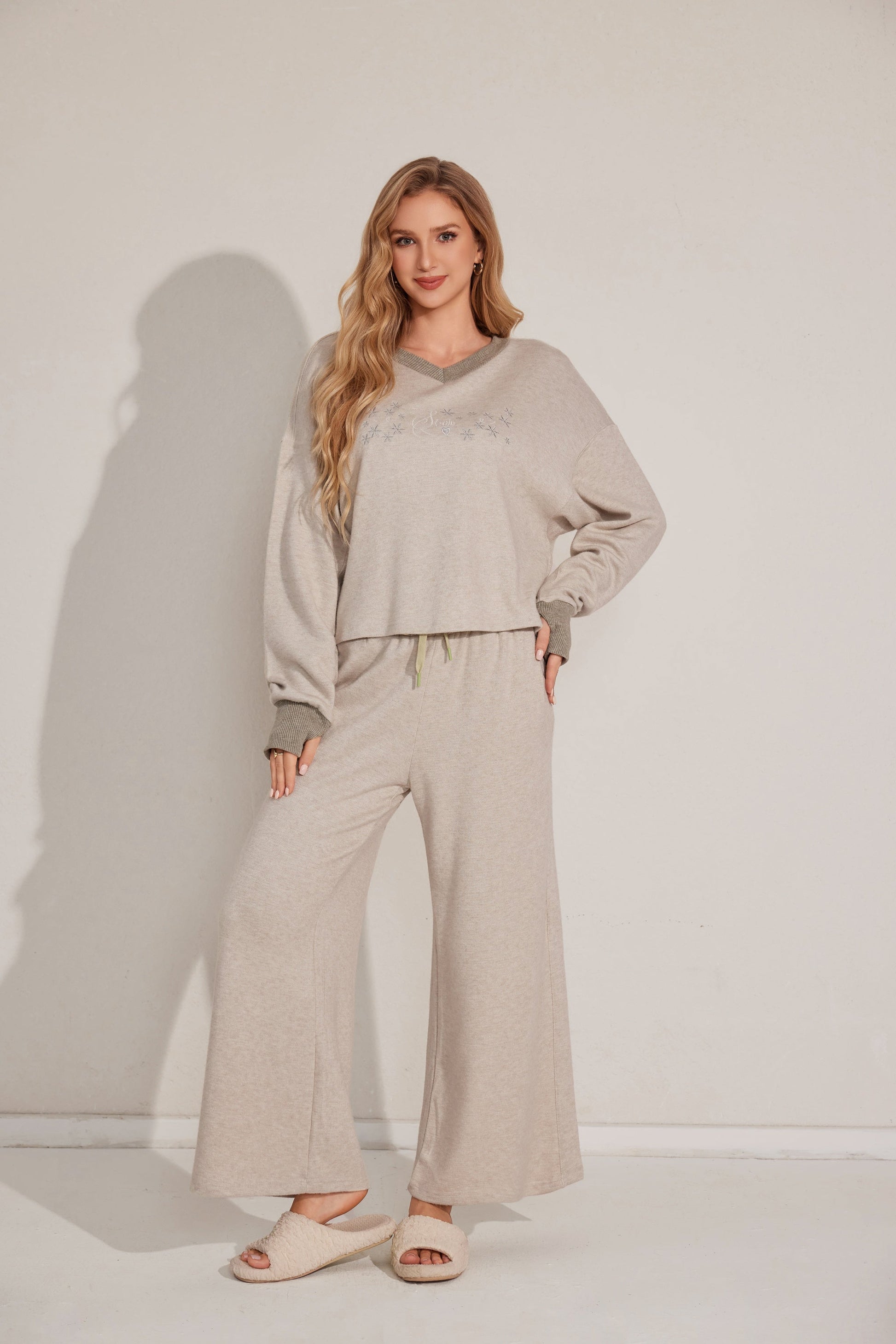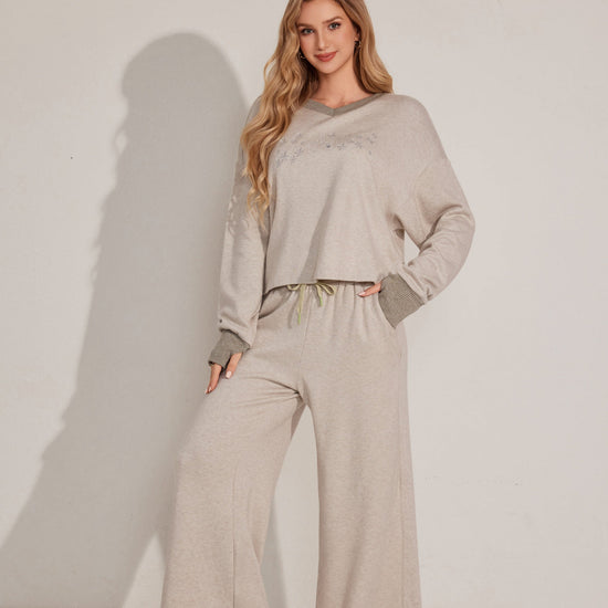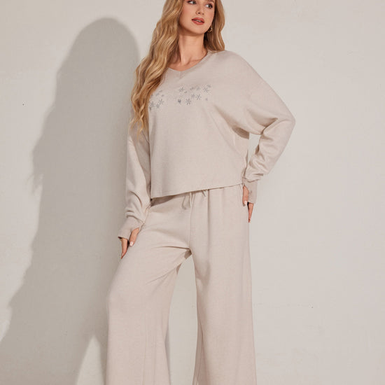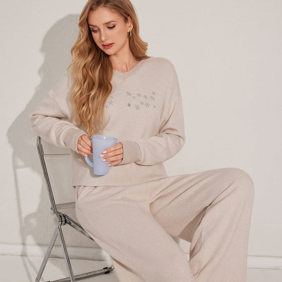 طقم بيجاما من قطعتين يتميز بقمة مريحة بأكمام طويلة وقيعان مطابقة مصنوعة من قماش ناعم.مثالي للتسكع اليومي.