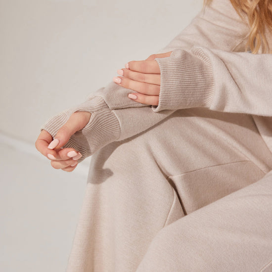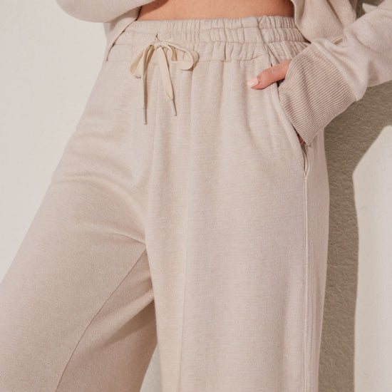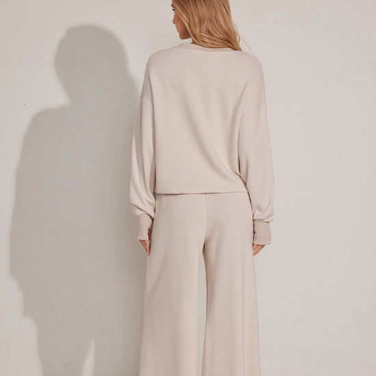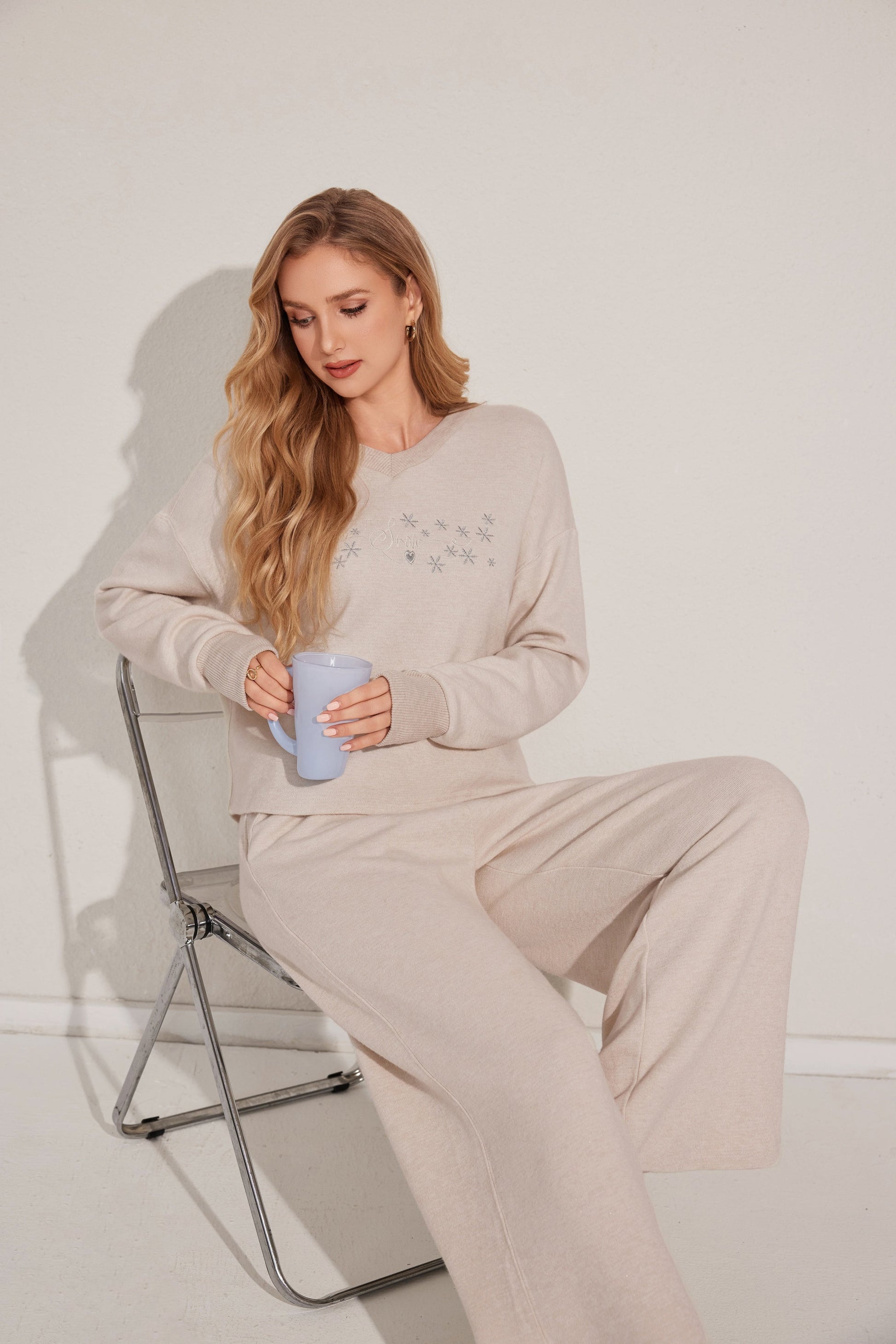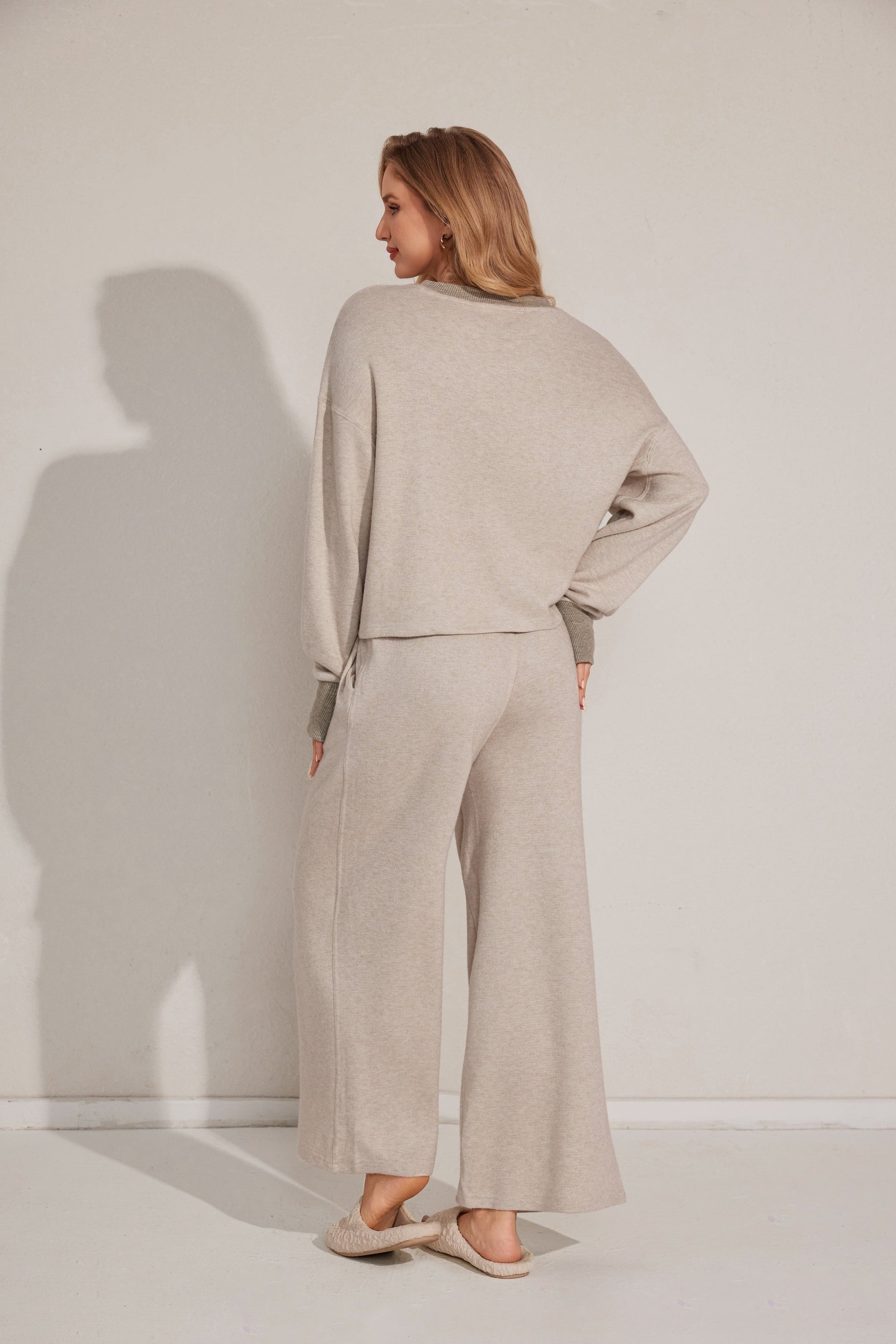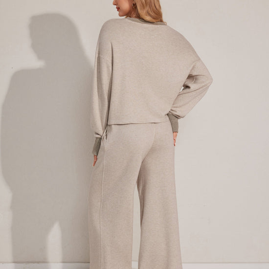 طقم بيجاما من قطعتين يتميز بقمة مريحة بأكمام طويلة وقيعان مطابقة مصنوعة من قماش ناعم.مثالي للتسكع اليومي.
