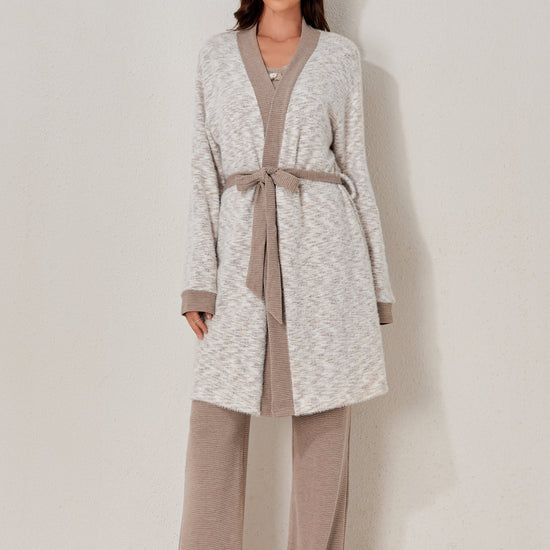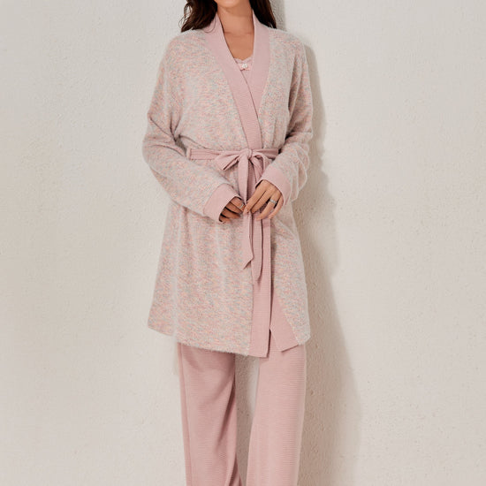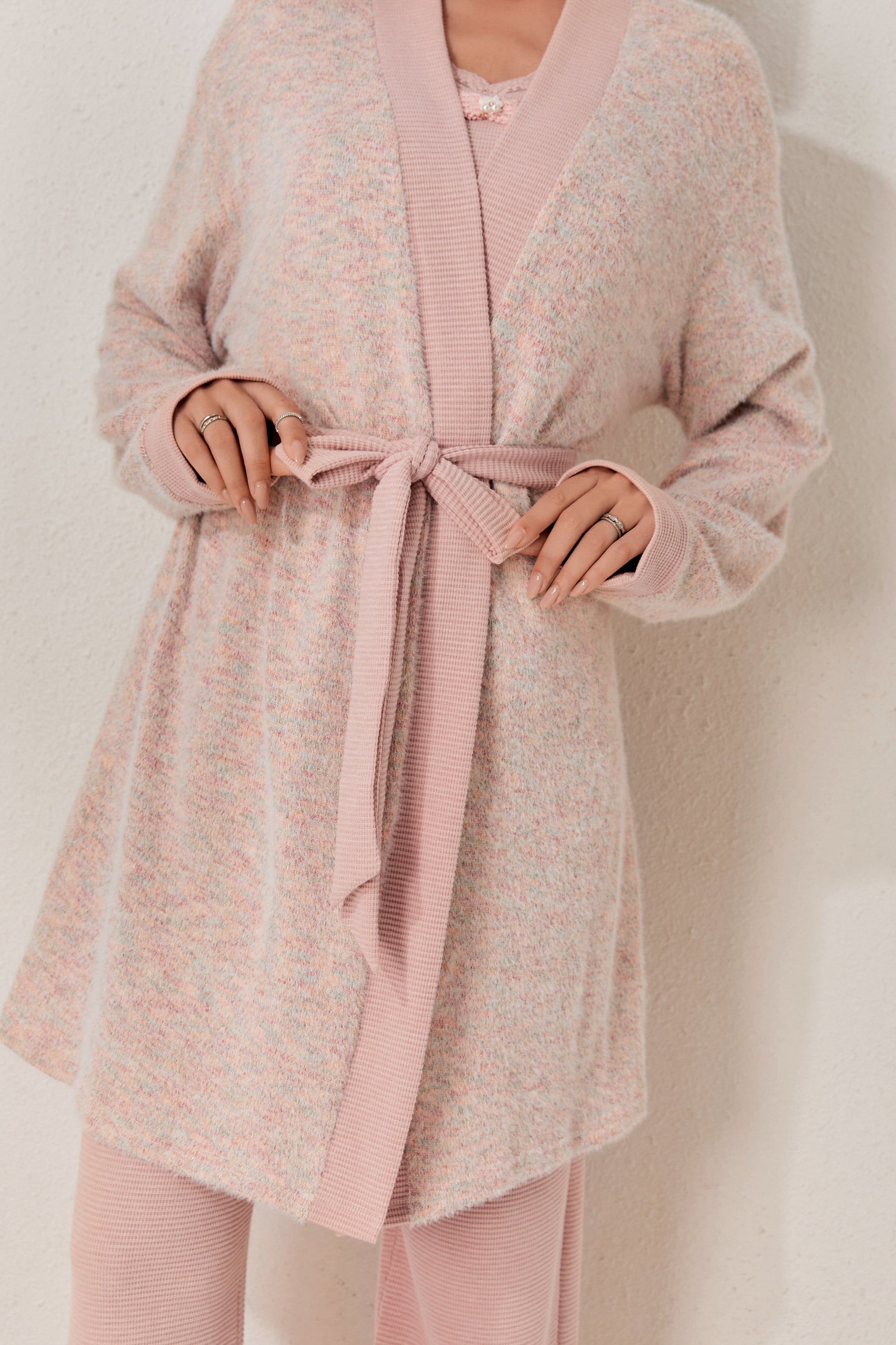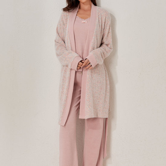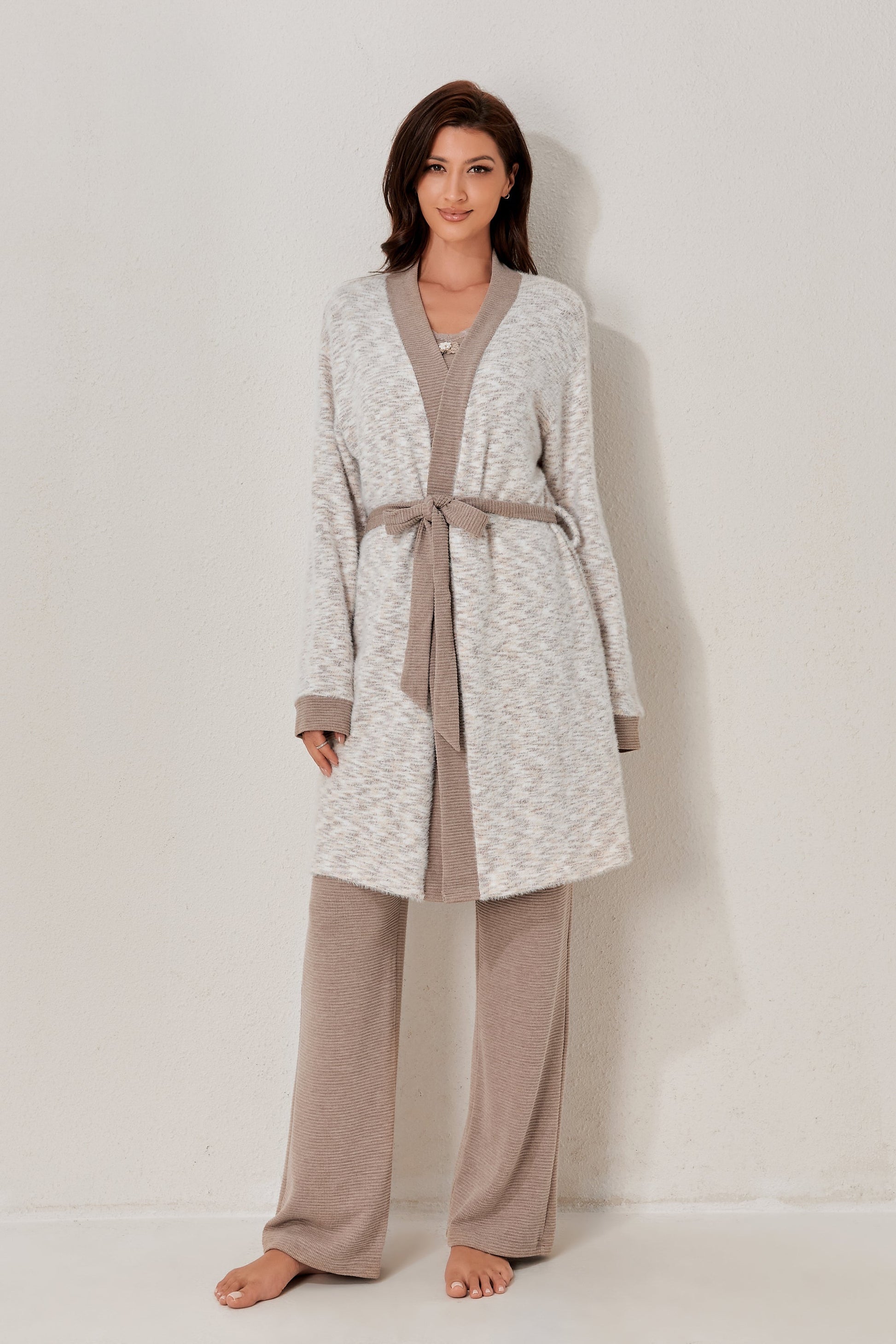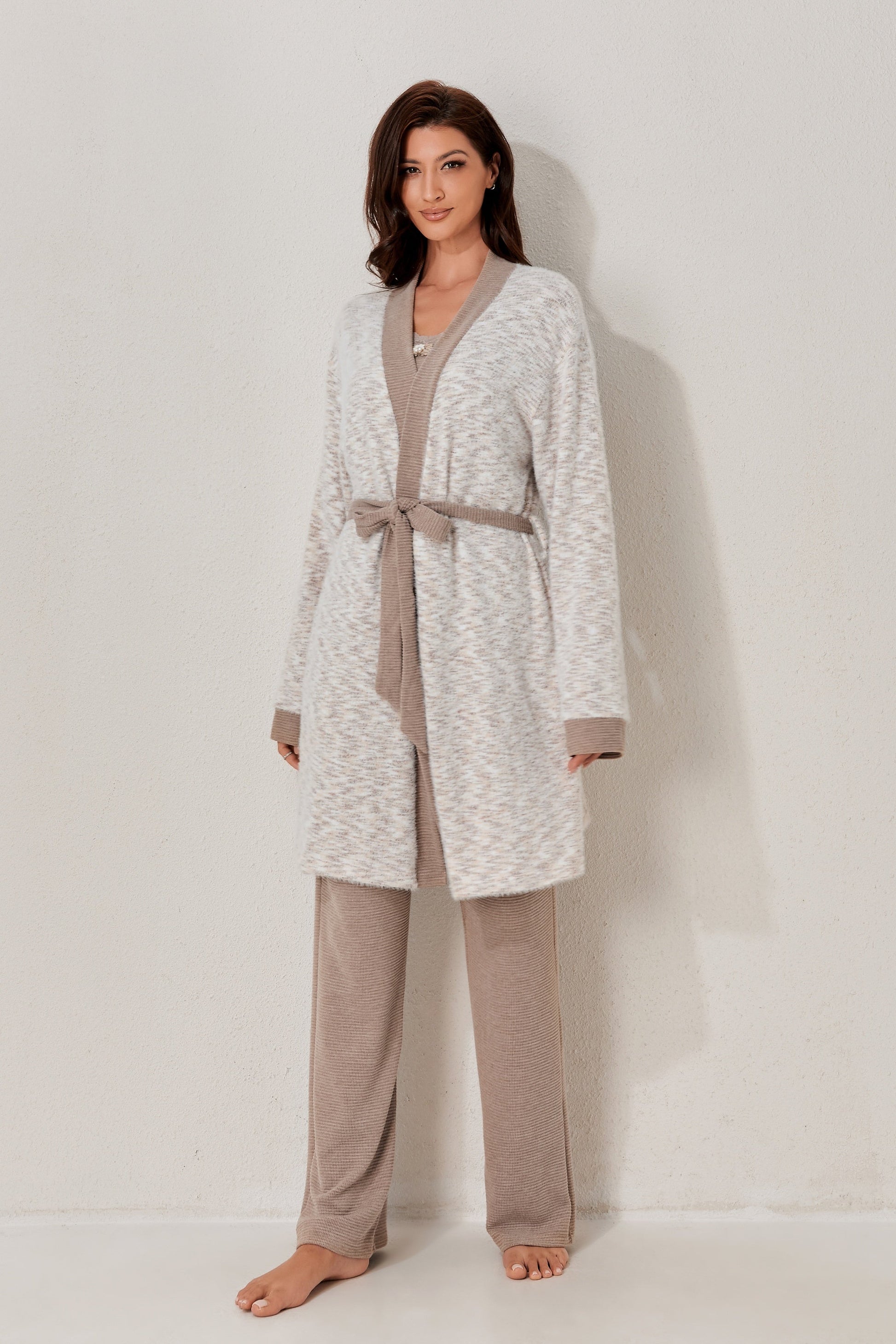 مجموعة أنيقة من ثلاث قطع تتضمن رداءا مطابقا وبلوزة وبنطلون بيجامة كامل الطول. مصنوع من قماش ناعم.