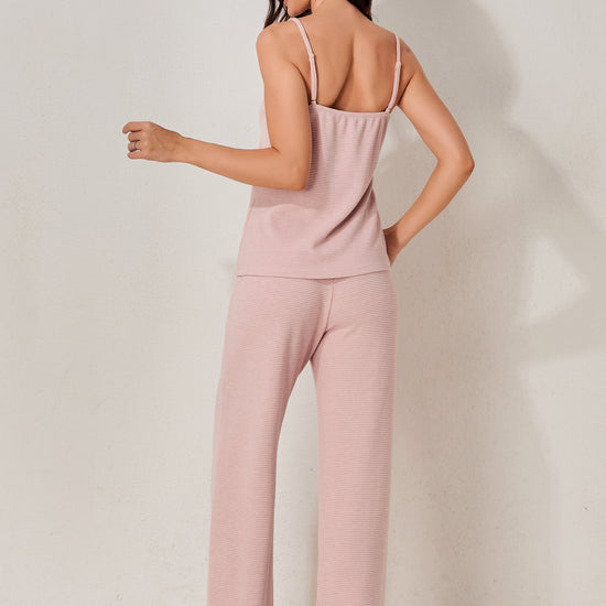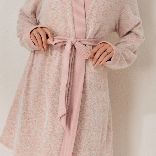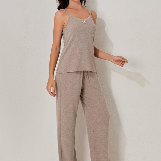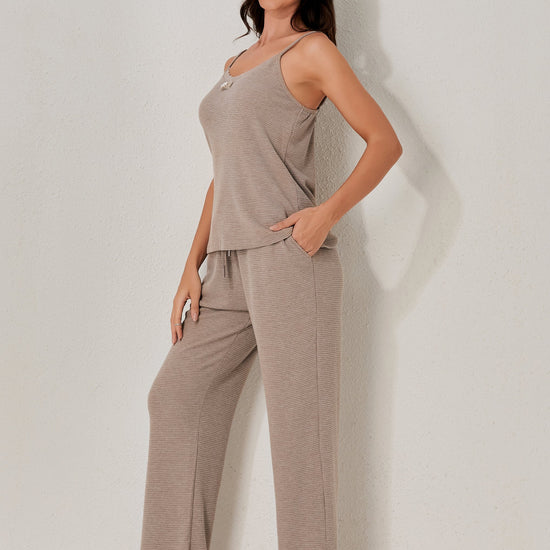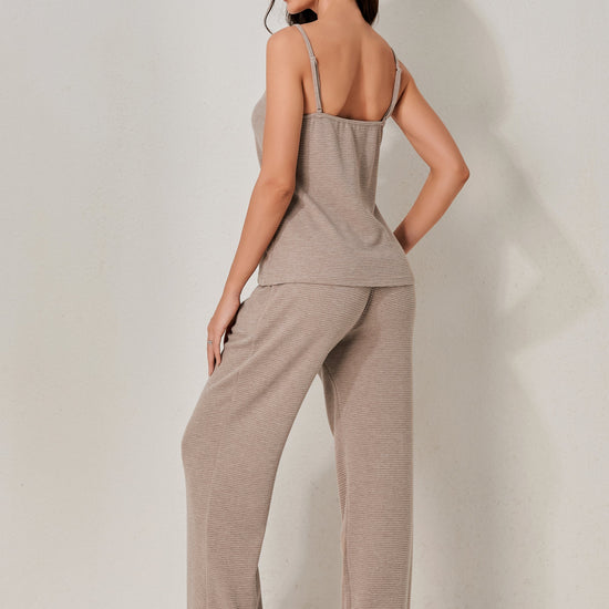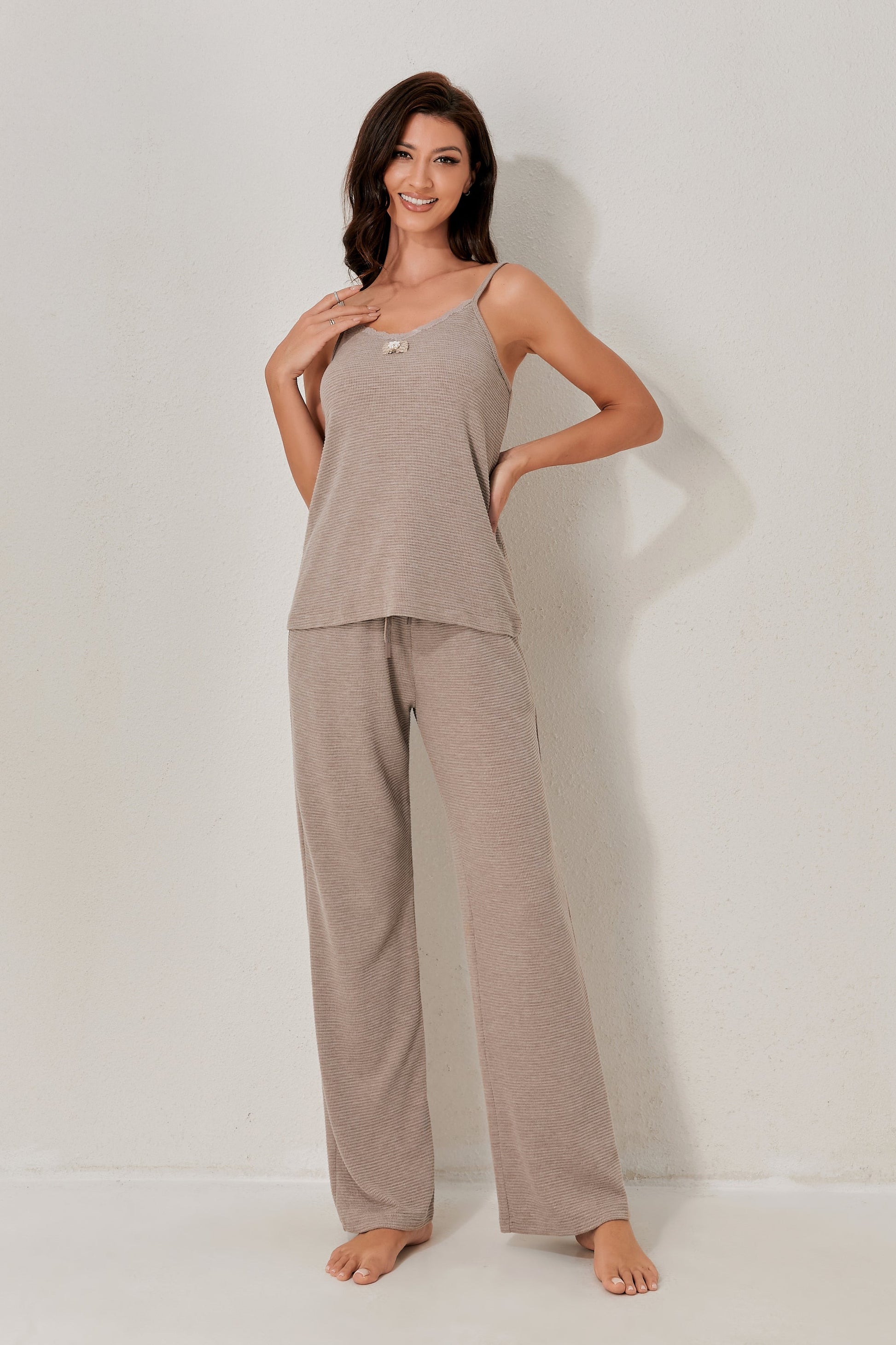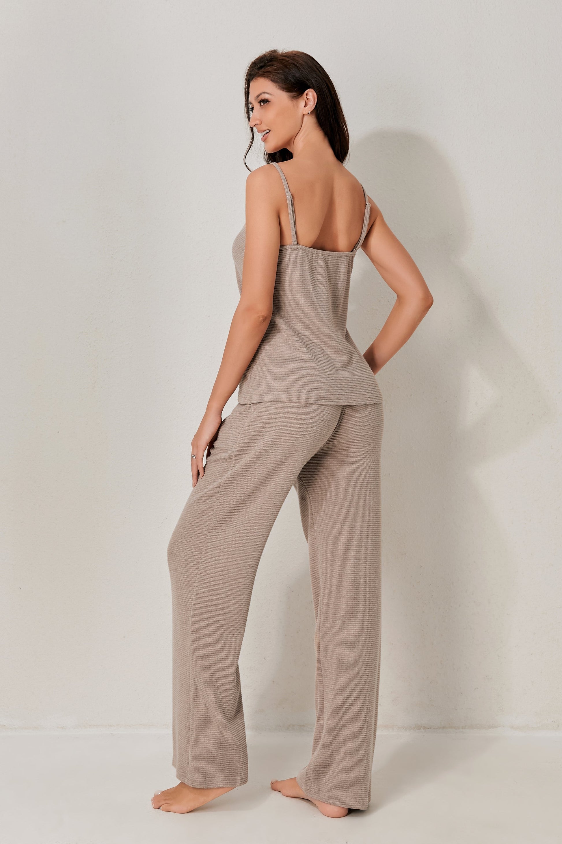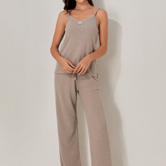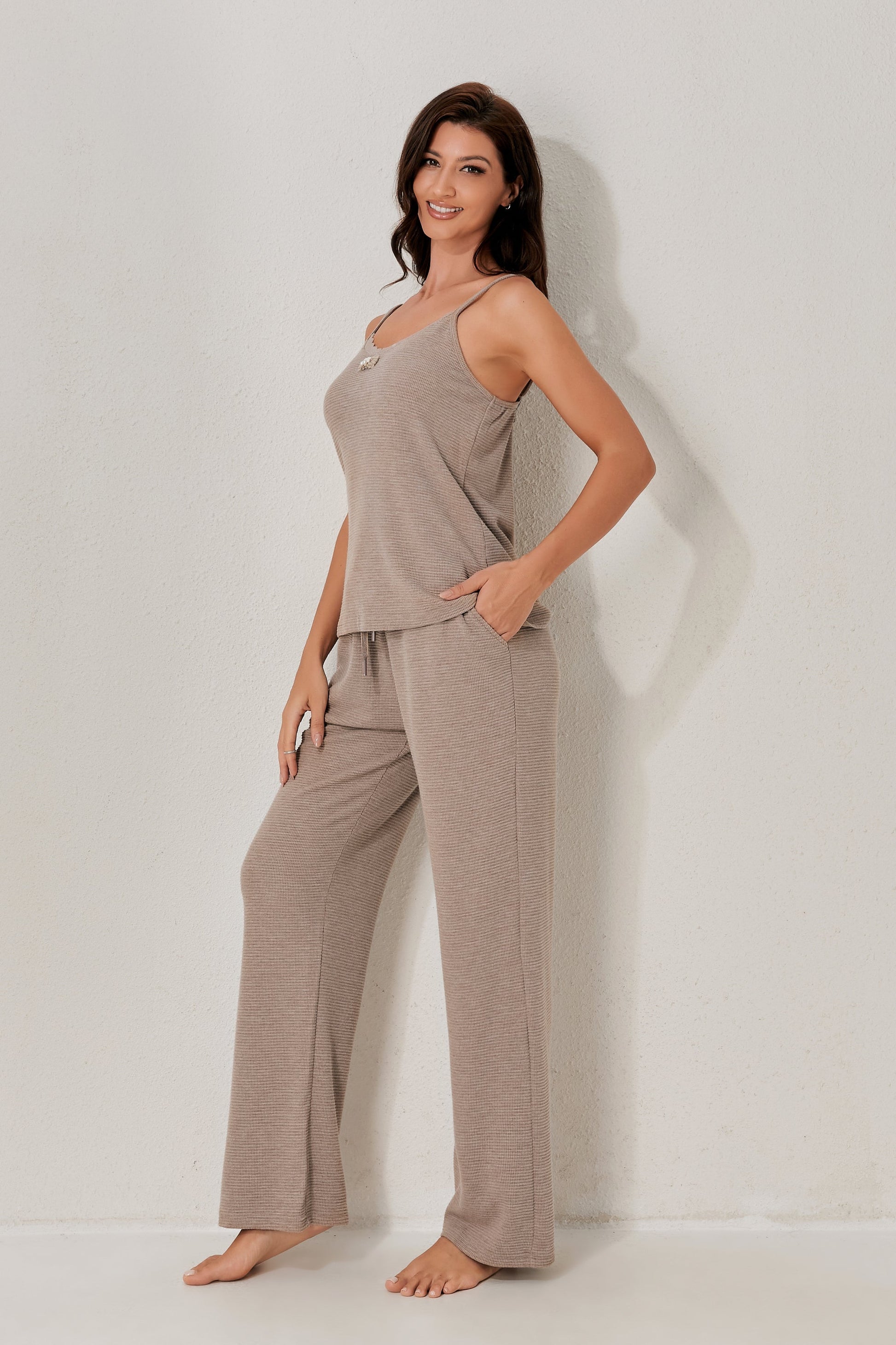 مجموعة أنيقة من ثلاث قطع تتضمن رداءا مطابقا وبلوزة وبنطلون بيجامة كامل الطول. مصنوع من قماش ناعم.