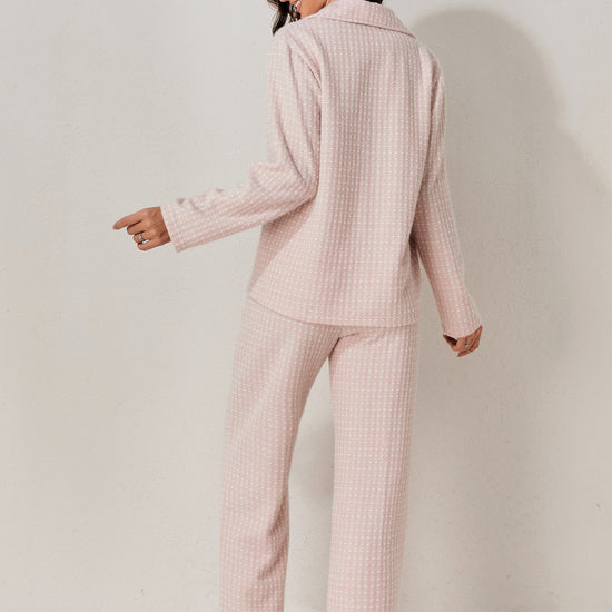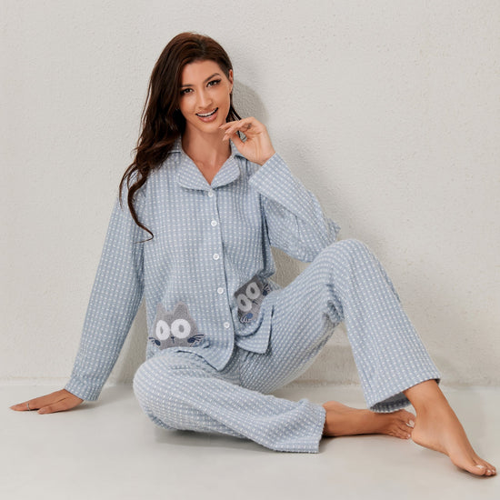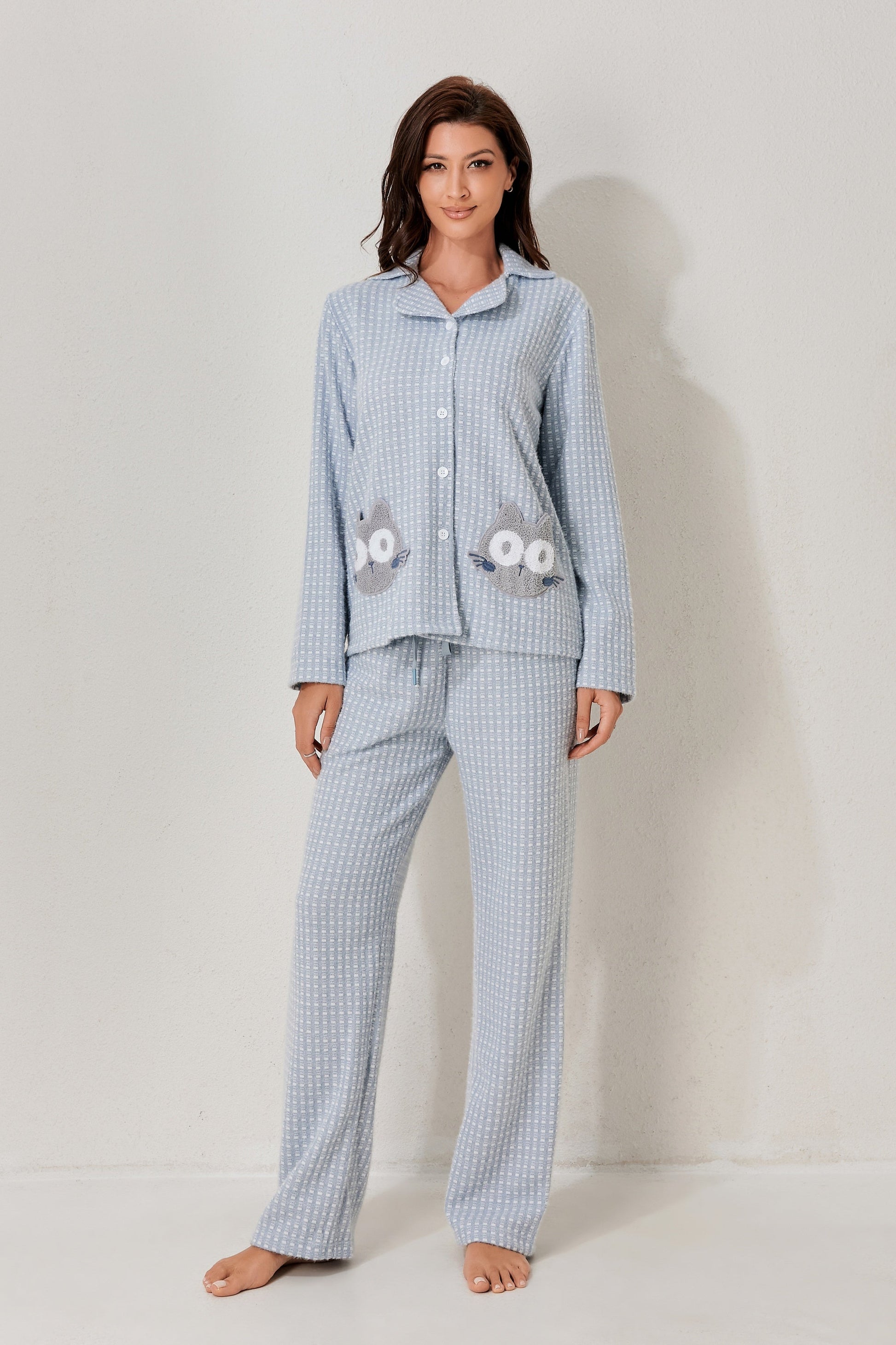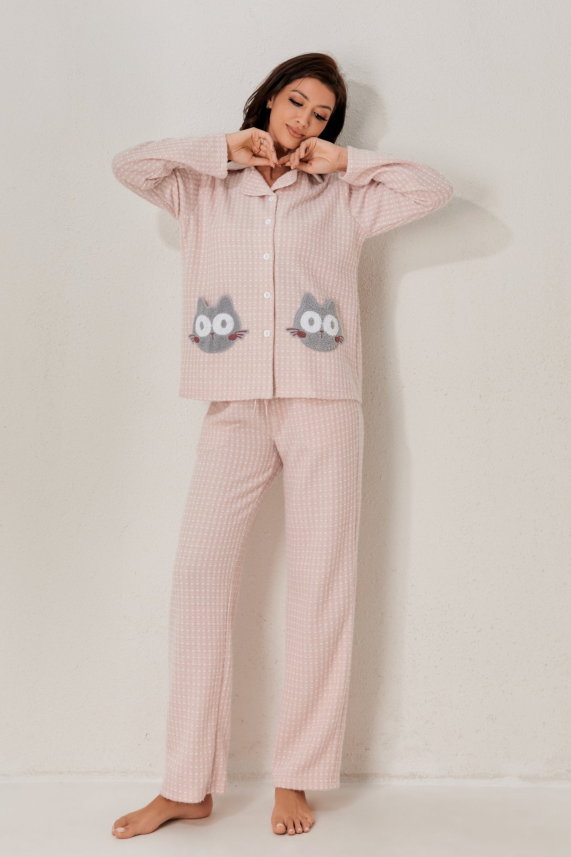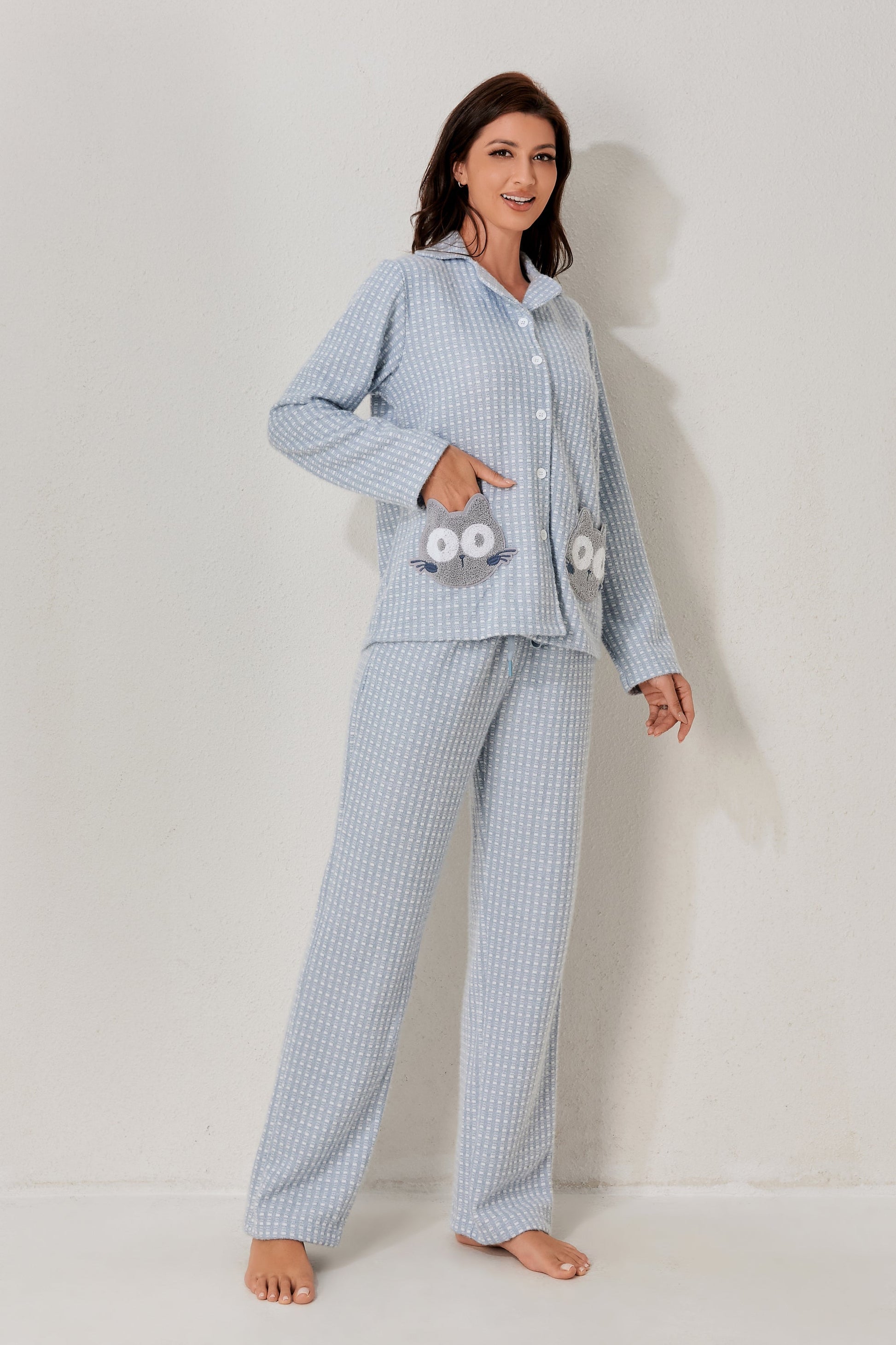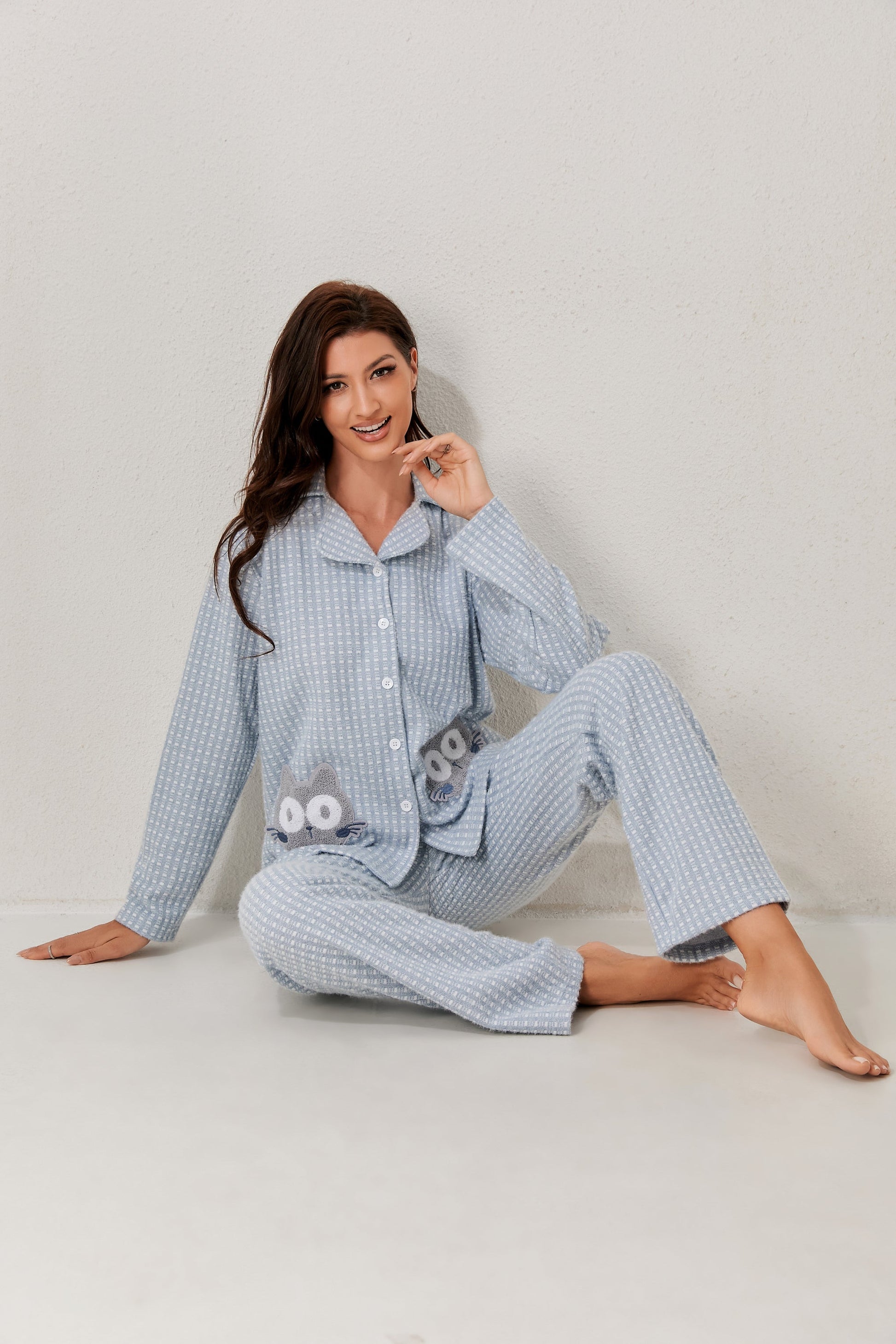 بوطقم بيجاما من قطعتين مع قميص كلاسيكي وبنطلون مريح. مصنوع من نسيج ناعم لتوفير الراحة للتنفس.