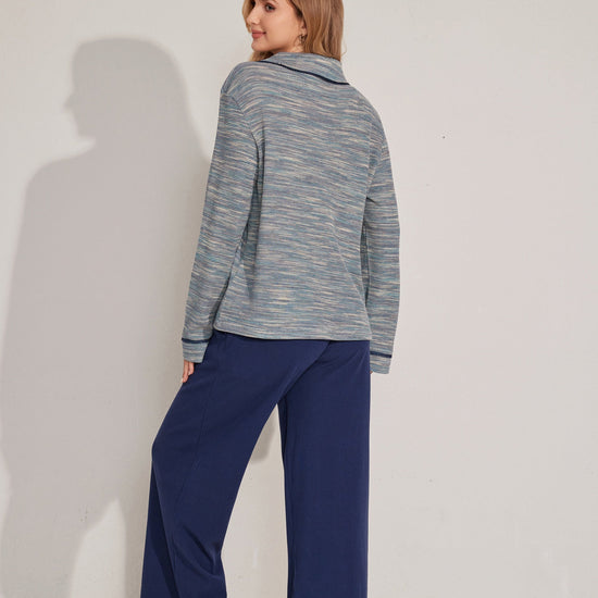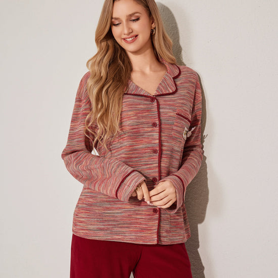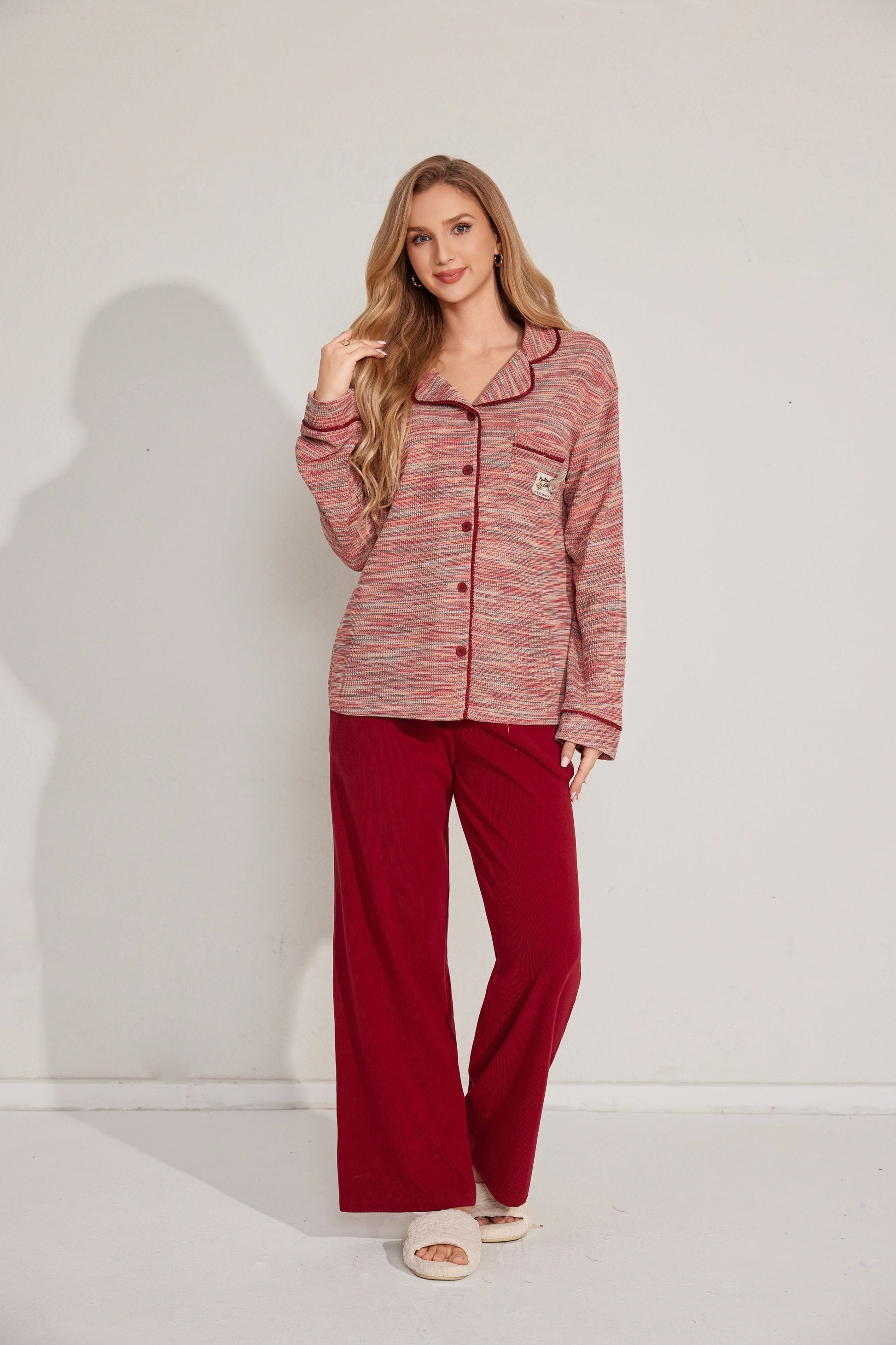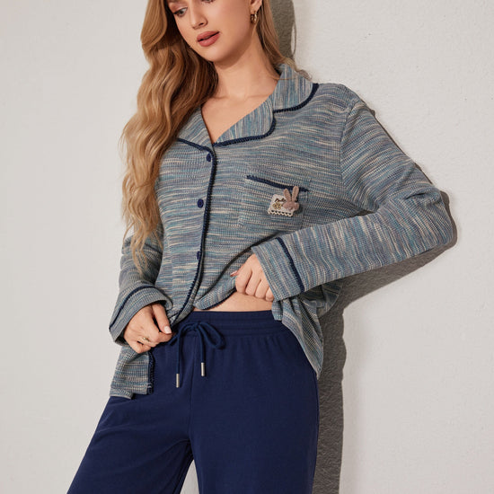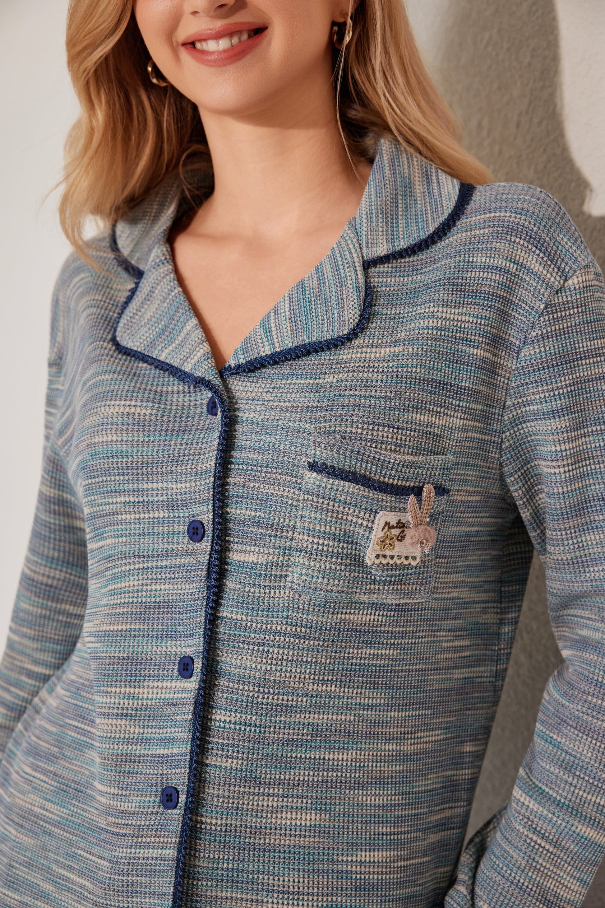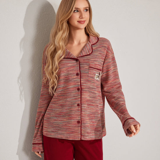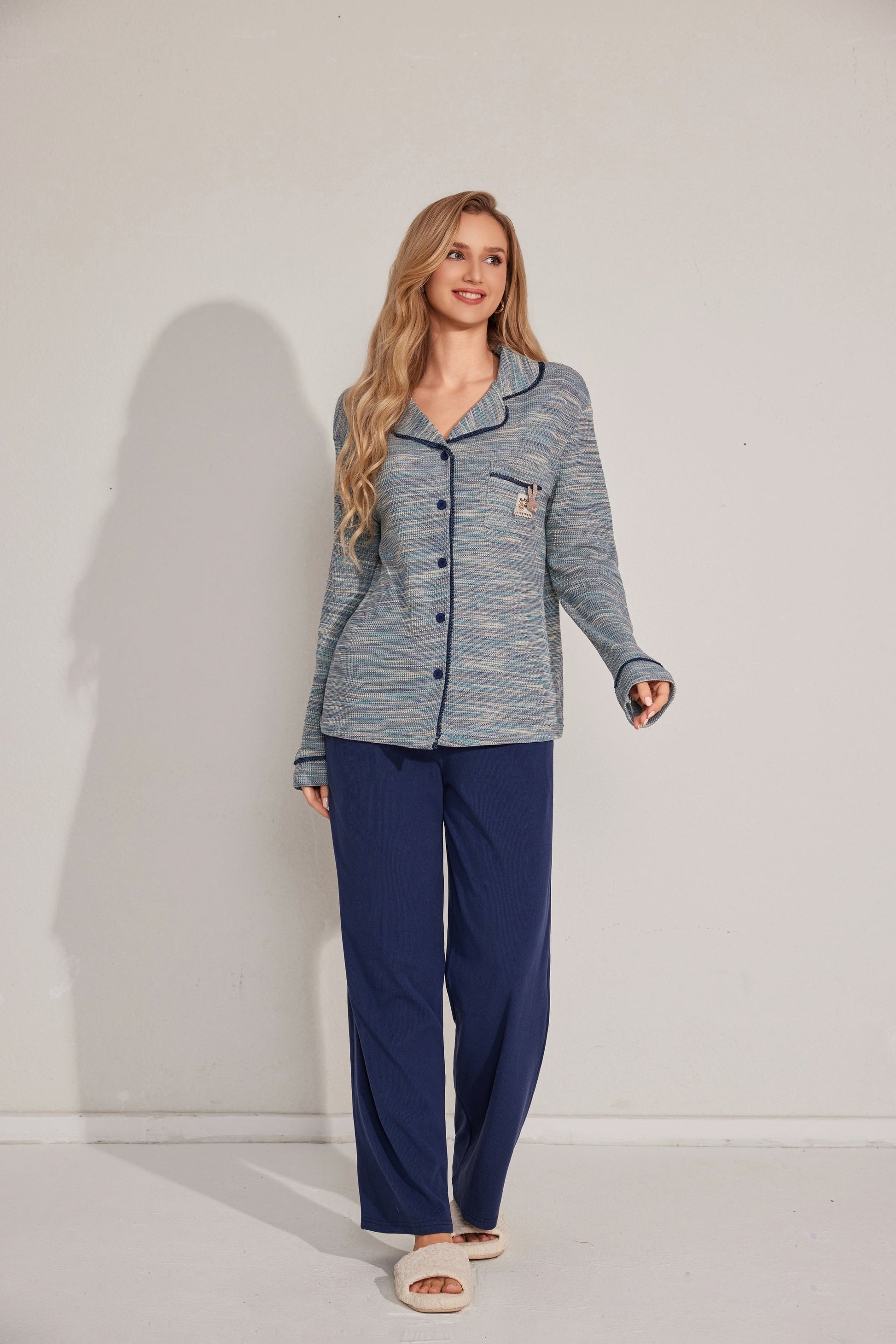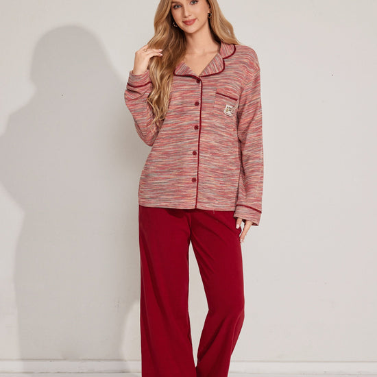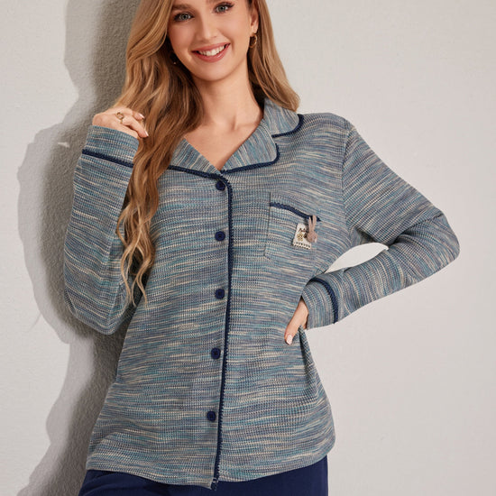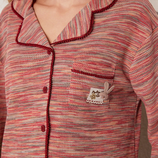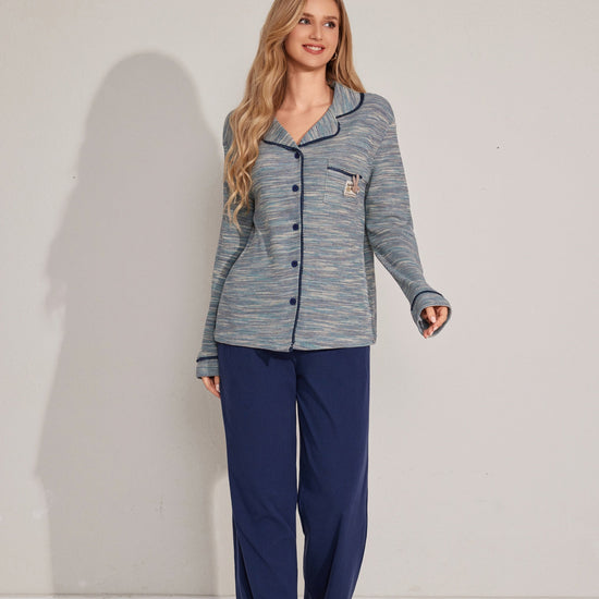 مجموعة بيجاما بأزرار معمقاس لطيف، يتميز بقميص طويل الأكمام وبنطلون مريح. تم تصميمه مع وضع السهولة والدفء في الاعتبار. مصنوع من قماش ناعم.