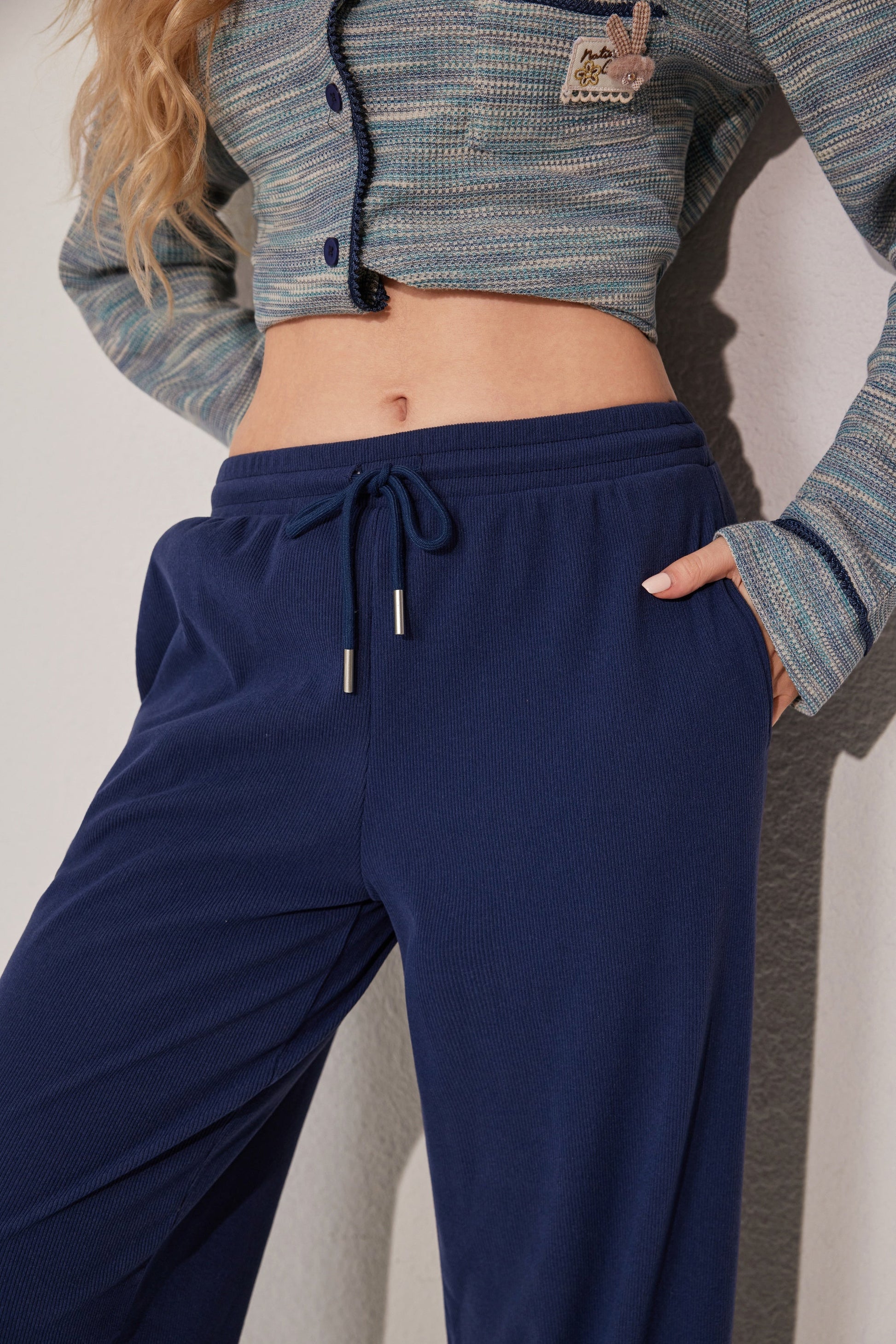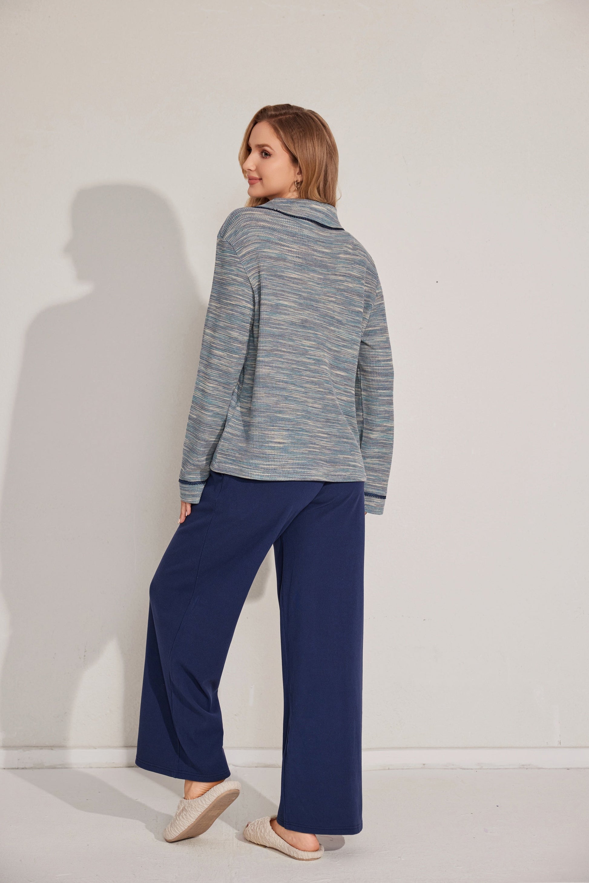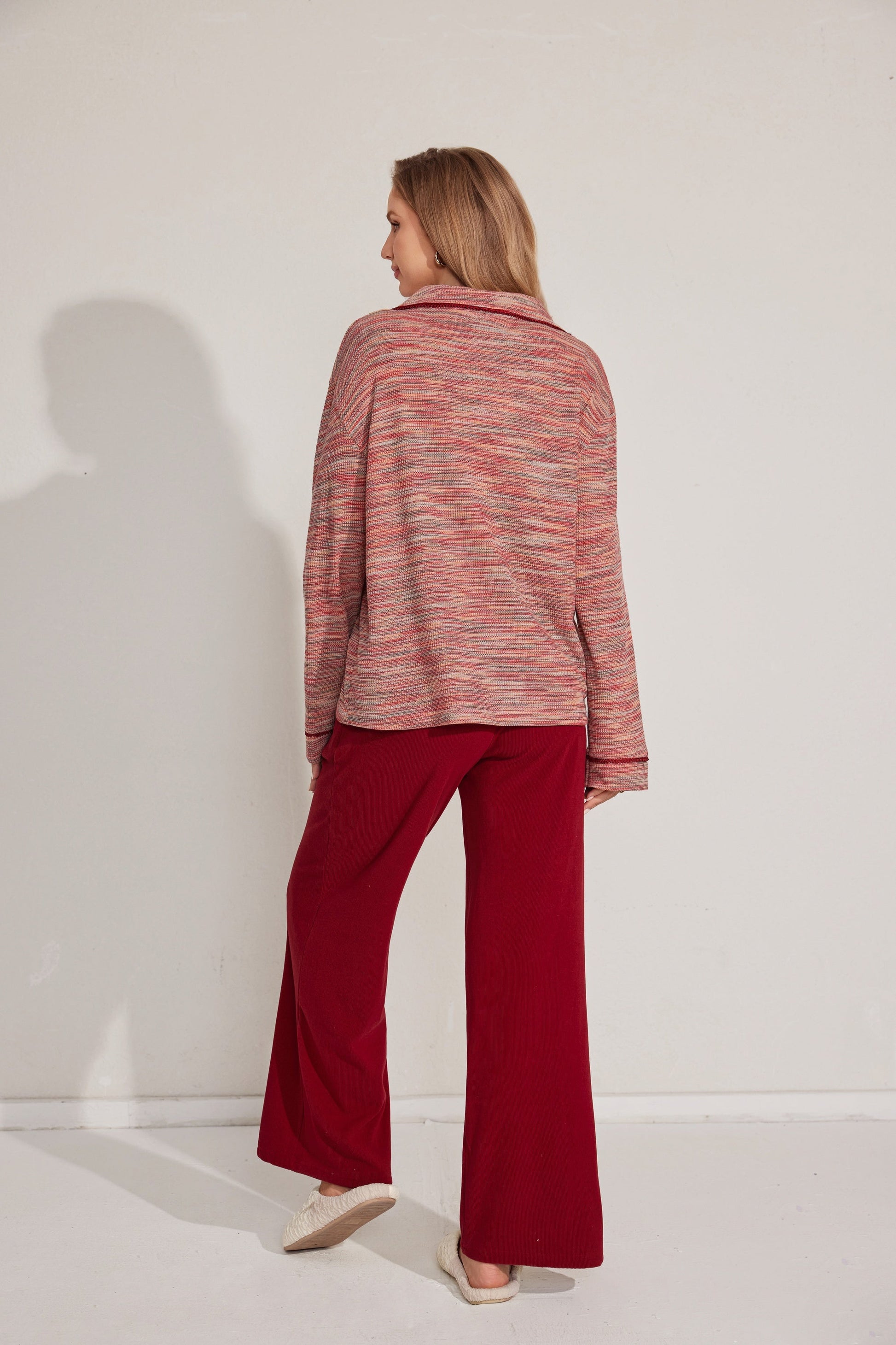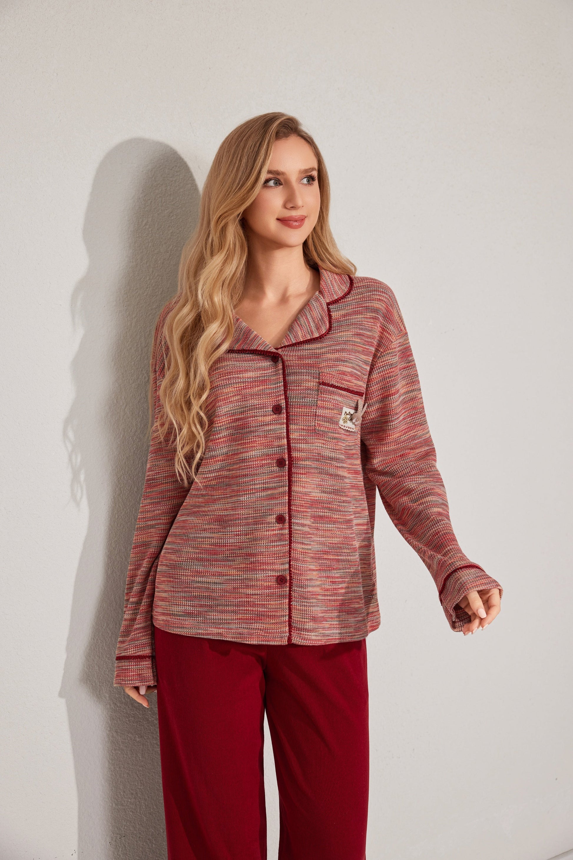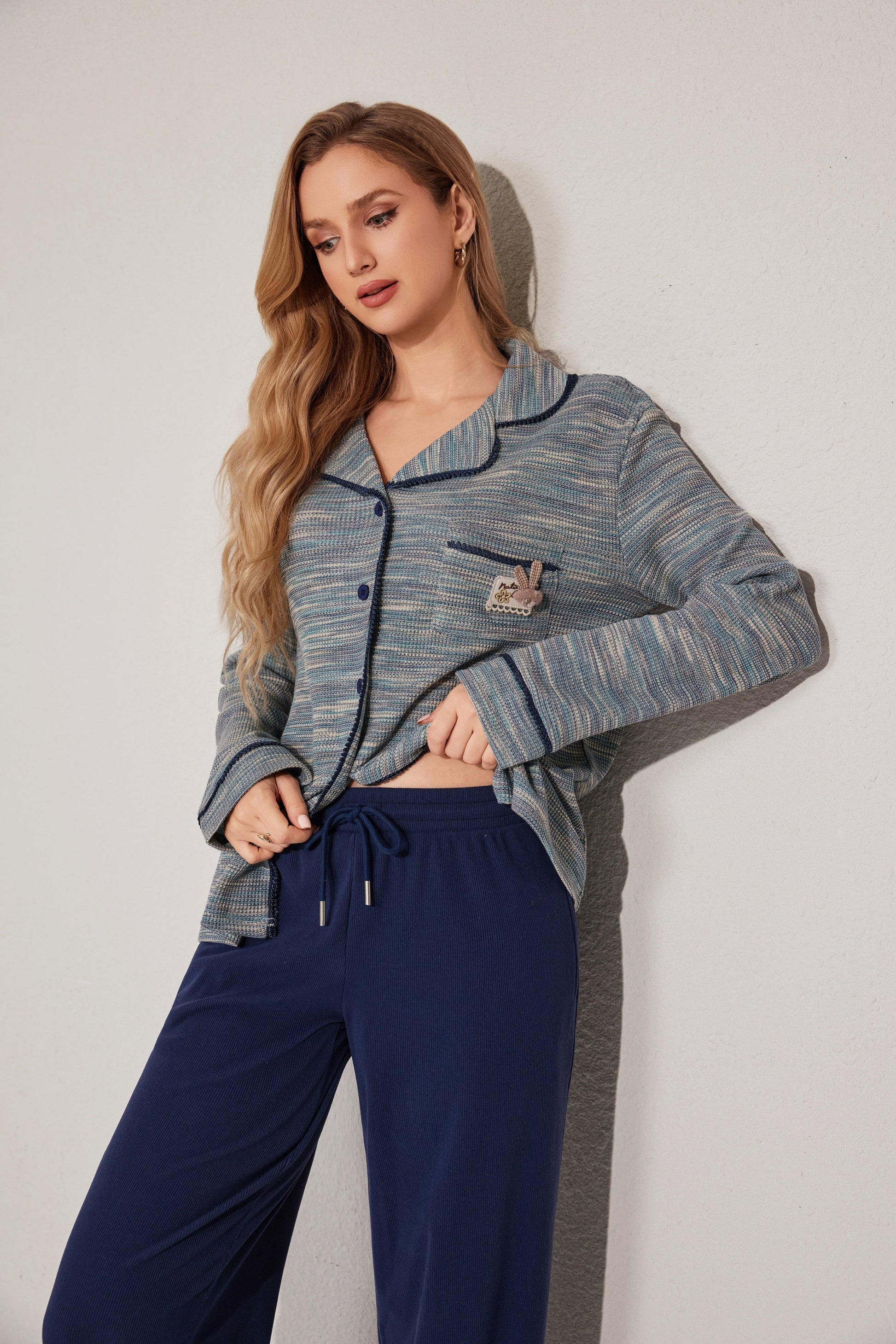 مجموعة بيجاما بأزرار معمقاس لطيف، يتميز بقميص طويل الأكمام وبنطلون مريح. تم تصميمه مع وضع السهولة والدفء في الاعتبار. مصنوع من قماش ناعم.