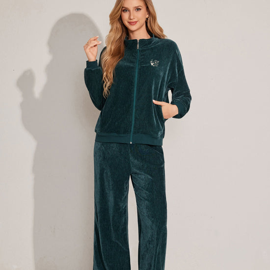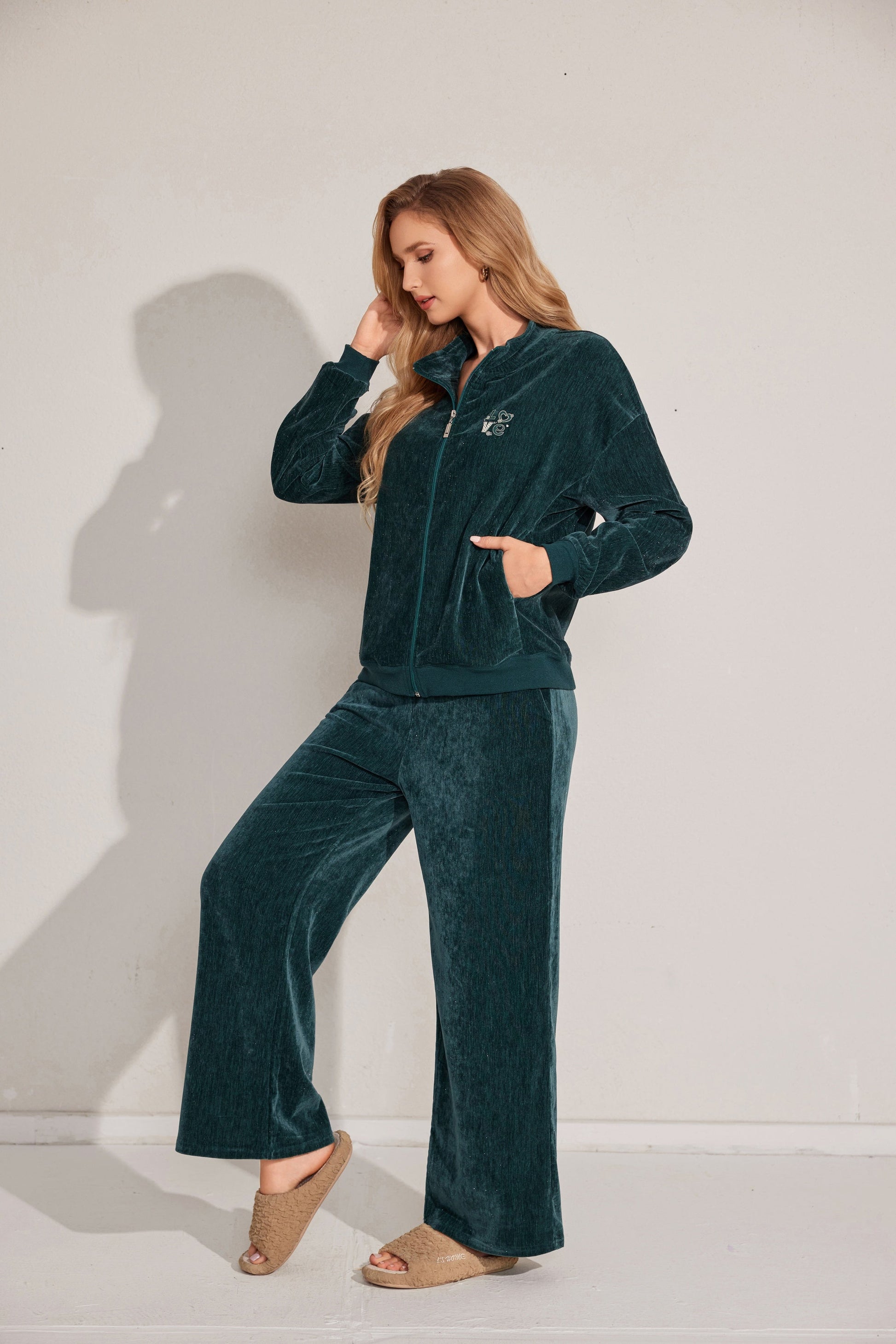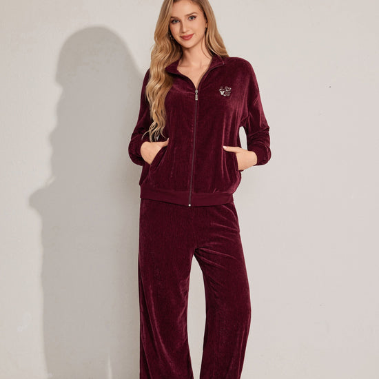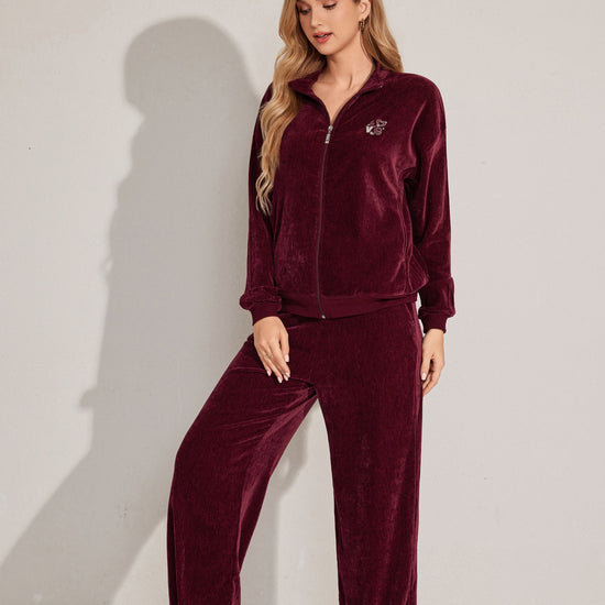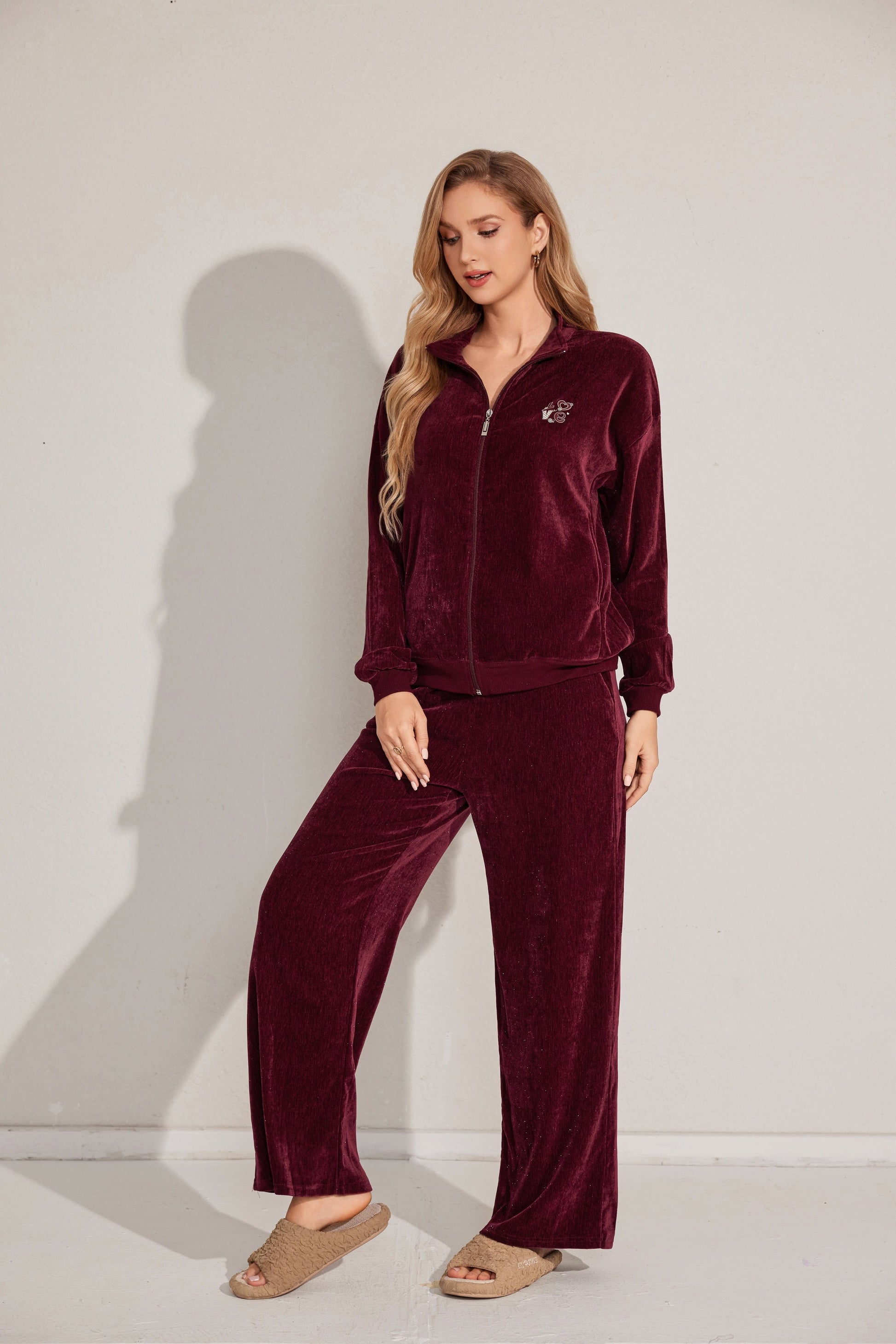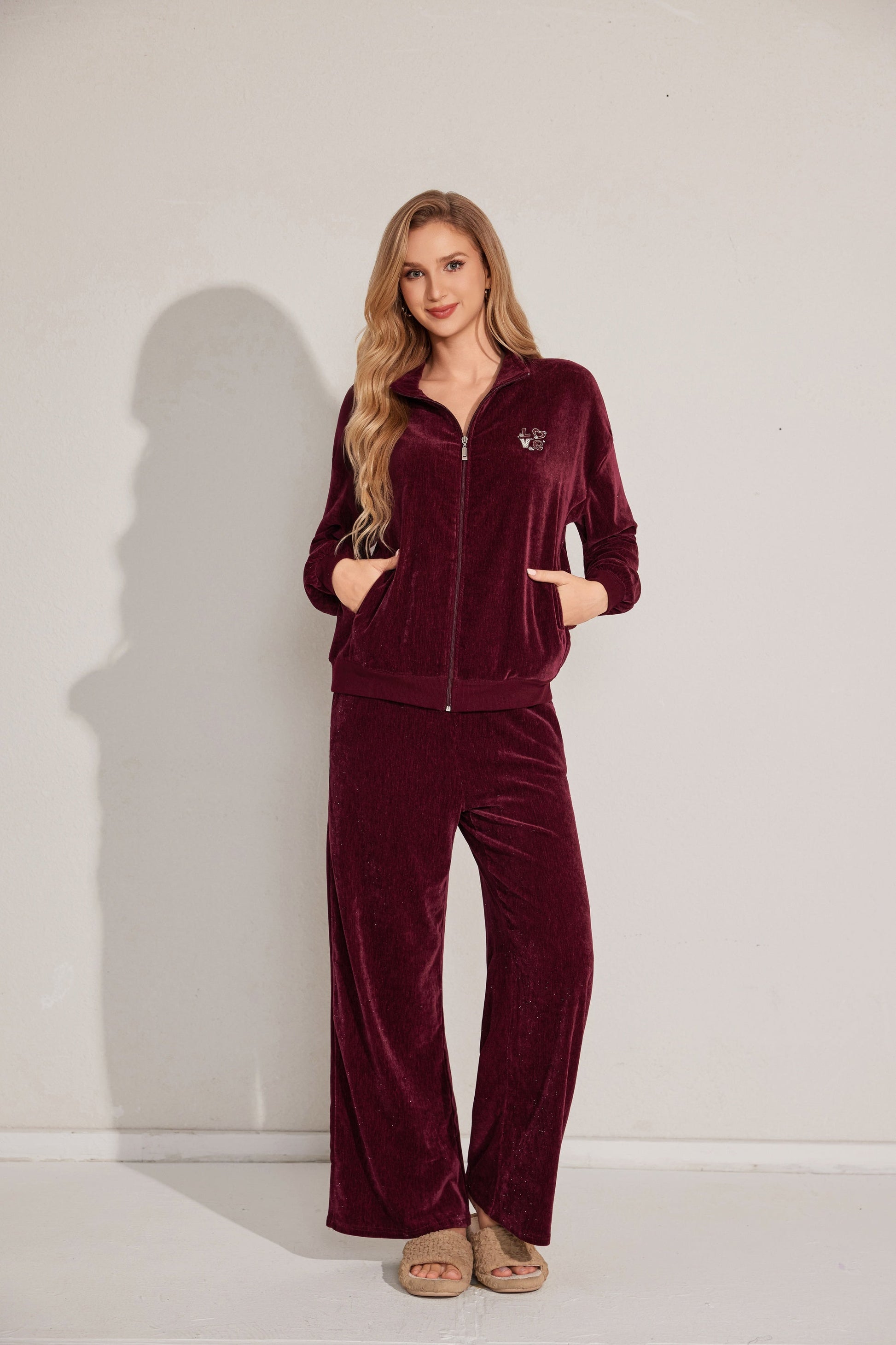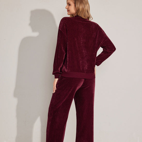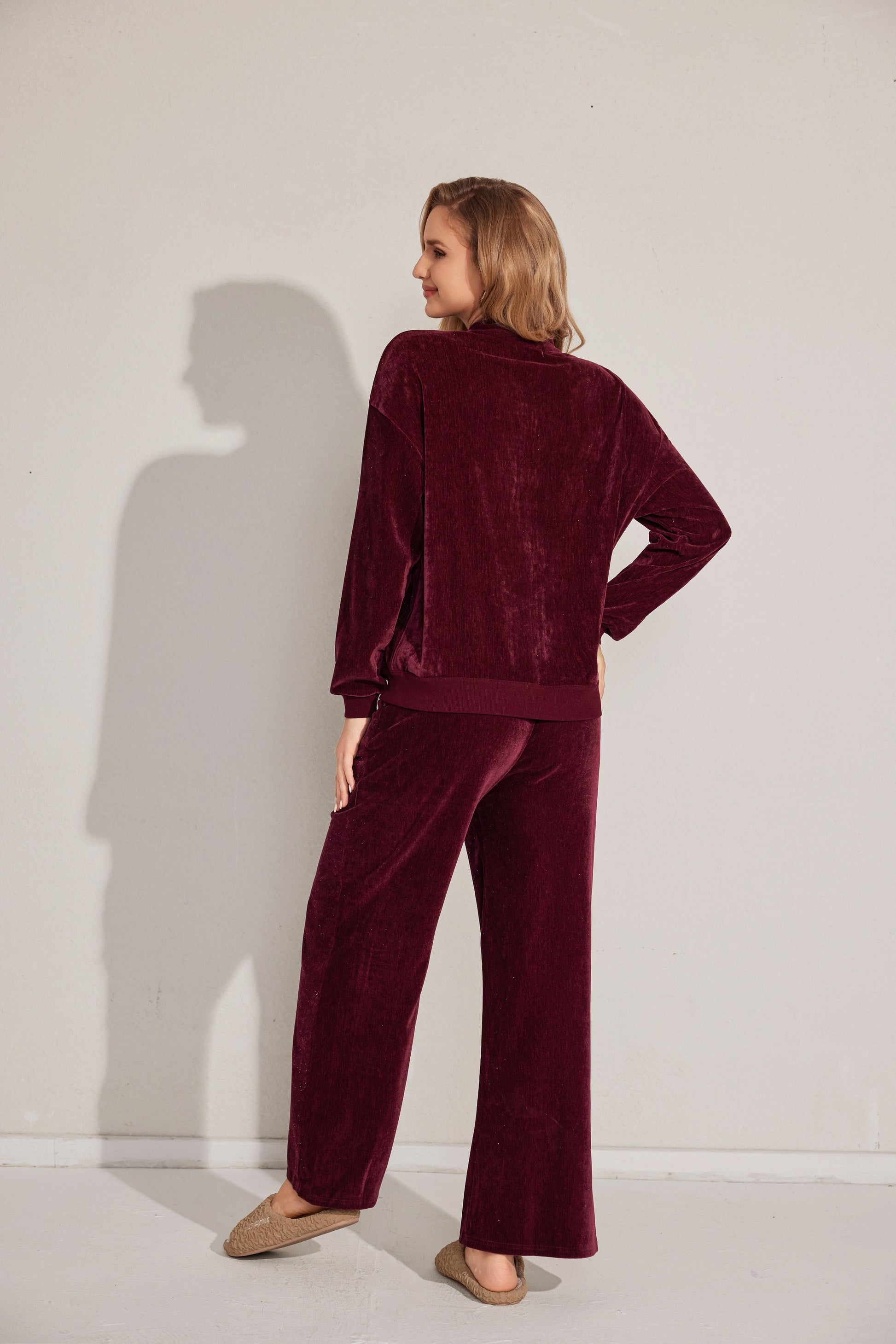 Two-piece pajama set in chic velour-style fabric, soft to the touch and perfect for cooler nights. Includes long-sleeve top and trousers.