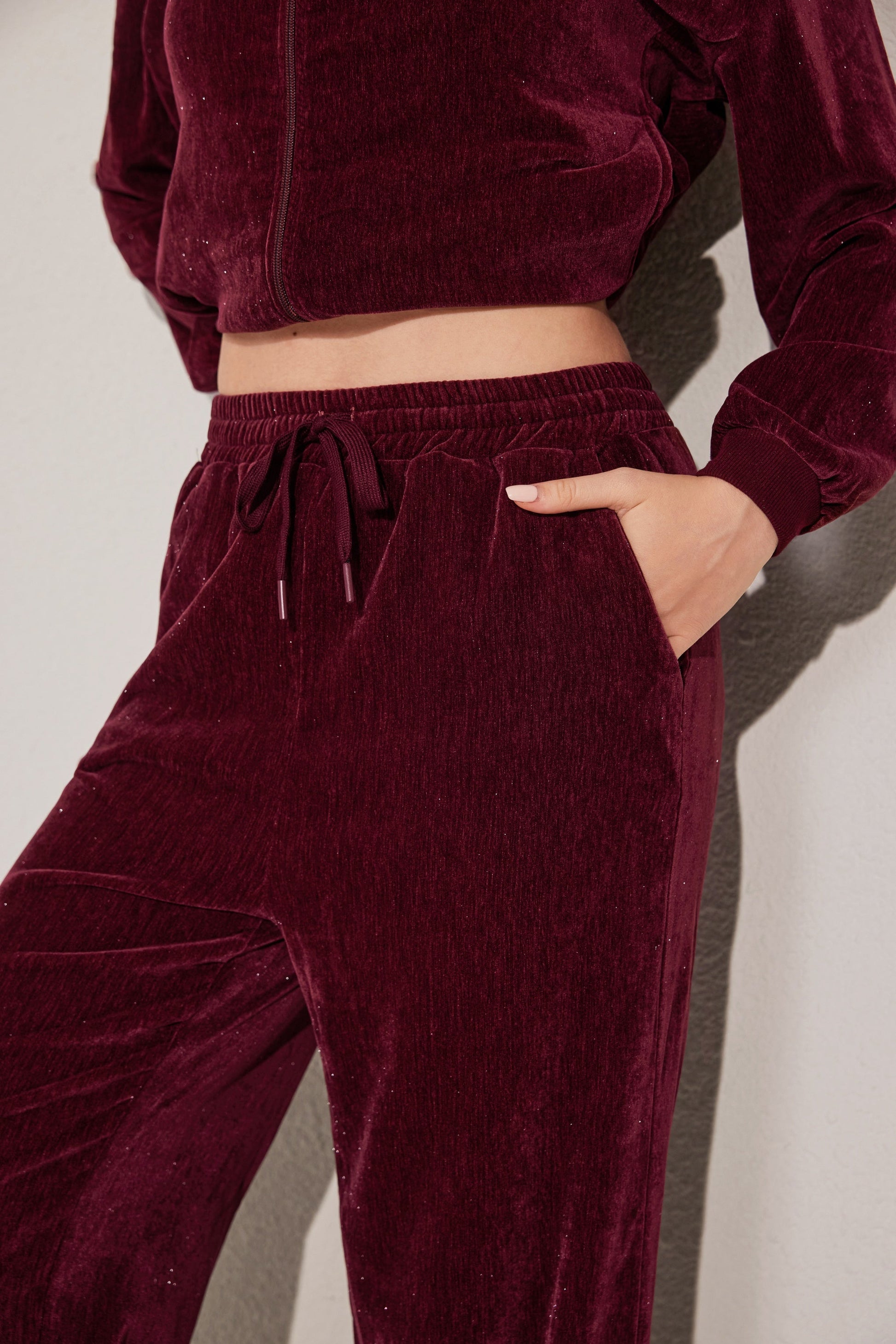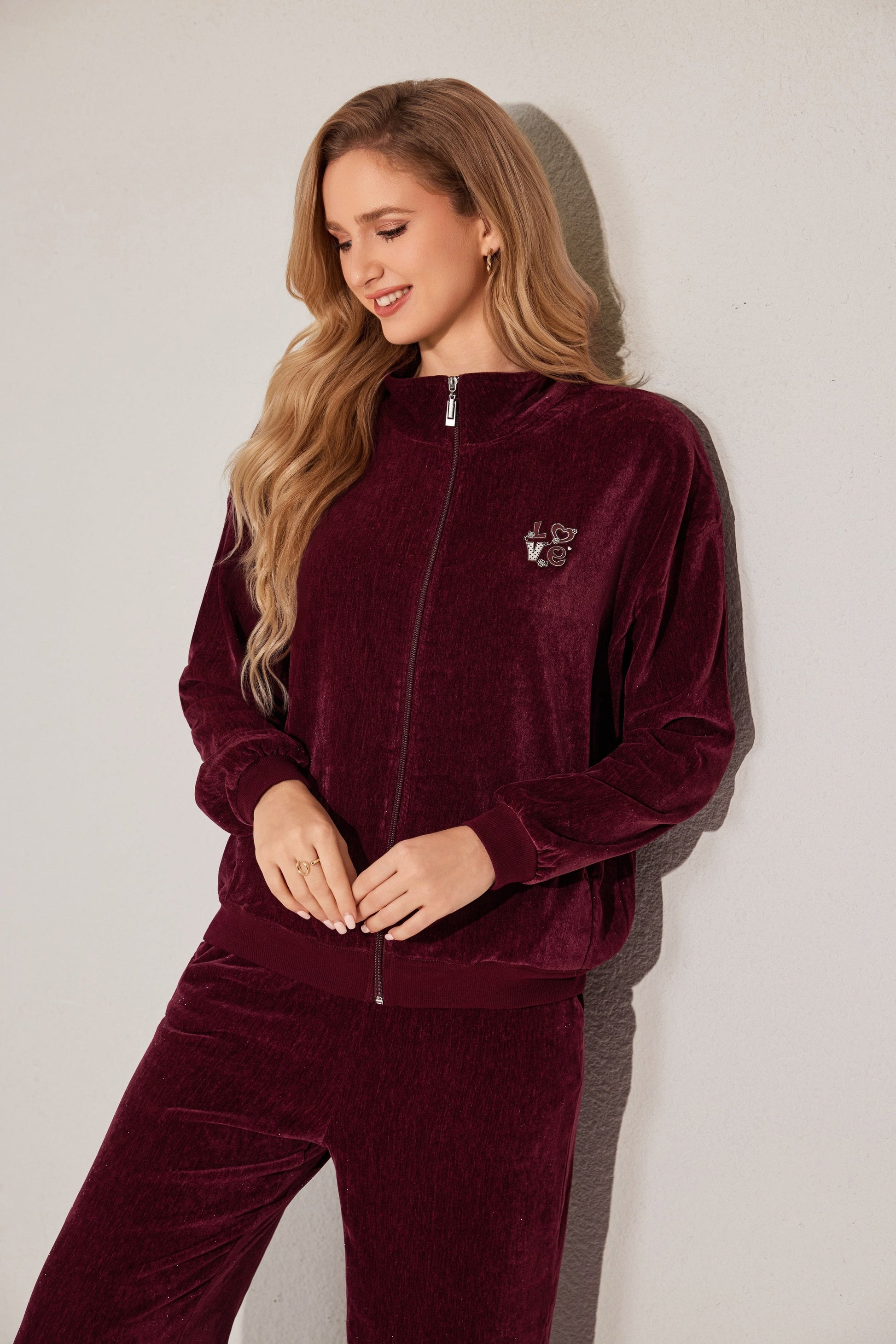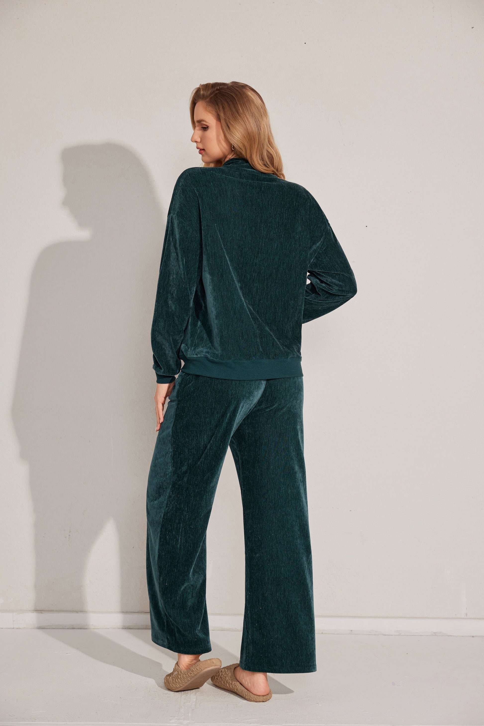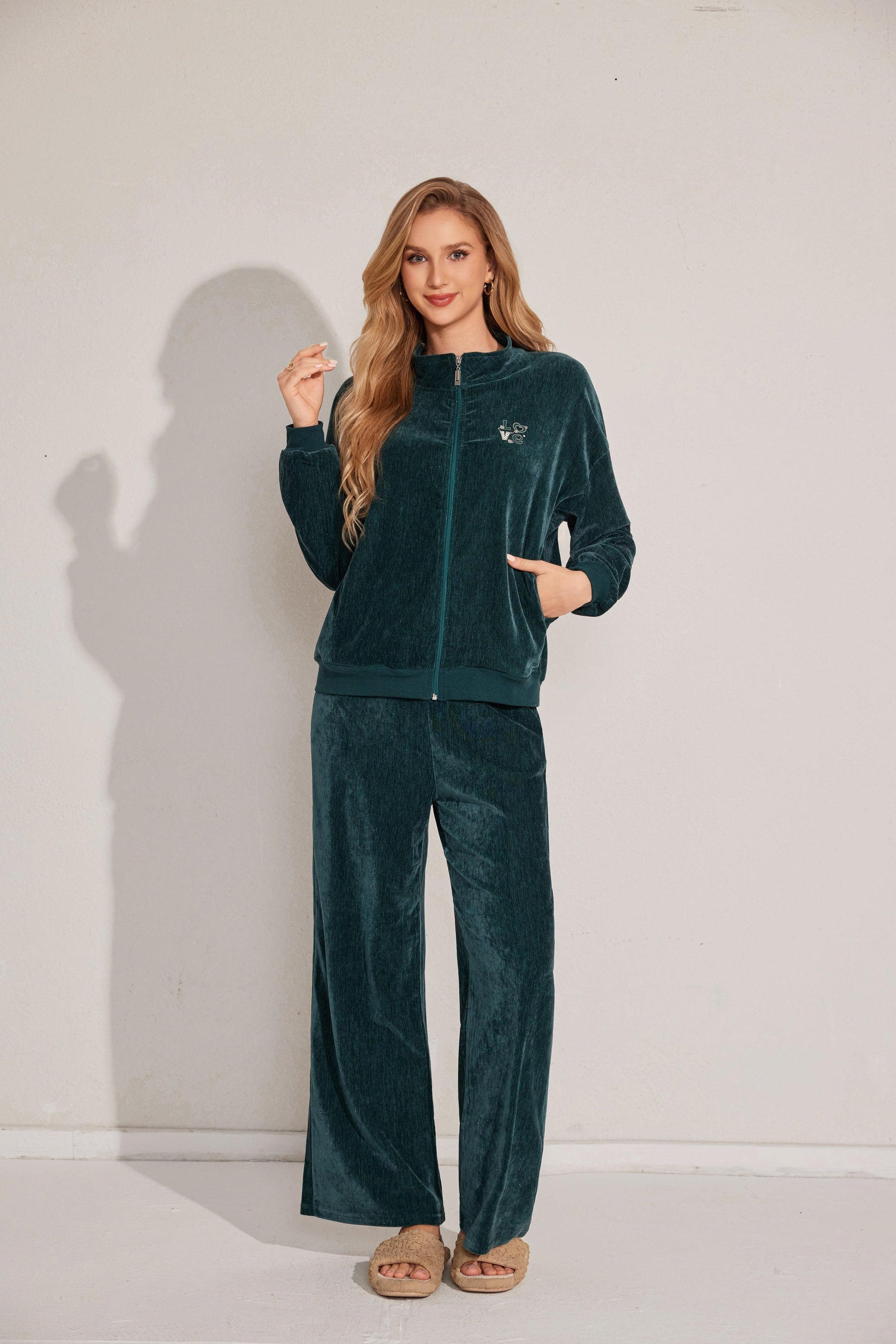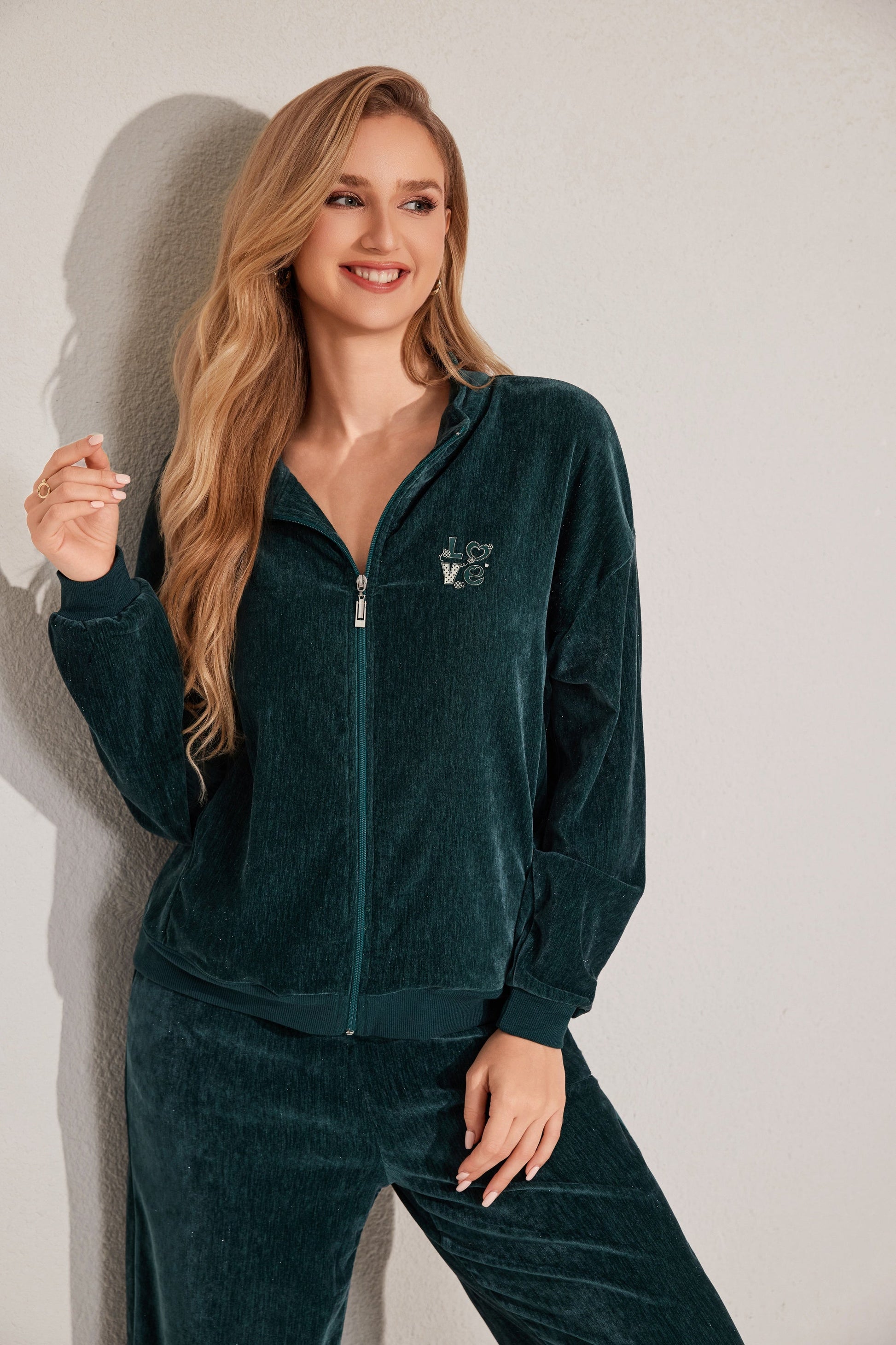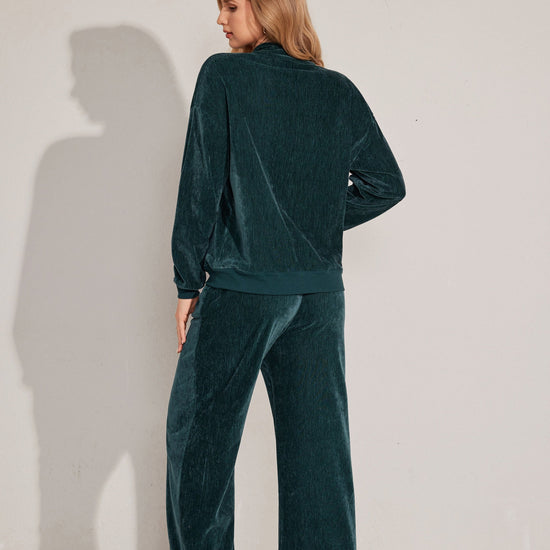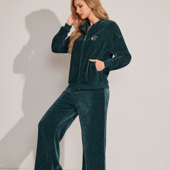 Two-piece pajama set in chic velour-style fabric, soft to the touch and perfect for cooler nights. Includes long-sleeve top and trousers.