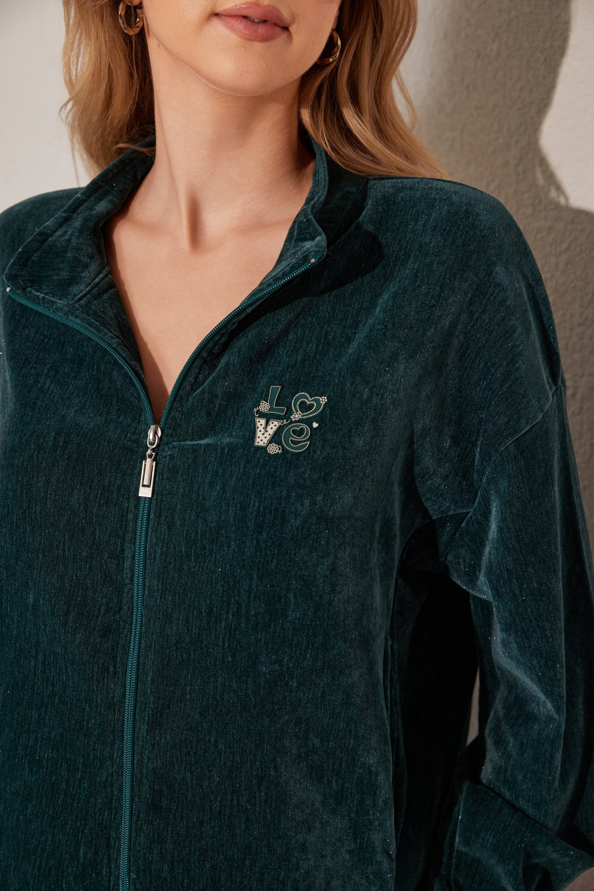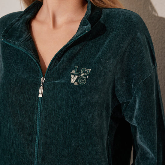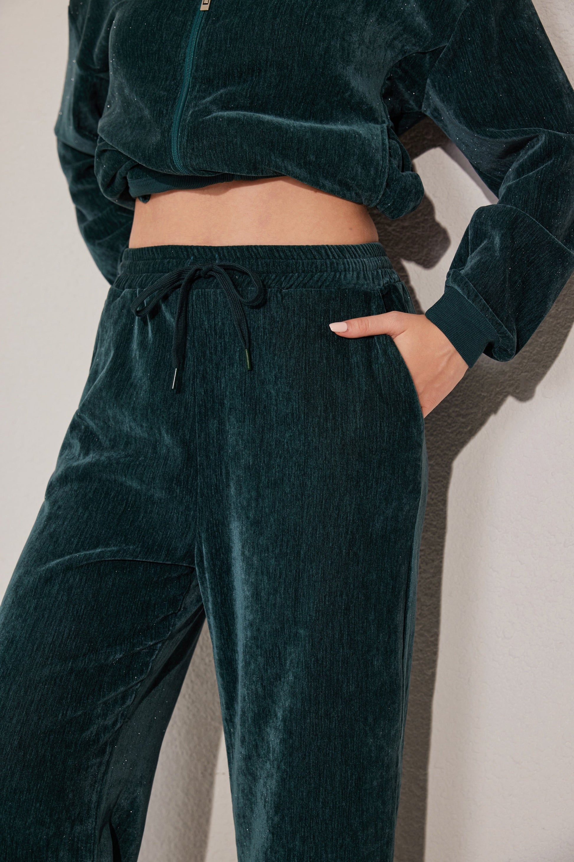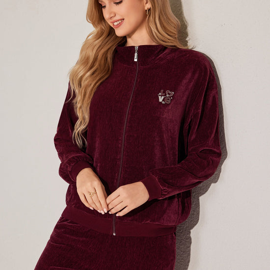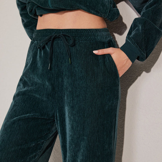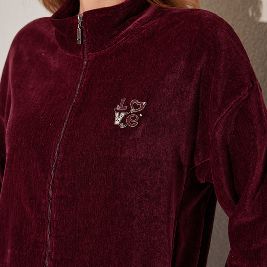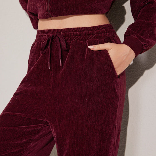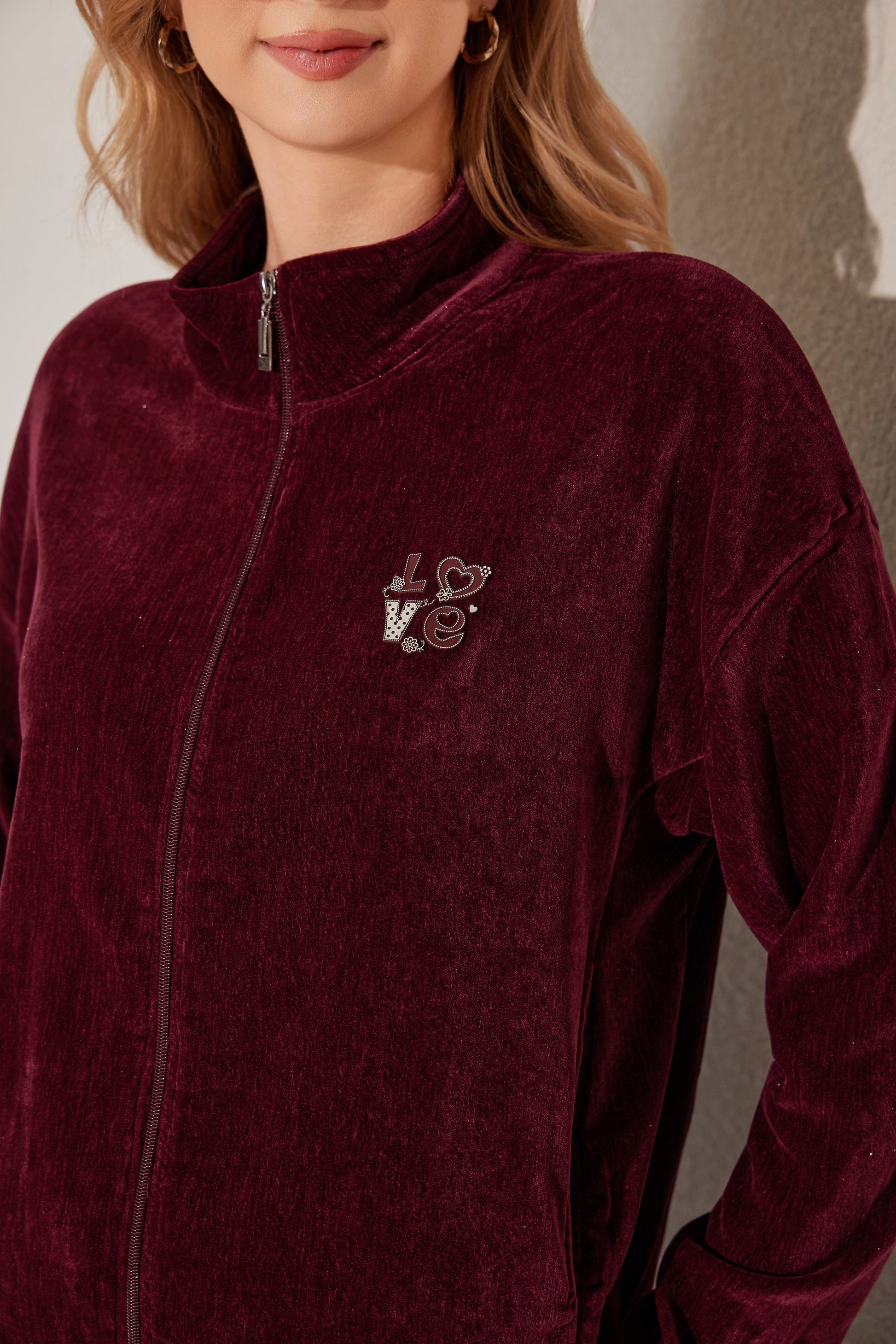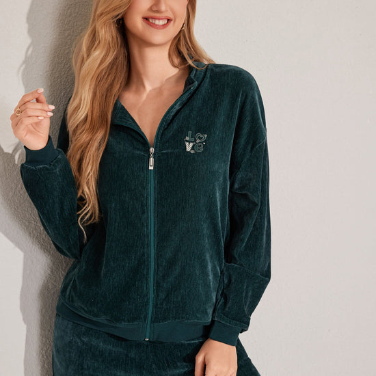 Two-piece pajama set in chic velour-style fabric, soft to the touch and perfect for cooler nights. Includes long-sleeve top and trousers.