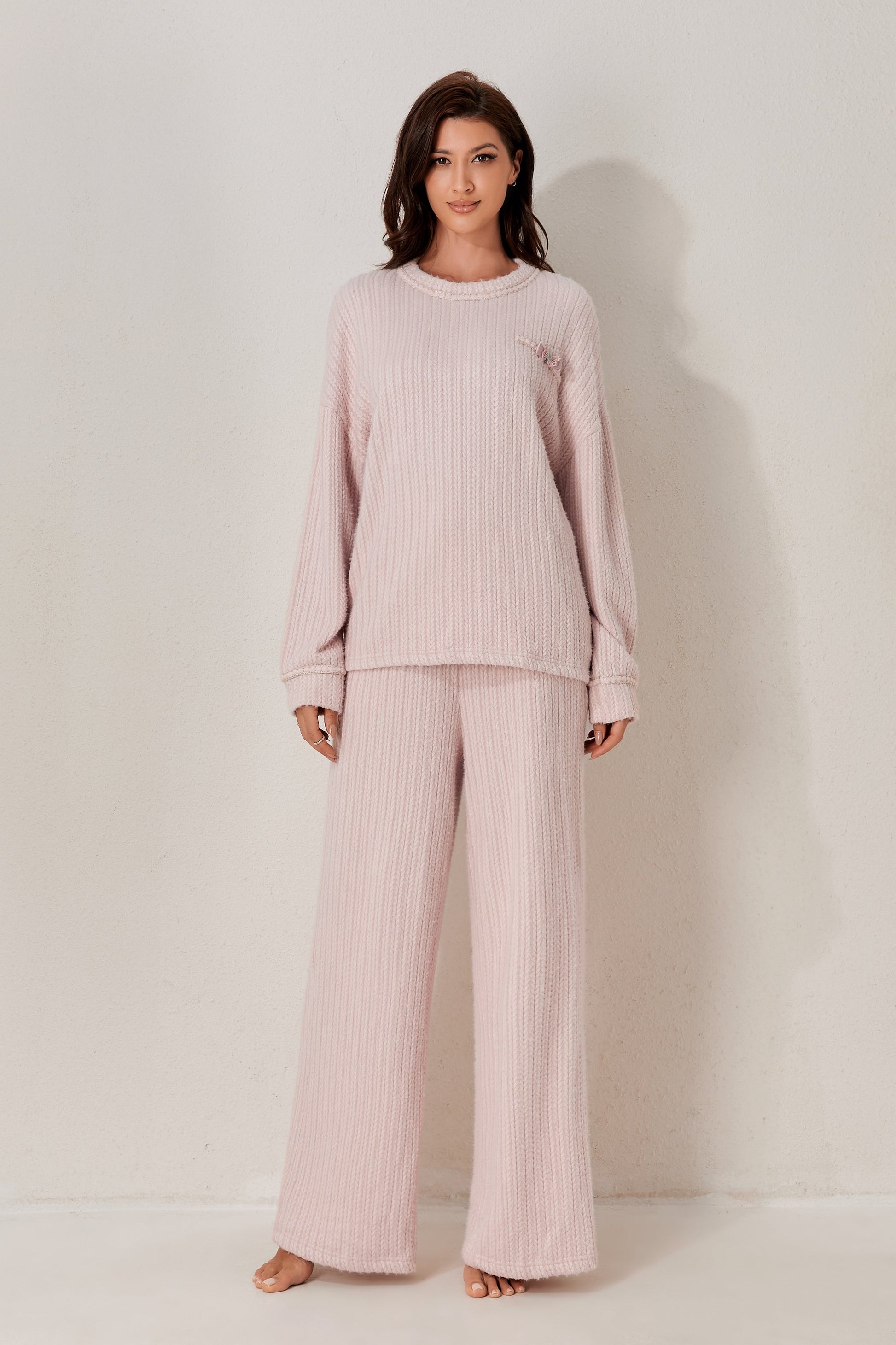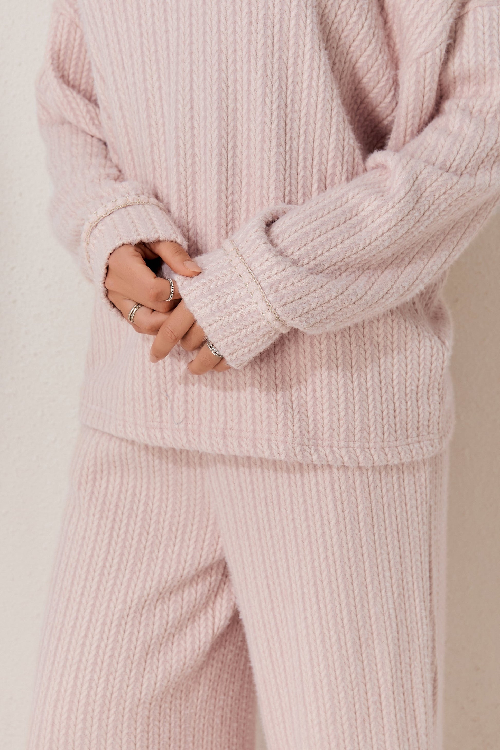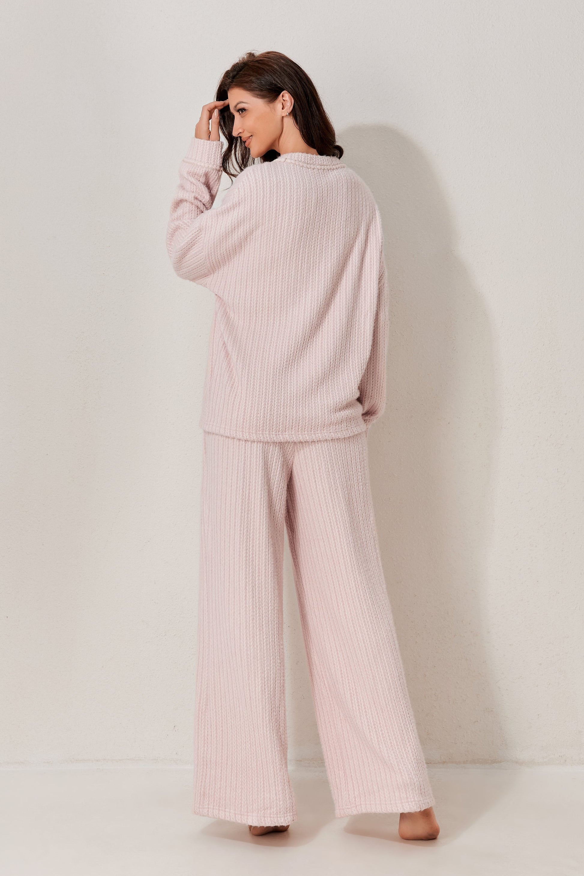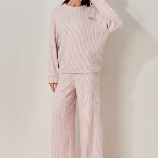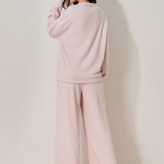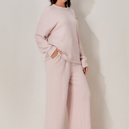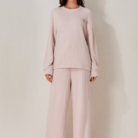 A classic two-piece pyjama set featuring a soft long-sleeved top and relaxed-fit trousers. Clean and minimal design for elevated daily comfort. Made from soft-stock fabric.