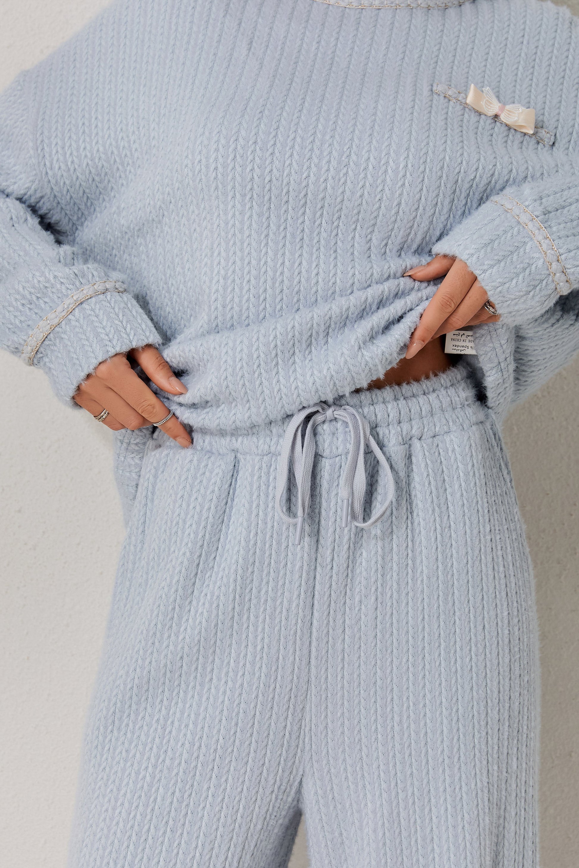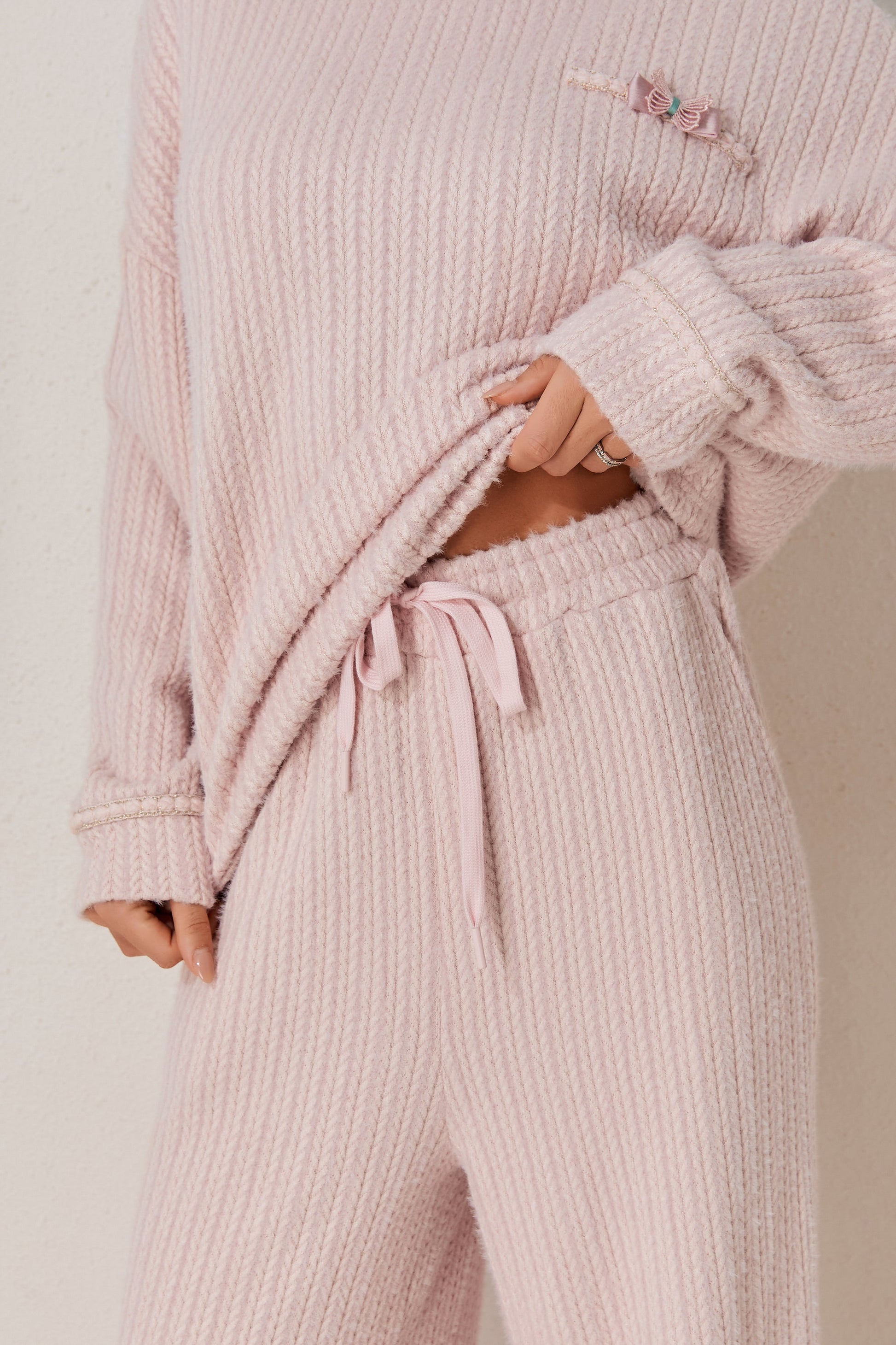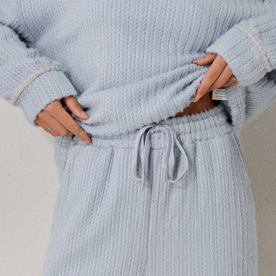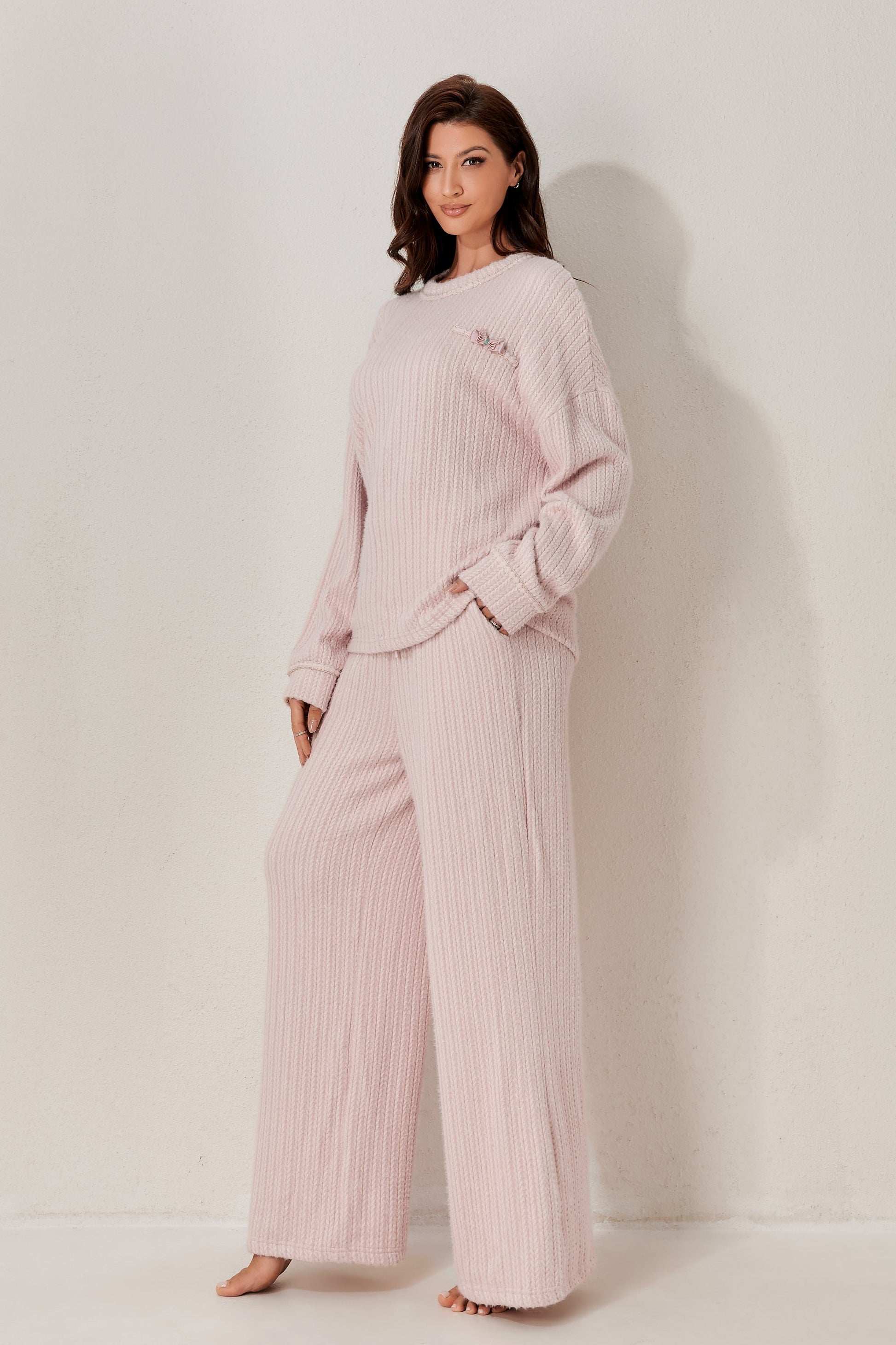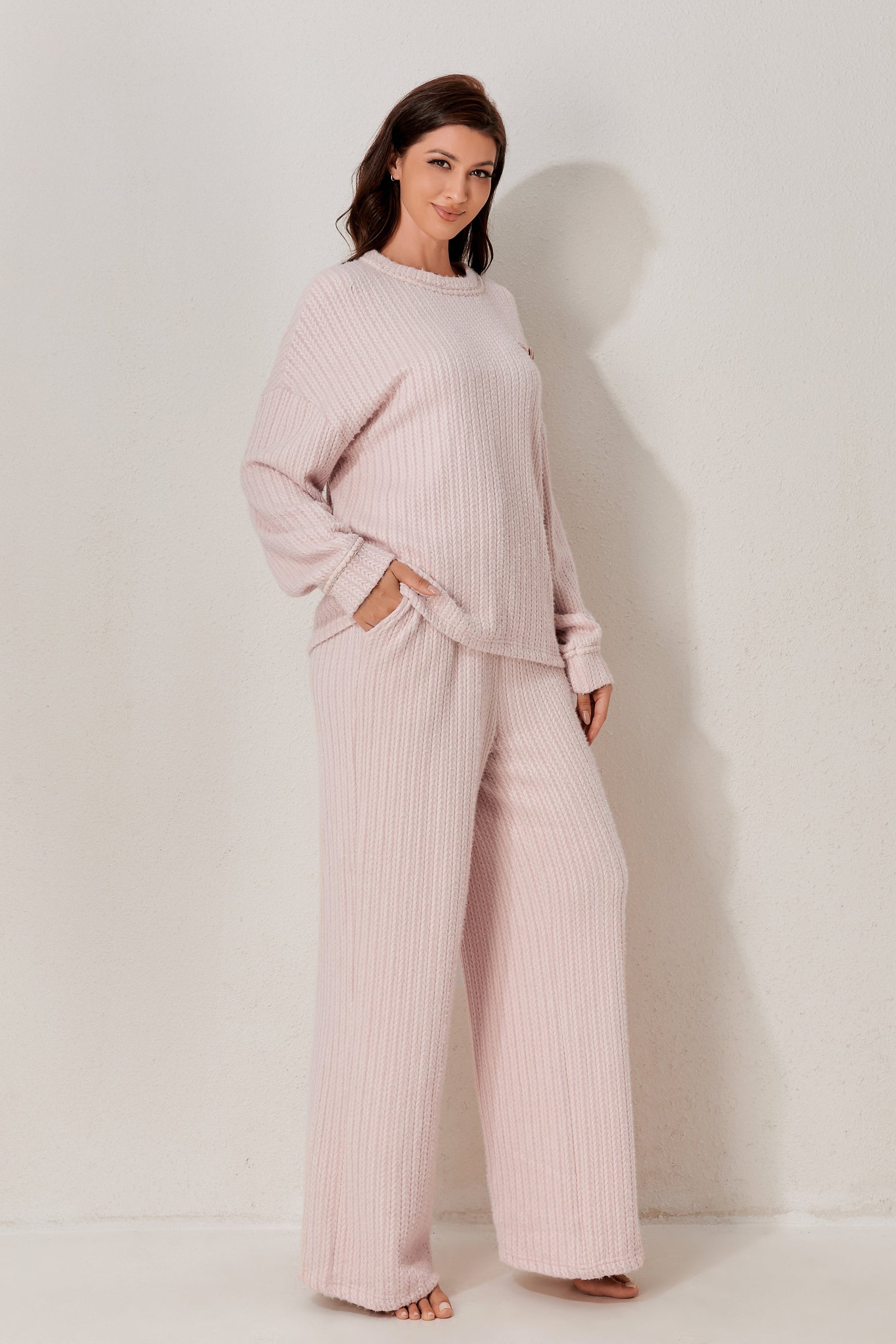 A classic two-piece pyjama set featuring a soft long-sleeved top and relaxed-fit trousers. Clean and minimal design for elevated daily comfort. Made from soft-stock fabric.