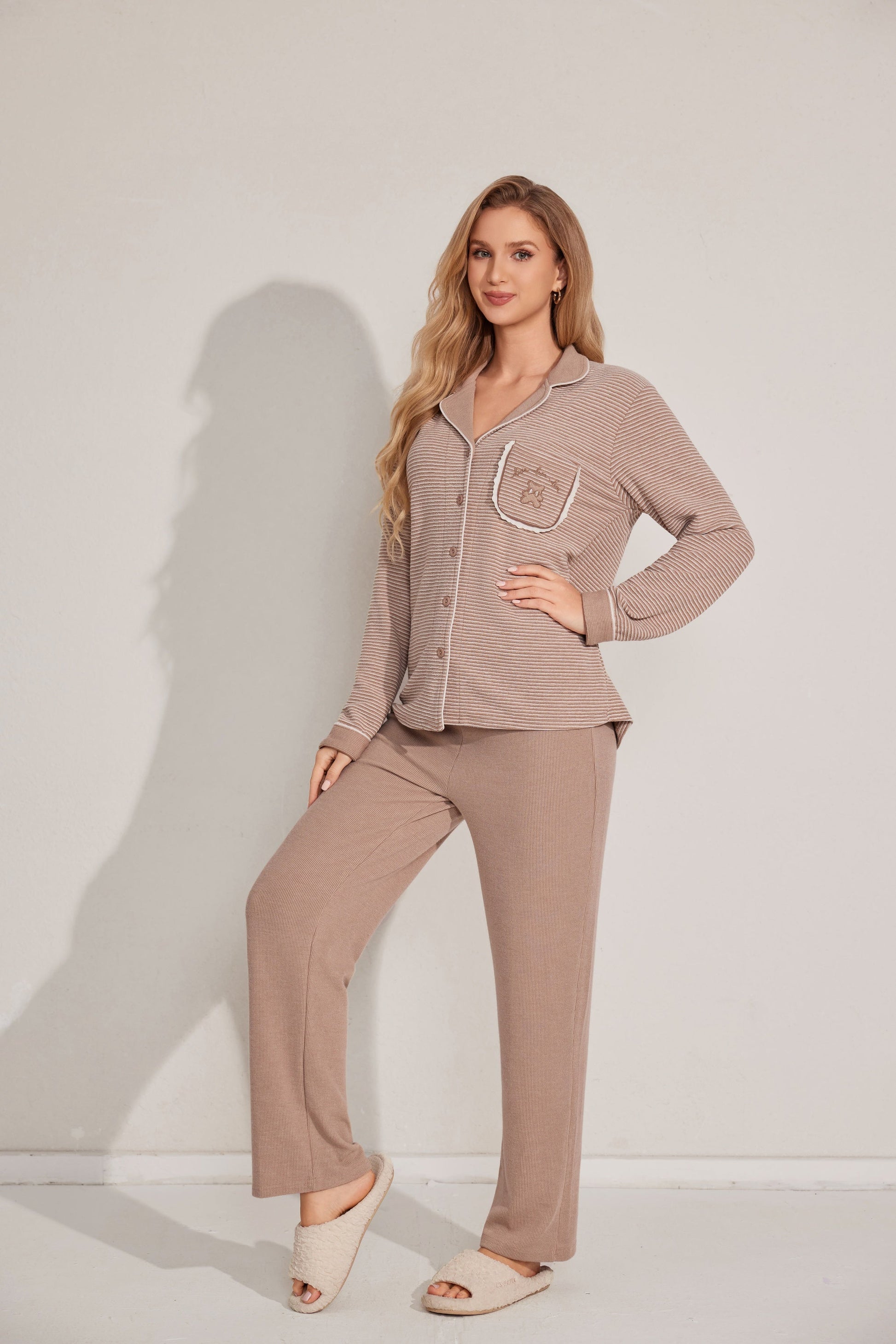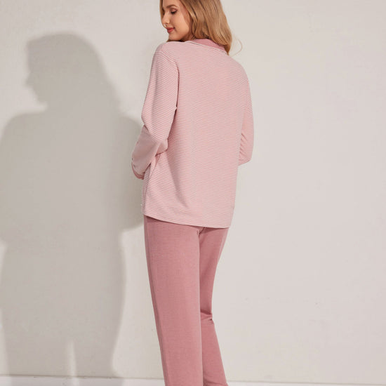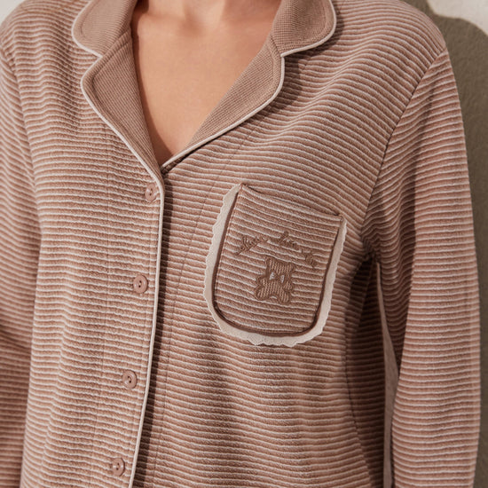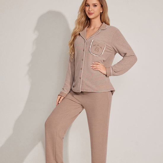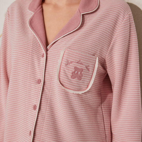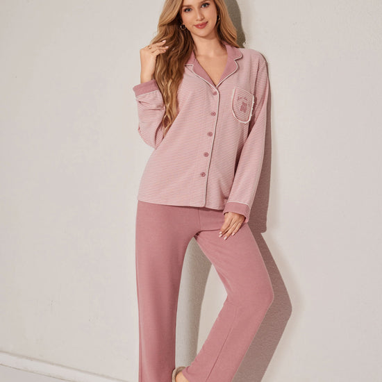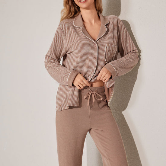 Soft open-style pajama set featuring a button-down top and relaxed-fit pants. A gentle staple for cozy moments. Made with stock fabric.