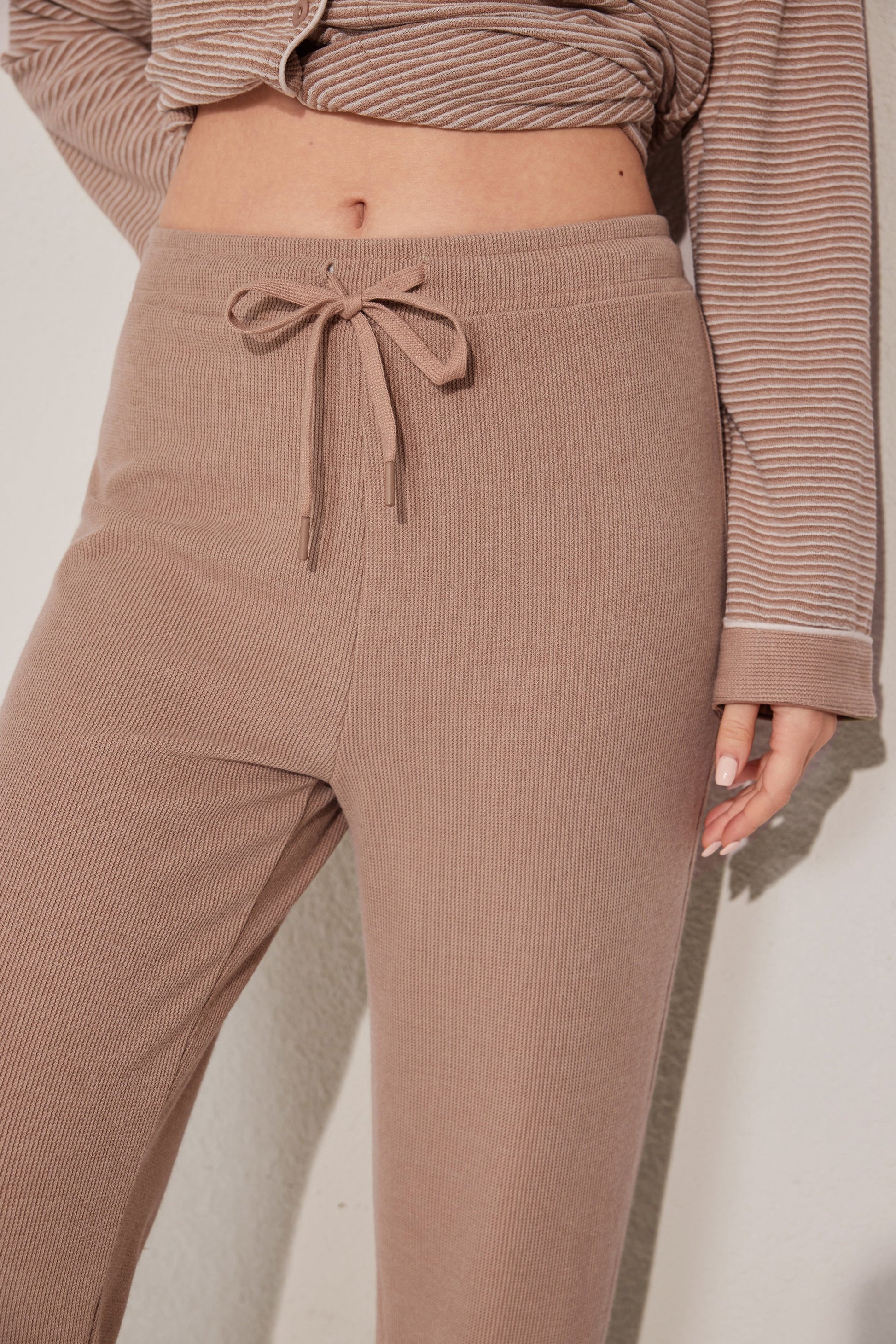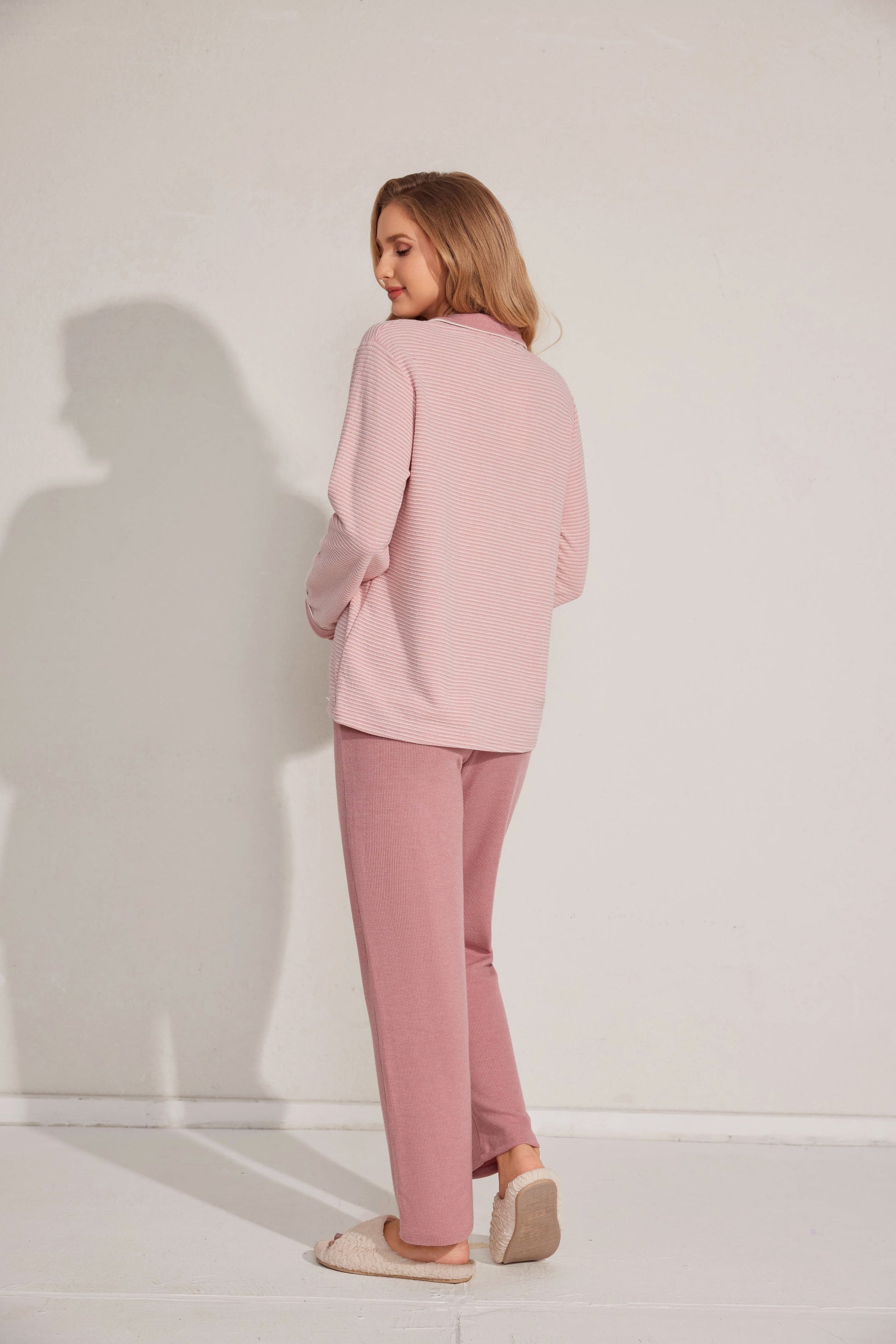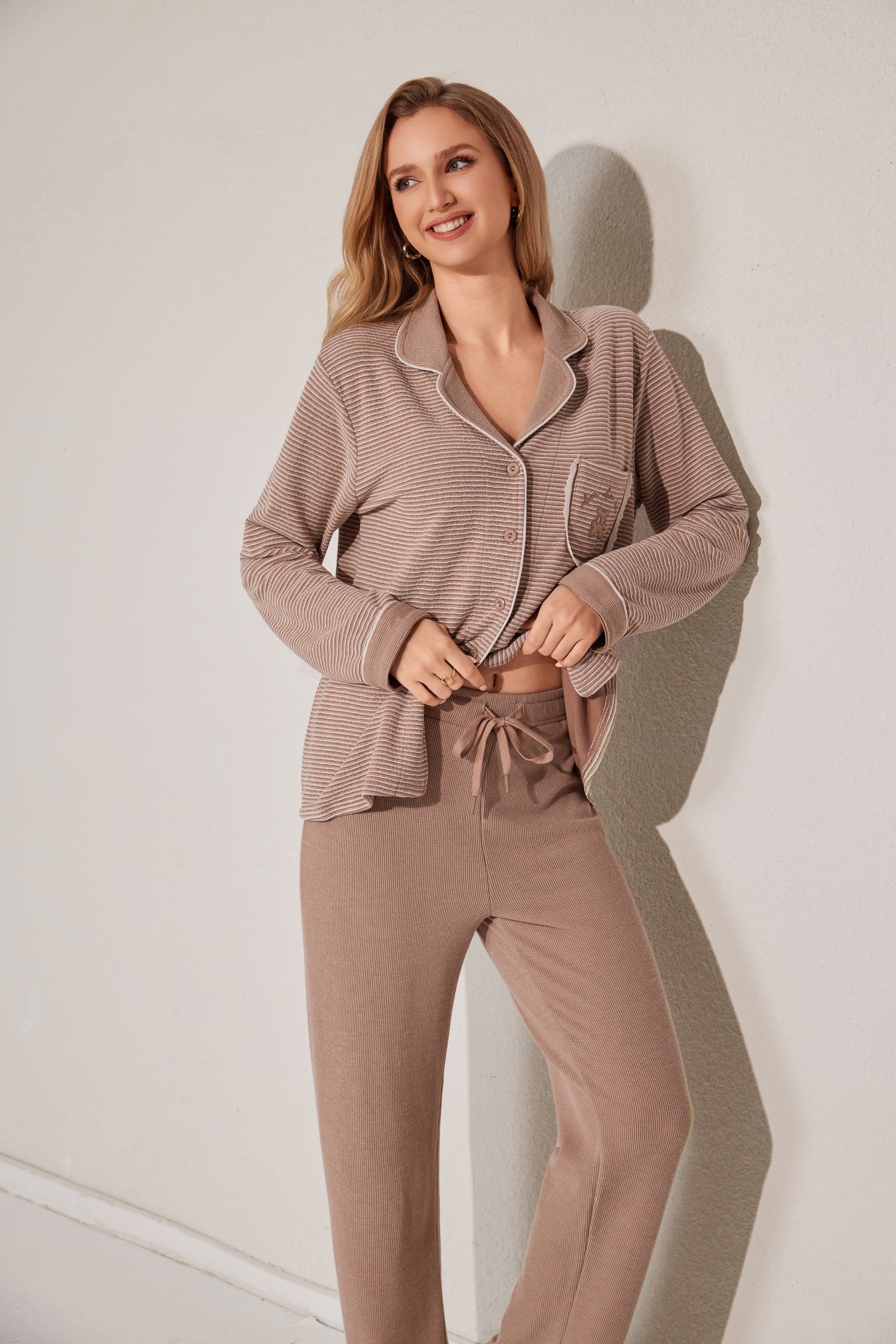 Soft open-style pajama set featuring a button-down top and relaxed-fit pants. A gentle staple for cozy moments. Made with stock fabric.